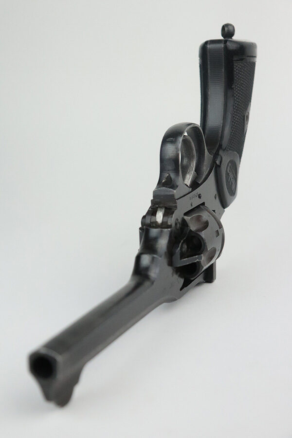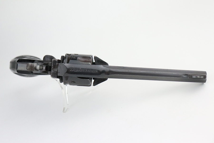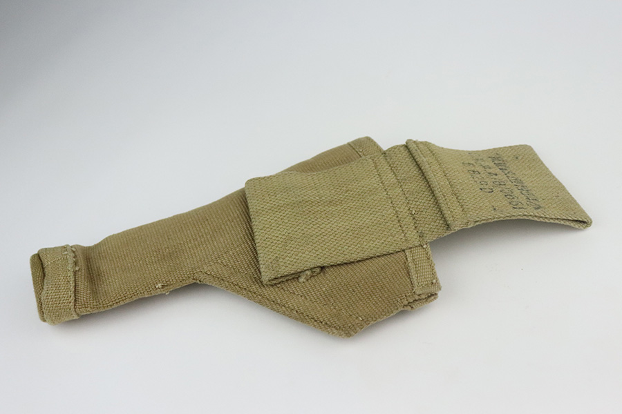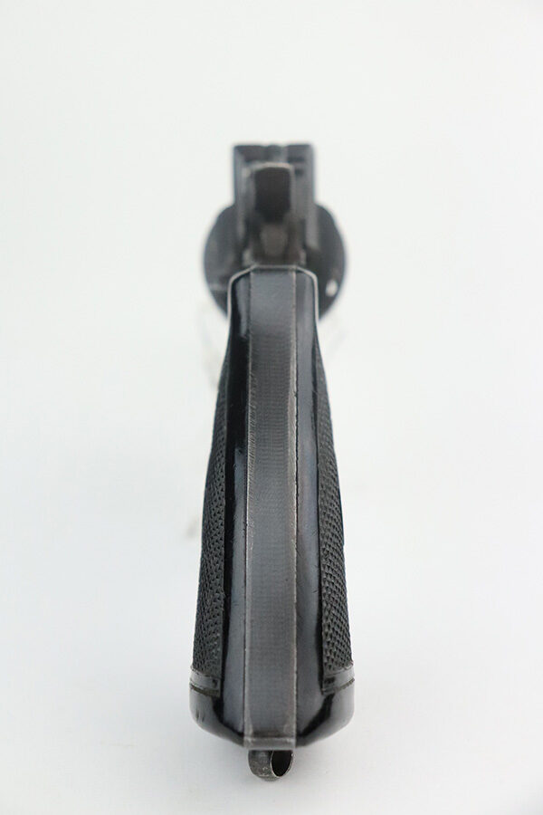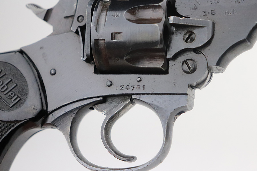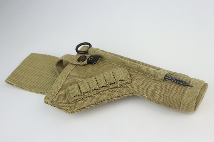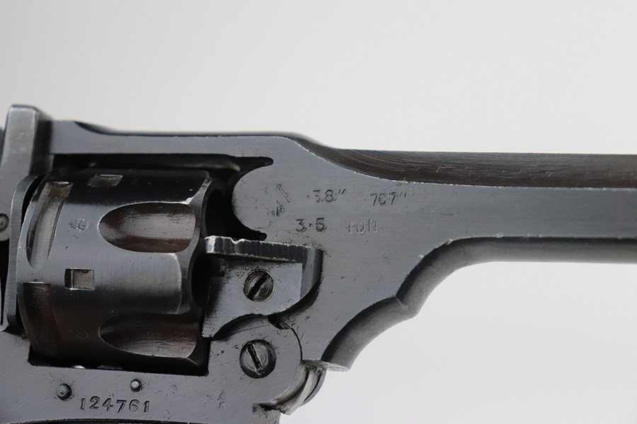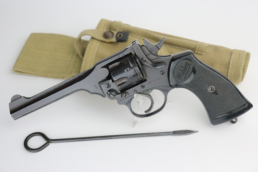 7/12/21 – This is a near-mint example of a Webley Mark IV revolver rig issued to British military in 1944. The gun is all matching and has the proper British proofs. It comes with an excellent canvas holster and an original cleaning rod. The gun has retained about 98% of its wartime finish with just hints of wear on the high edges. There isn’t even a visible roll mark on the cylinder. The cylinder is tight and the action is smooth. Excellent black bakelite grips. The bore is shiny and minty.