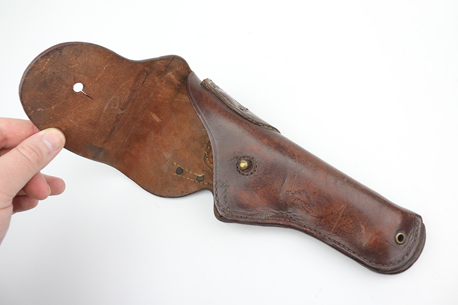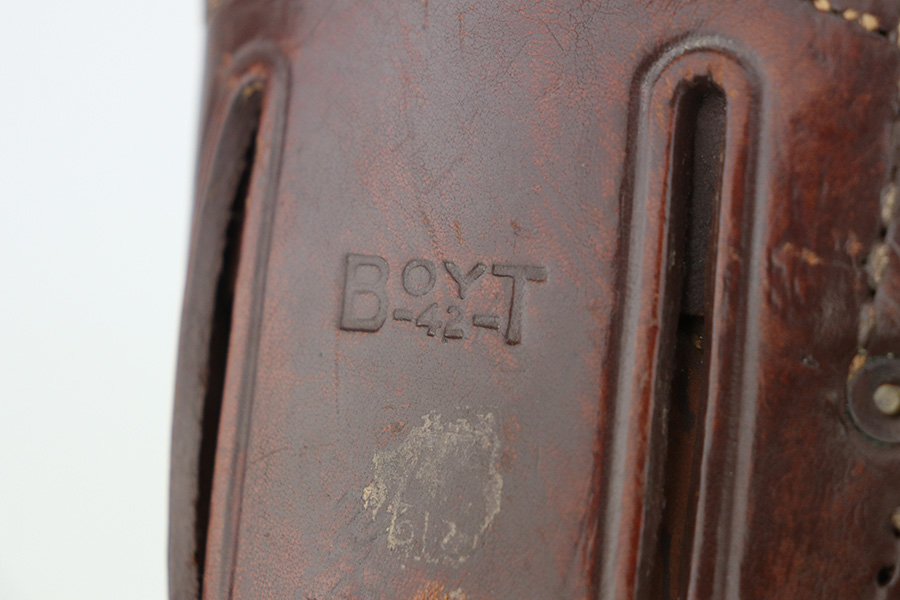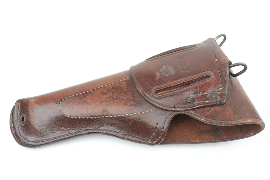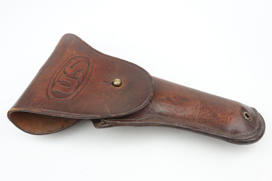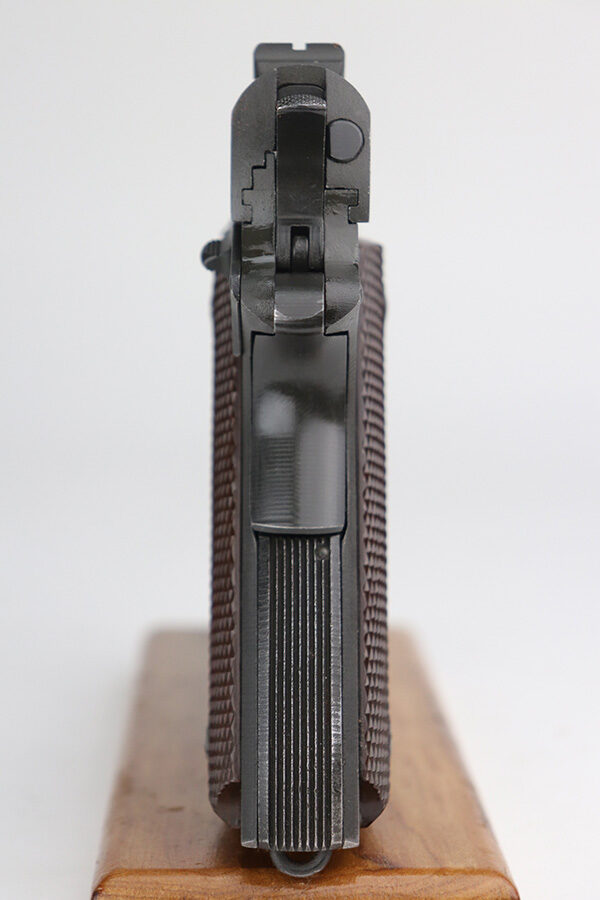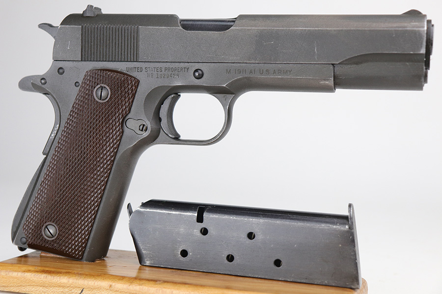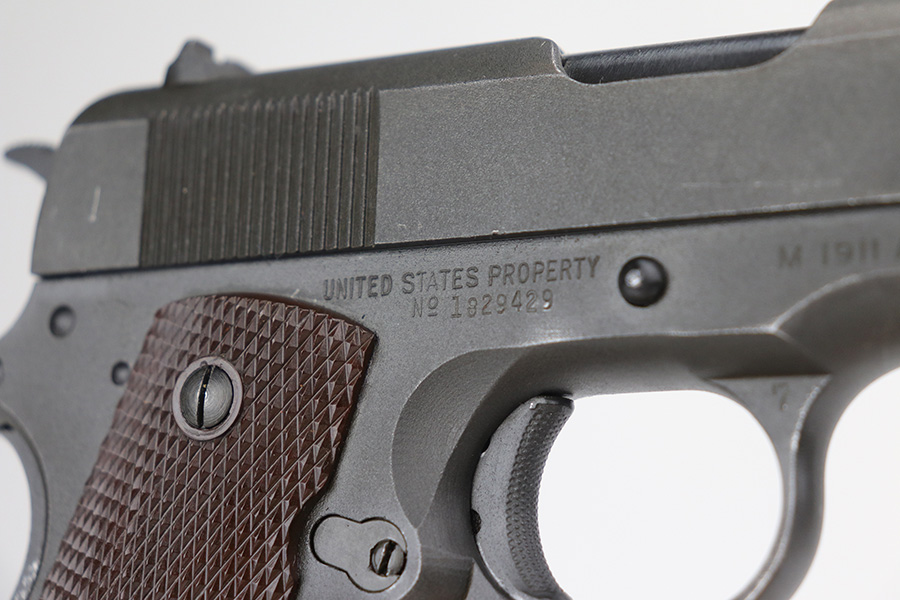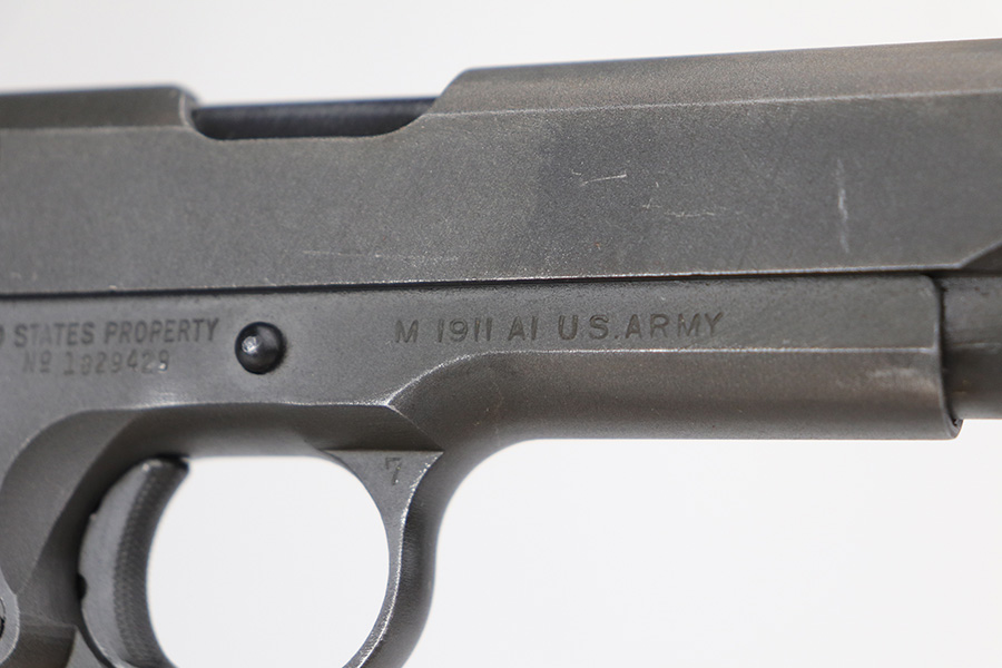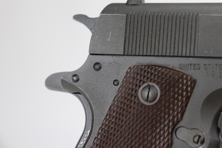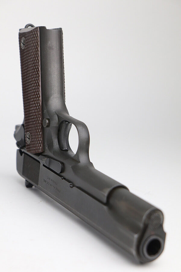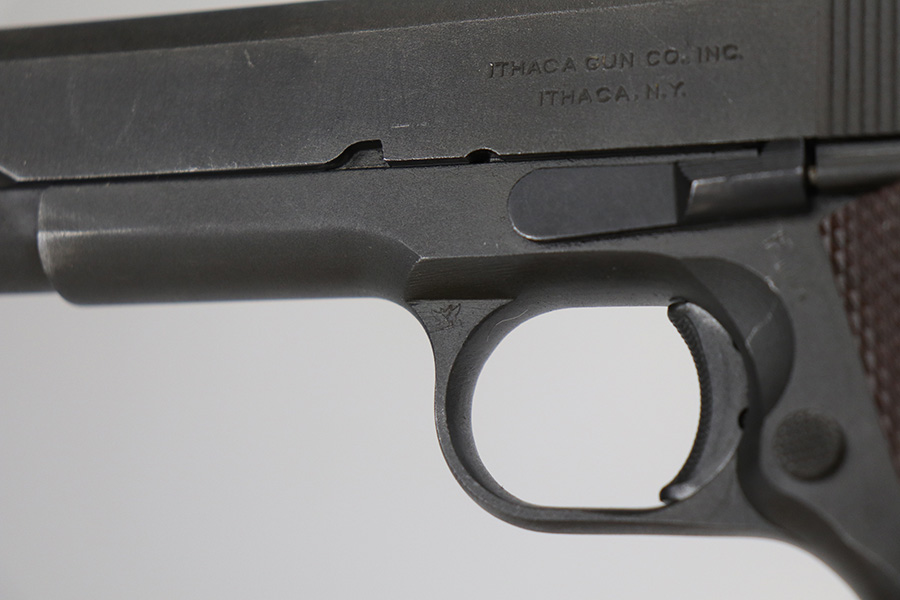 10/26/21 – This is a minty example of Ithaca Model 1911A1 issued to the US military in 1945. It has the proper “FJA” inspector proofs, cross-canon military cartouche at the back of the right side of the frame, and is properly “United States Property” marked. It also has a proper Flannery barrel. It comes as a rig with a period-correct L-marked magazine and a nice 1942-dated tan leather holster. The gun has retained about 97% of its original parkerized finish. There is just very minor wear around the high edges and around the muzzle. Some very light thinning and a couple of small dots of oxidation on the front strap. Some discoloration on the right side of the slide. There is a very light scratch on the left side of the frame from the take down lever and a few very light scuffs on the right side of the slide. Comes with excellent grips. The bore has good rifling with areas of minor freckling here and there.