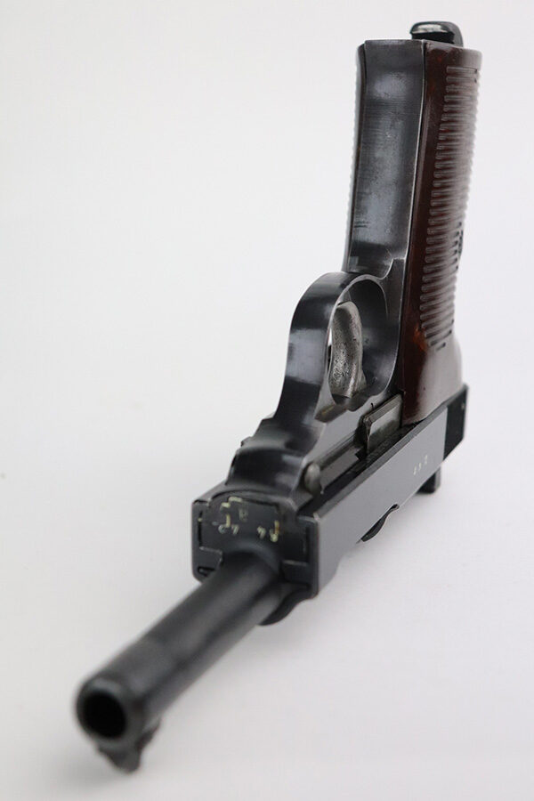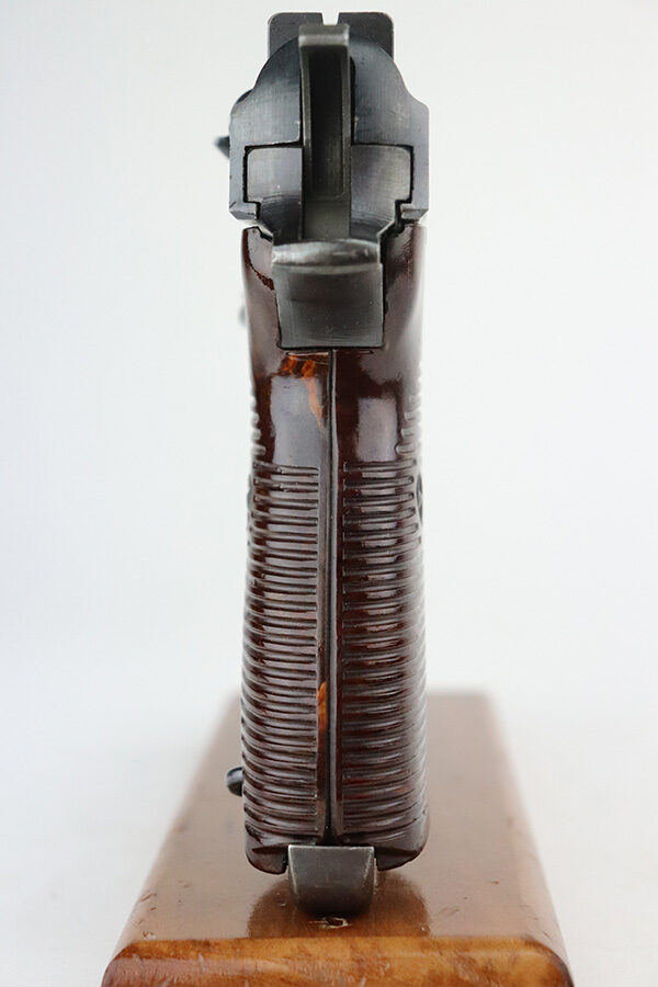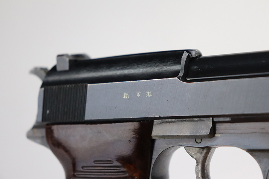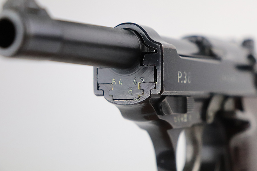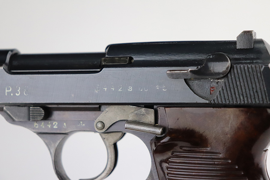 3/22/23 – This is a minty example of a Walther P.38 issued to the Nazi military in 1945. It is all matching and has the proper “Eagle 359” military proofs. It has late features such as the cog hammer and phosphate small parts. It has retained about 97-98% of its original finish. There are just hints of wear around the high edges and on the front strap. Spots of light oxidation here and there, most noticeable on the front strap. Comes with excellent grips and a period-correct Walther magazine. Excellent bore – shiny with strong rifling. De-cocker is functional.