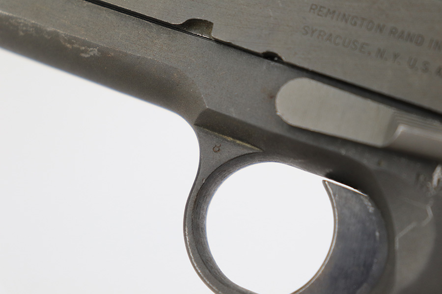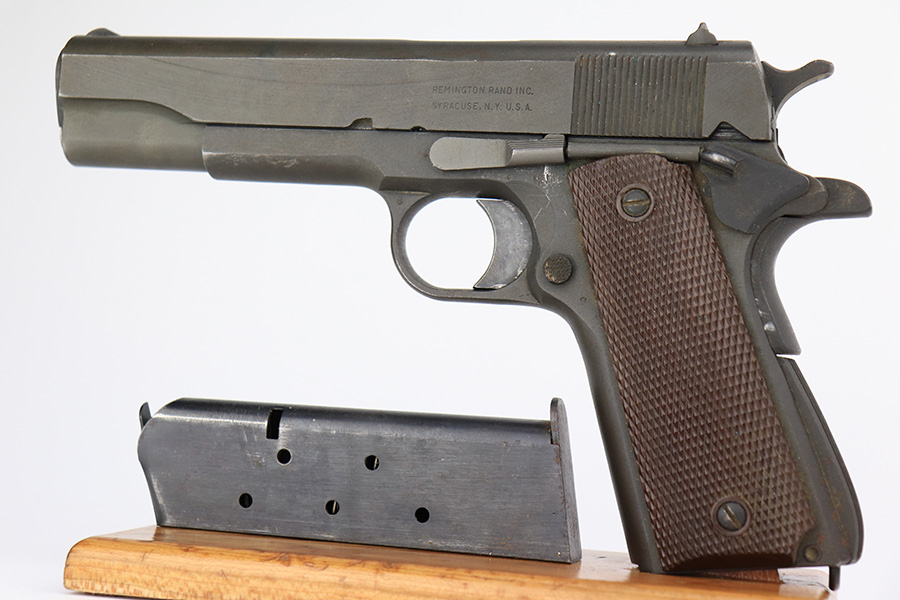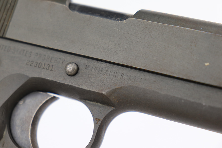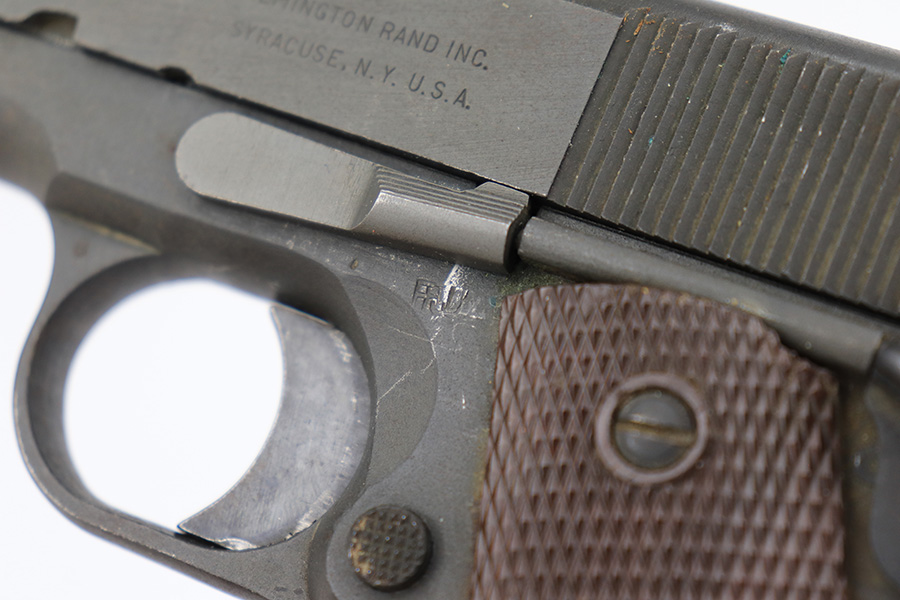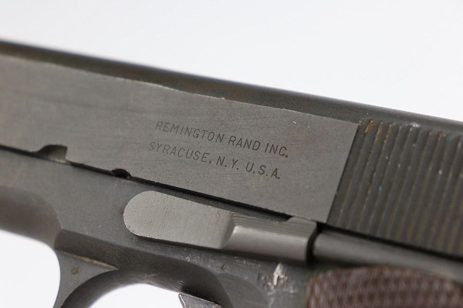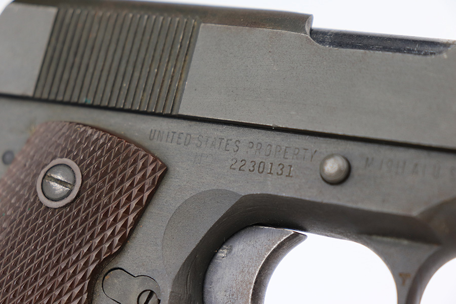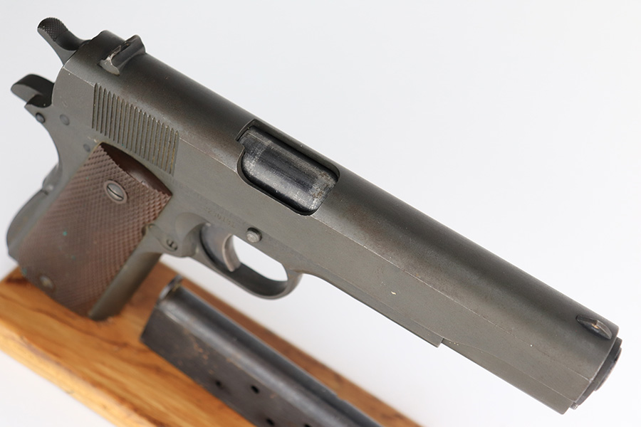 4/18/23 – This is a near-mint Remington Rand Model 1911A1 issued to the US military in early 1945. It is “United States Property” marked, has the proper “FJA” inspection stamp, and has a cross-cannon military cartouche on the right side of the frame. Proper High Standard barrel. The gun has retained essentially of its original parkerized finish with just hints of wear on some of the high edges and a very light scratch around the slide release lever. Some small spots of minor discoloration here and there. Fitted with correct reddish plastic grips. Comes with a period-correct “R” marked magazine. The bore has pretty good rifling, but there is pin-pricking and minor fouling in the grooves.