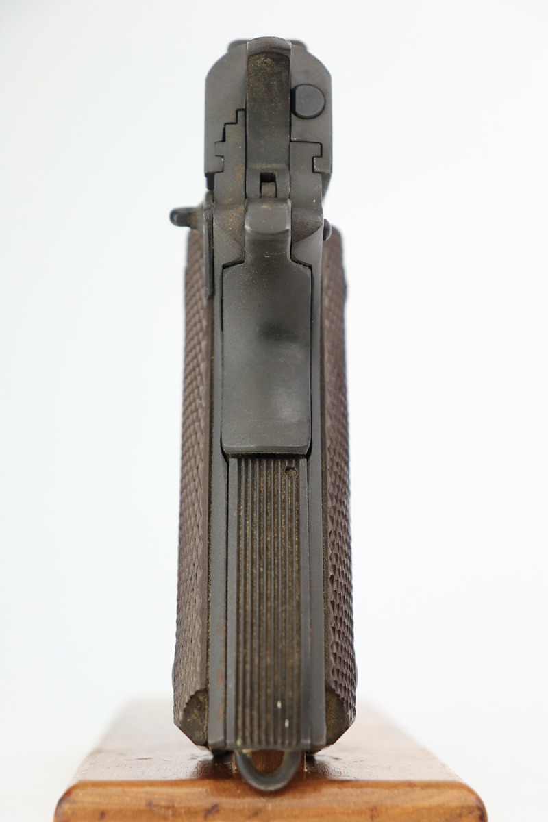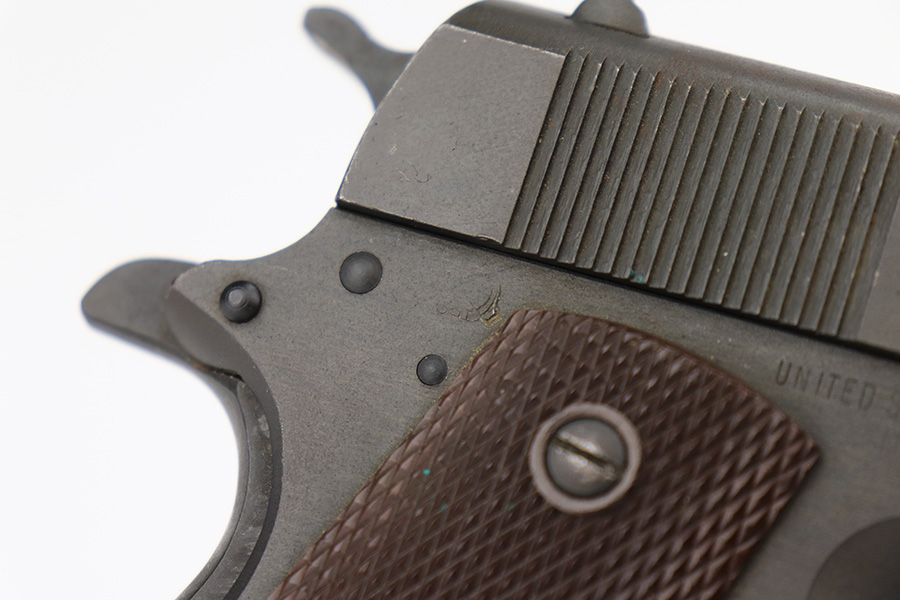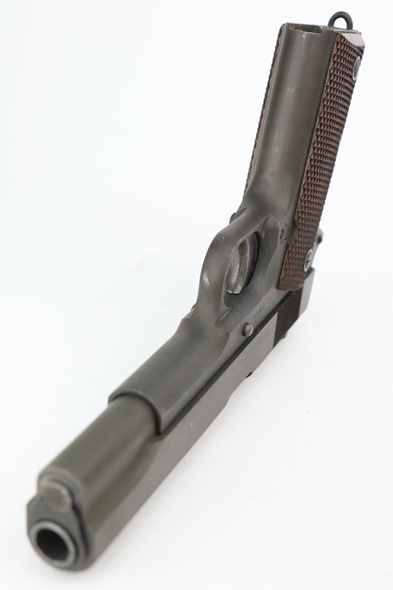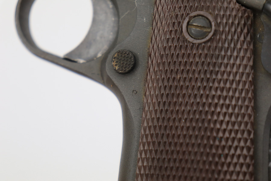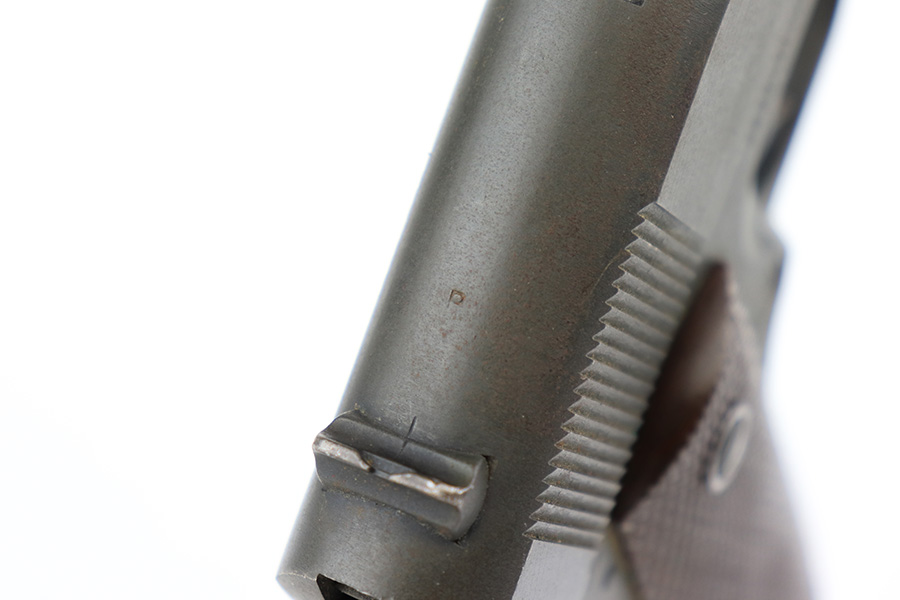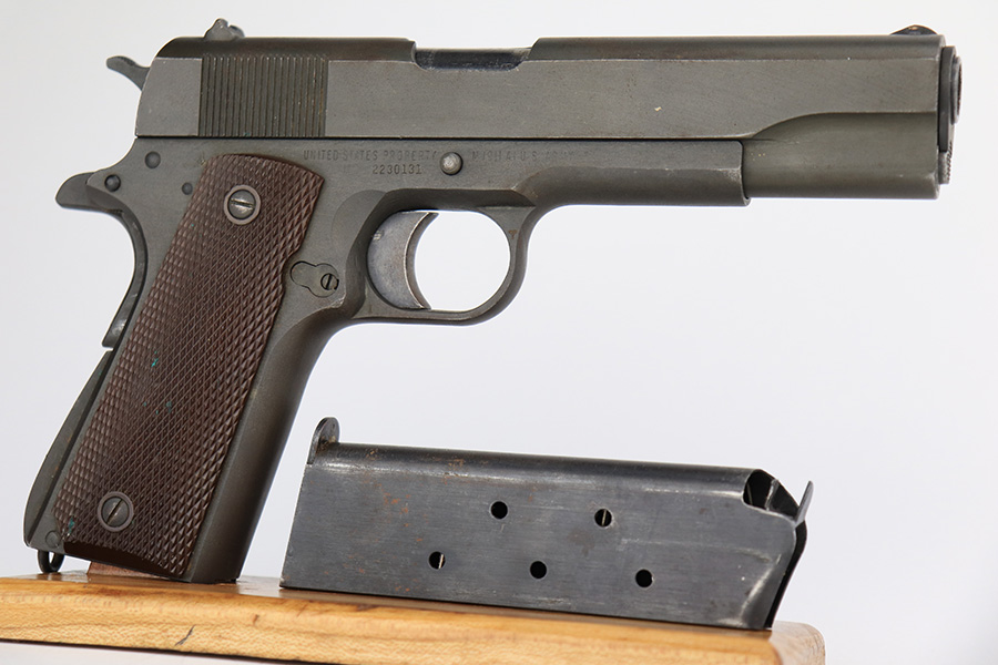 4/18/23 – This is a near-mint Remington Rand Model 1911A1 issued to the US military in early 1945. It is “United States Property” marked, has the proper “FJA” inspection stamp, and has a cross-cannon military cartouche on the right side of the frame. Proper High Standard barrel. The gun has retained essentially of its original parkerized finish with just hints of wear on some of the high edges and a very light scratch around the slide release lever. Some small spots of minor discoloration here and there. Fitted with correct reddish plastic grips. Comes with a period-correct “R” marked magazine. The bore has pretty good rifling, but there is pin-pricking and minor fouling in the grooves.