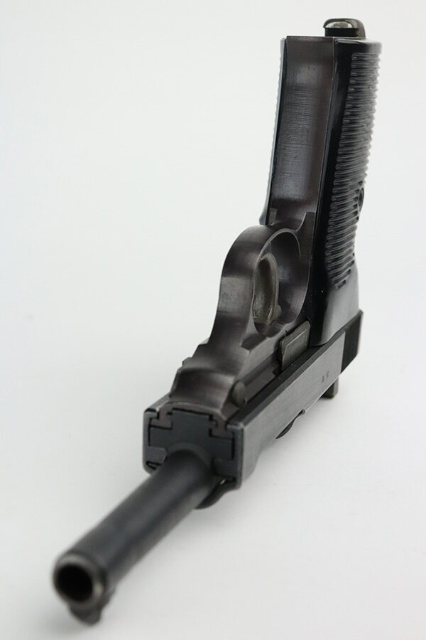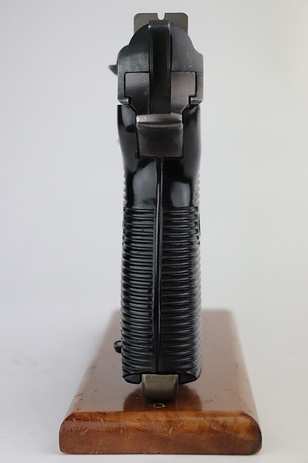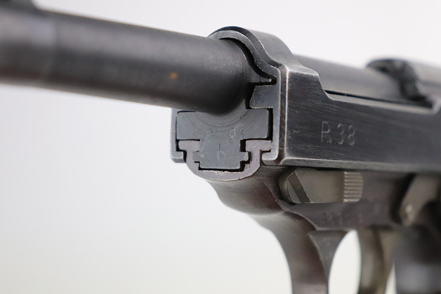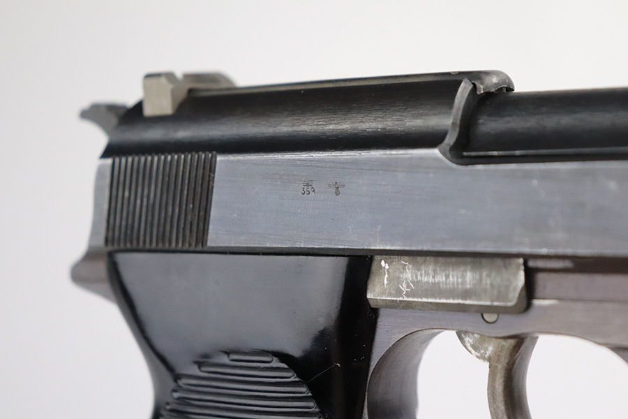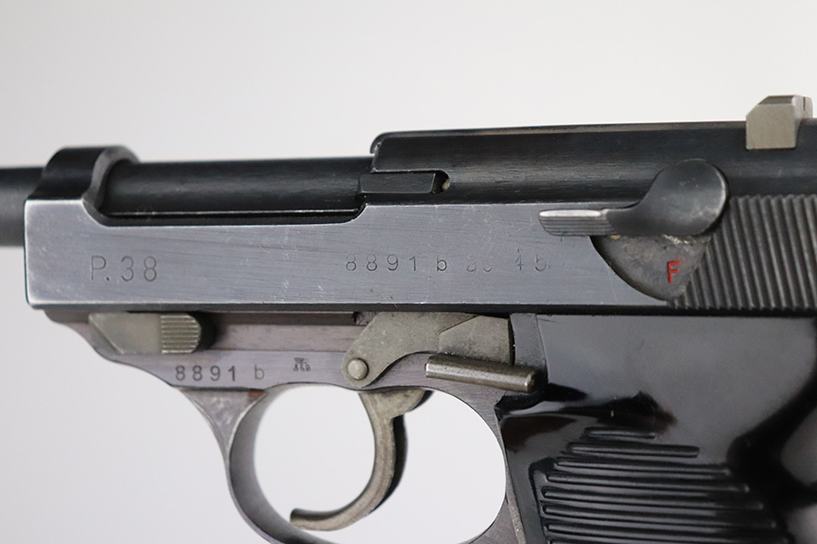 7/15/21 – This is a near-mint example of a Walther P.38 manufactured at the end of the war in 1945. It is all matching and only has two “Eagle 359” acceptance proofs on the right side of the slide, indicating it never made it to issue. It has a late-war cog hammer and phosphate small parts. It has retained more than 98% of its original finish. There are just hints of wear on some of the high edges and and some tiny scratches on the right side of the slide. It comes with excellent grips and a rare late-war phosphate “U” marked magazine. Mint bore. De-cocker is functional.