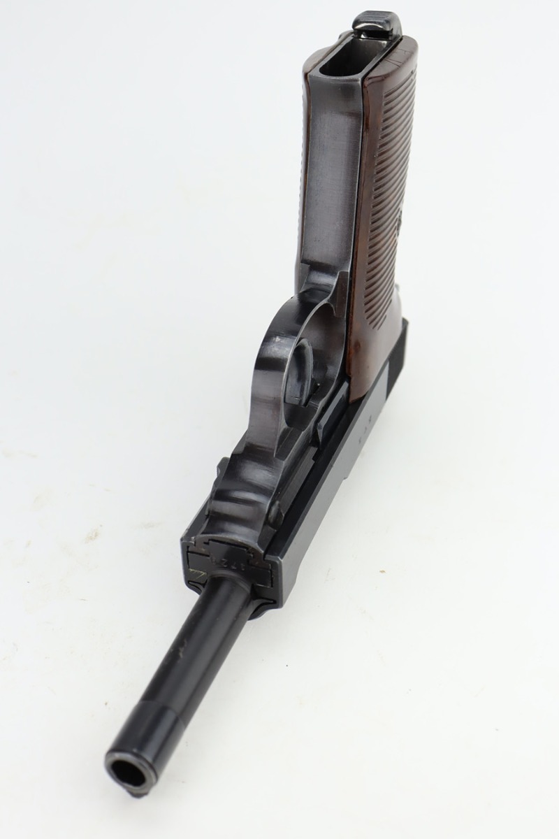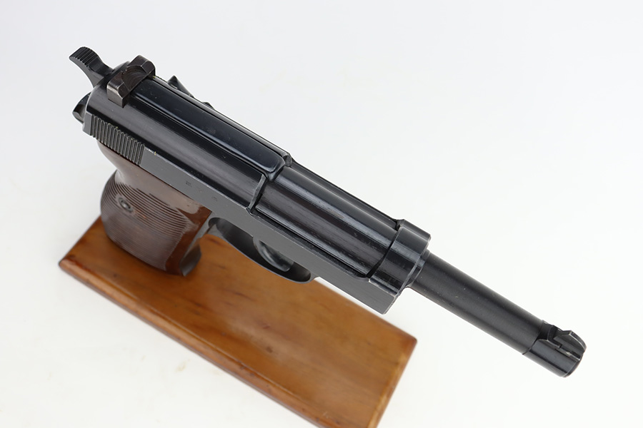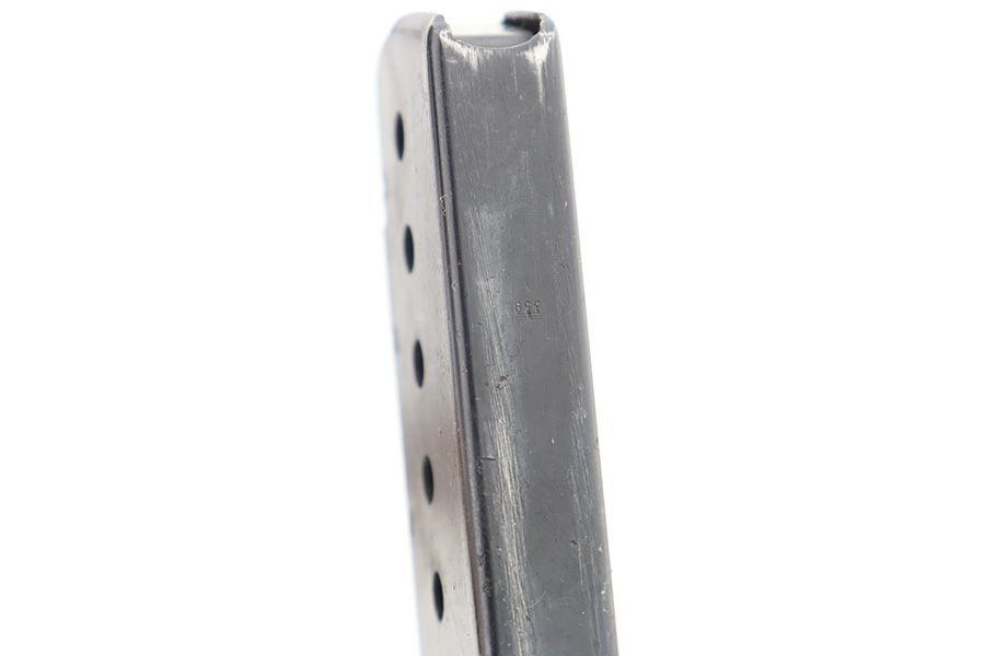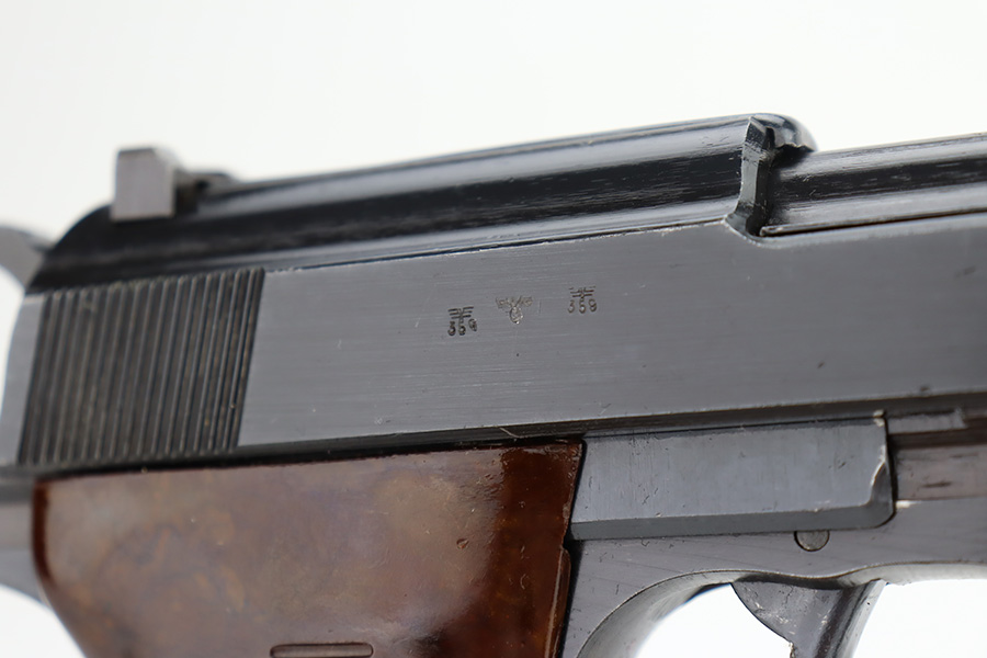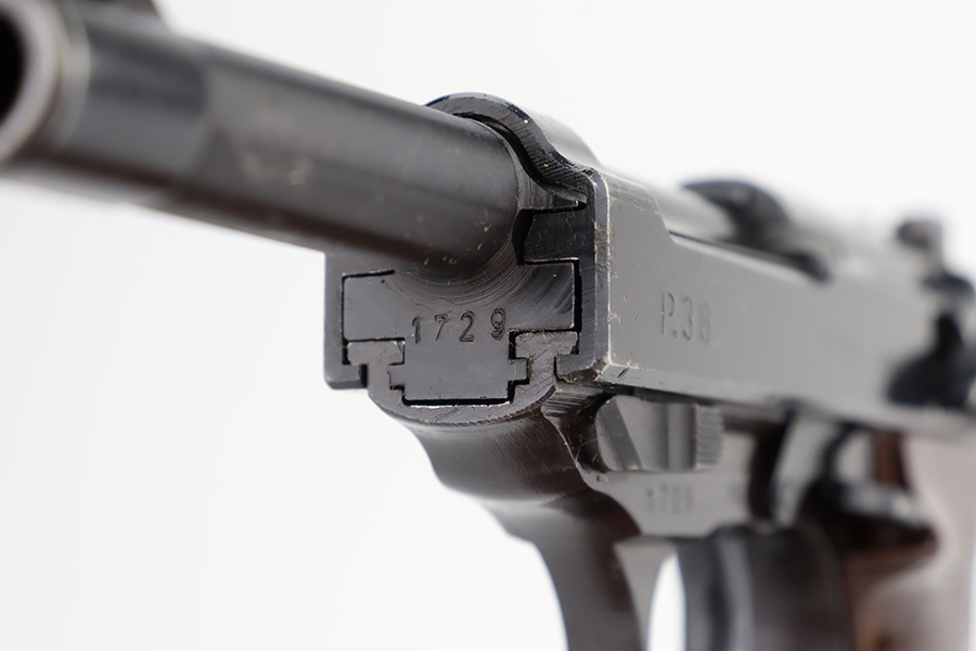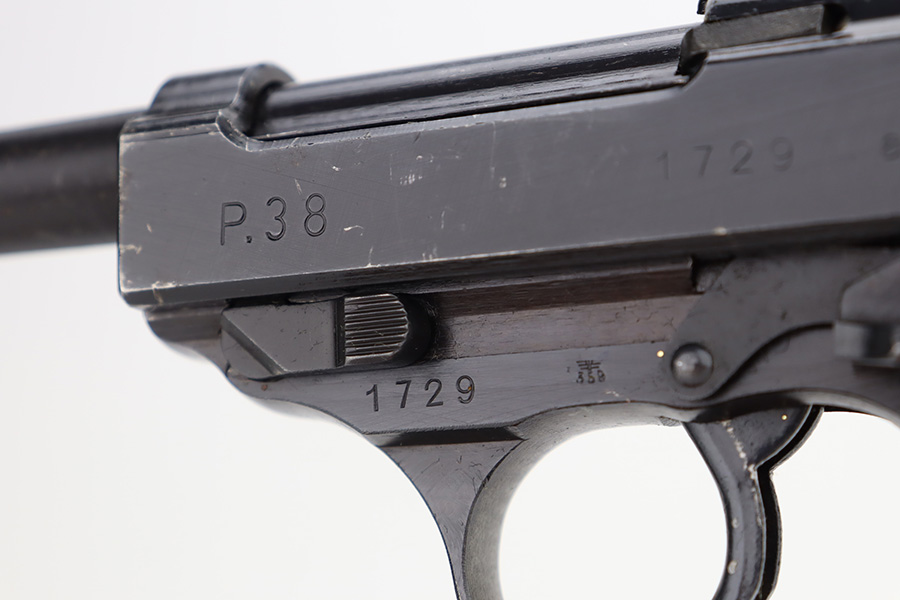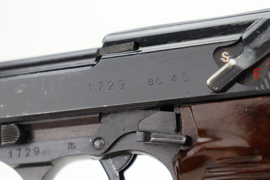 12/1/23 – This is a near-mint example of an AC 45 Walther P.38 issued to the German military in 1945. All matching with the proper “Eagle 359” acceptance proofs. It has retained nearly all of its finish with just some tiny scuffs and scratches on the left side of the gun. Fitted with reddish bakelite grips and comes with a rare, late-war, “U” marked Walther magazine. Stone-mint bore. De-cocker is functional.