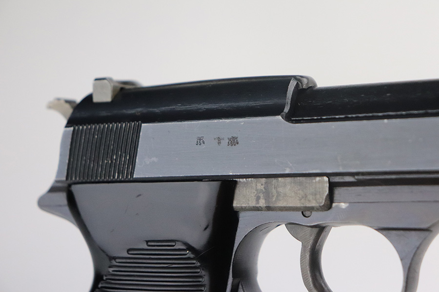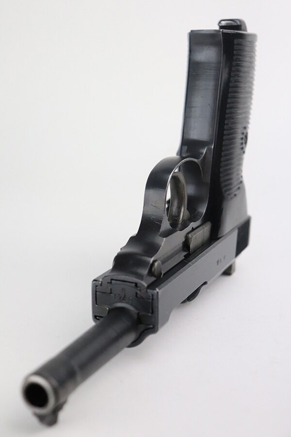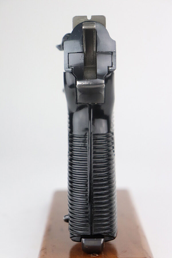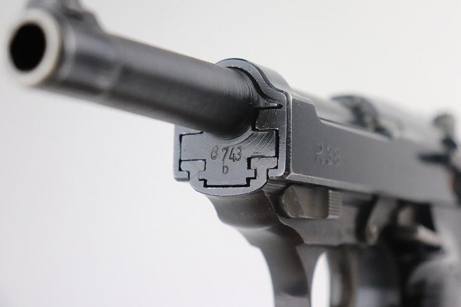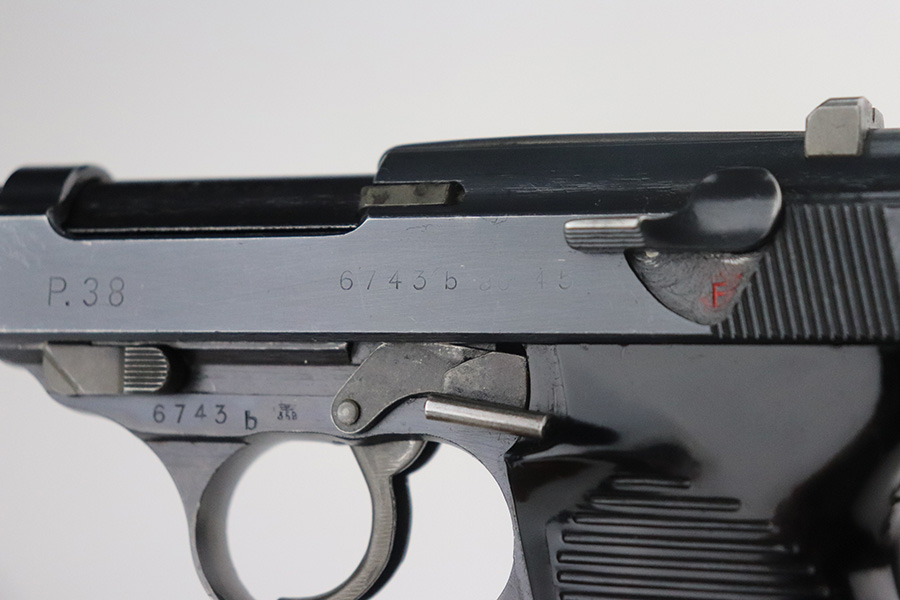 12/21/22 – This is a near-mint example of a Walther P.38 issued to the Nazi military in 1945. It is all matching, has the proper “Eagle 359” military proofs, late war cog hammer, and phosphate small parts. It also has a rare FNH barrel. It has retained about 98% of its original finish. There are hints of wear on the high edges of the slide and around the muzzle. Some tiny handling marks on both sides of the slide. Comes with excellent grips and a Walther magazine. Excellent bore – shiny with strong rifling and a couple of areas of very minor freckling. De-cocker is functional. NOTE: The magazine shown in the photos is not the magazine offered in this listing, it was swapped with a Walther mag in excellent condition.