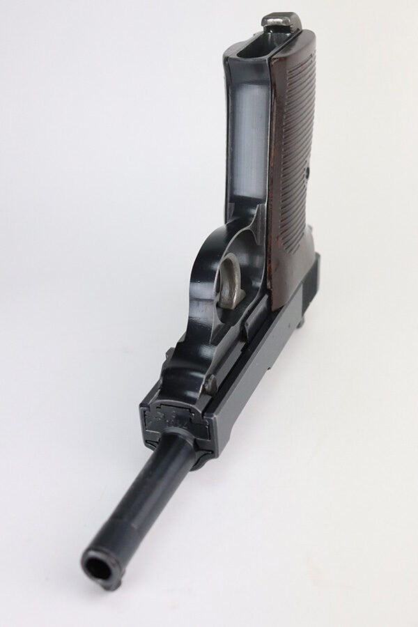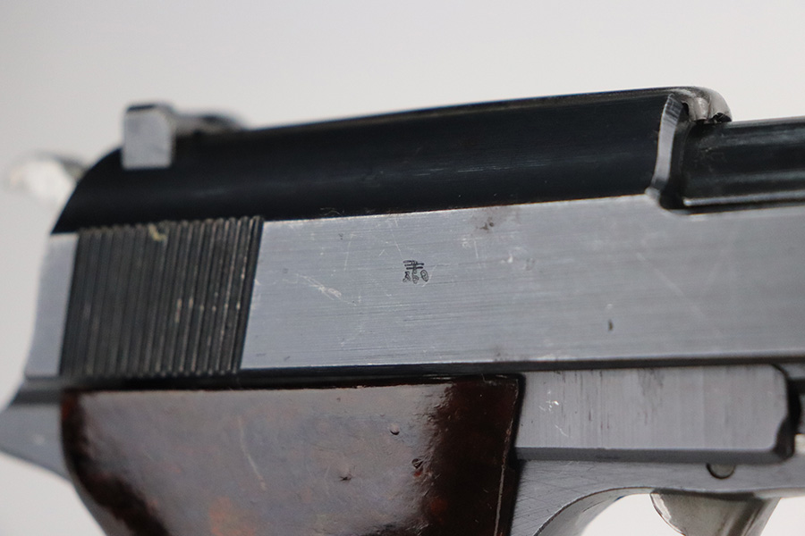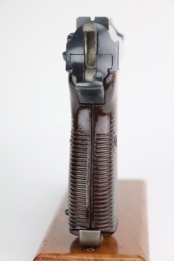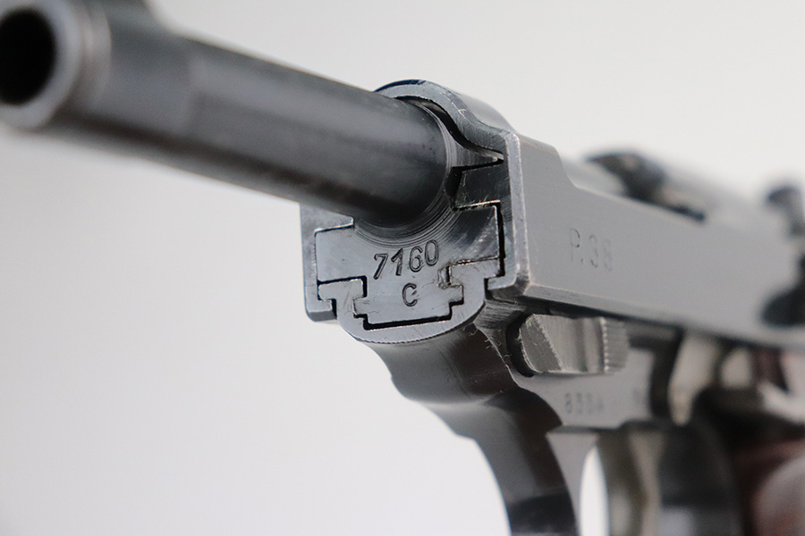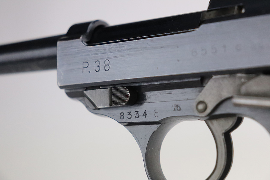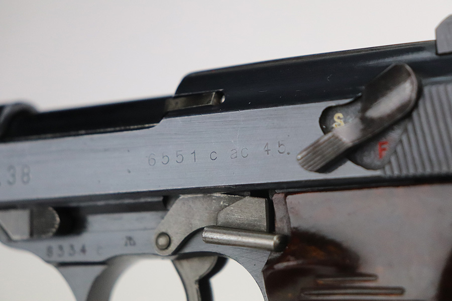 7/14/21 – This is a minty example of a Walther P.38 manufactured in 1945. It is was put together by the GI’s when they liberated the factory. The serial numbers are mismatched but in the correct “c” serial block, it has some phosphate small parts, and has only one “Eagle 359” military acceptance proof. It has retained about 98% of its original finish. There is barely any actual finish loss, but light scratches on the underside of the barrel and right side of the slide. Comes with excellent grips and a Walther magazine. Mint bore. De-cocker is functional.