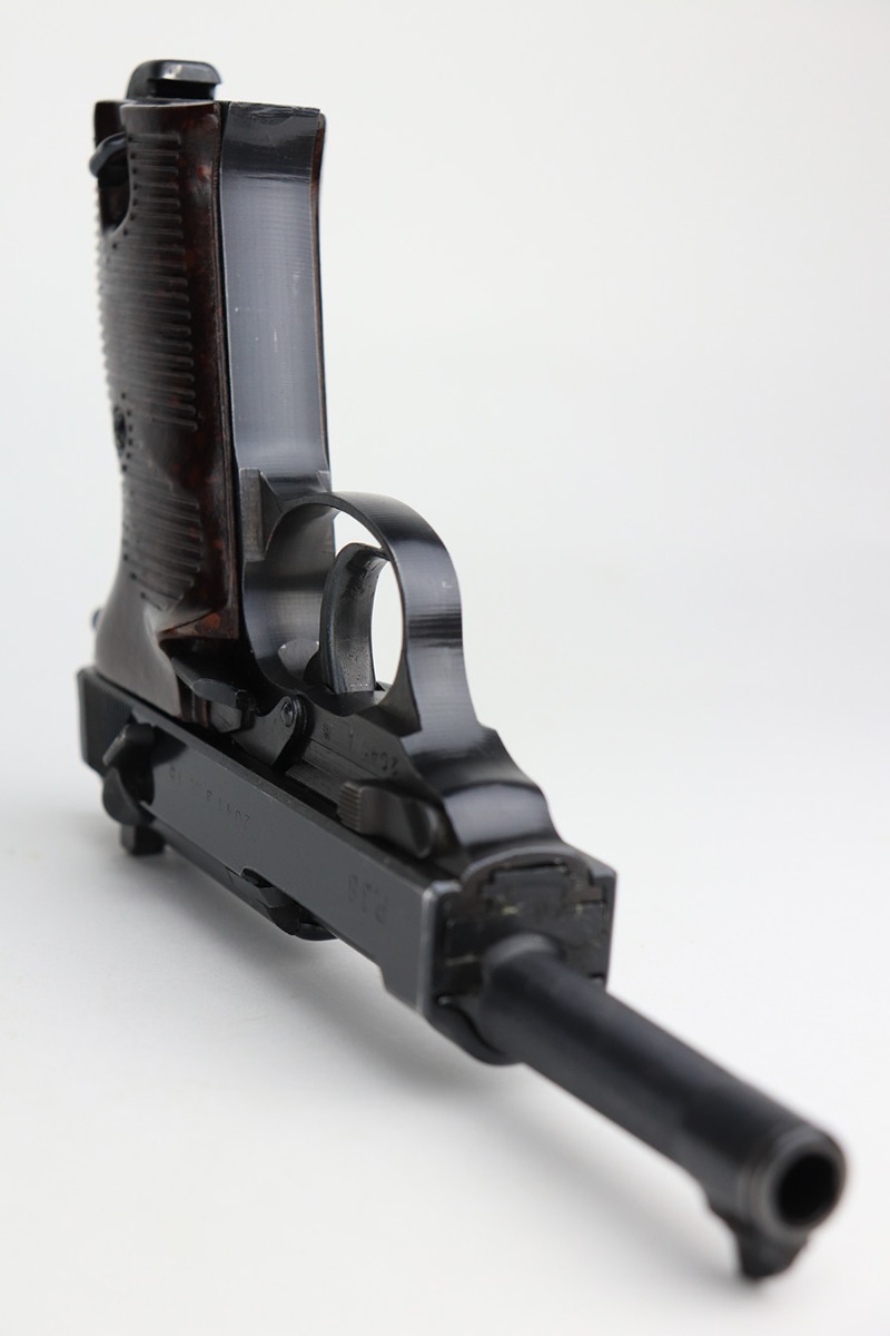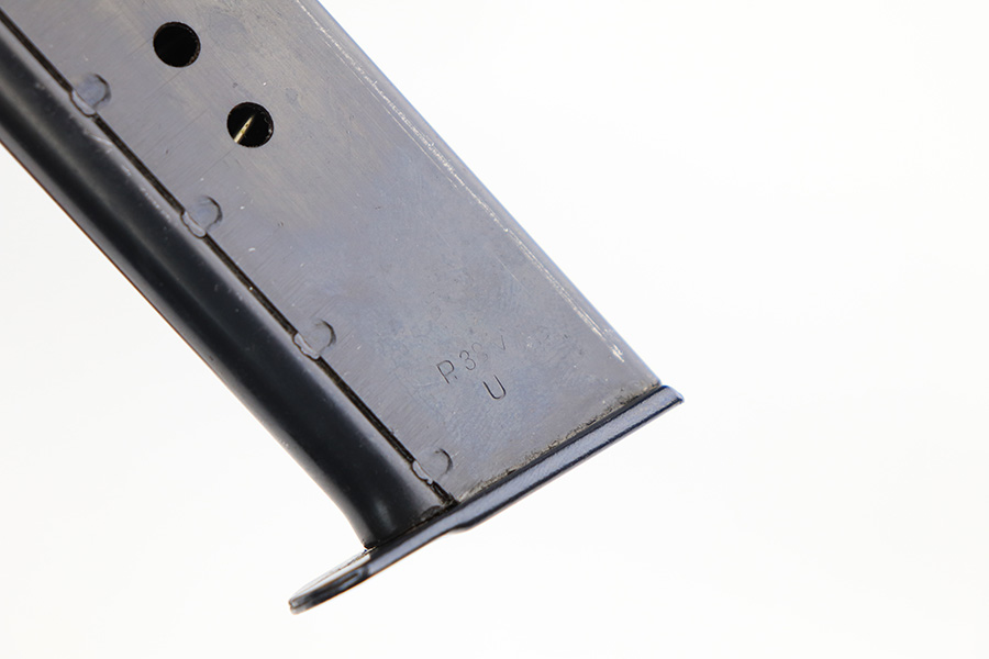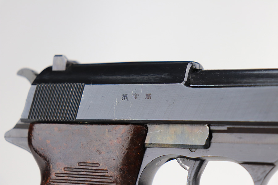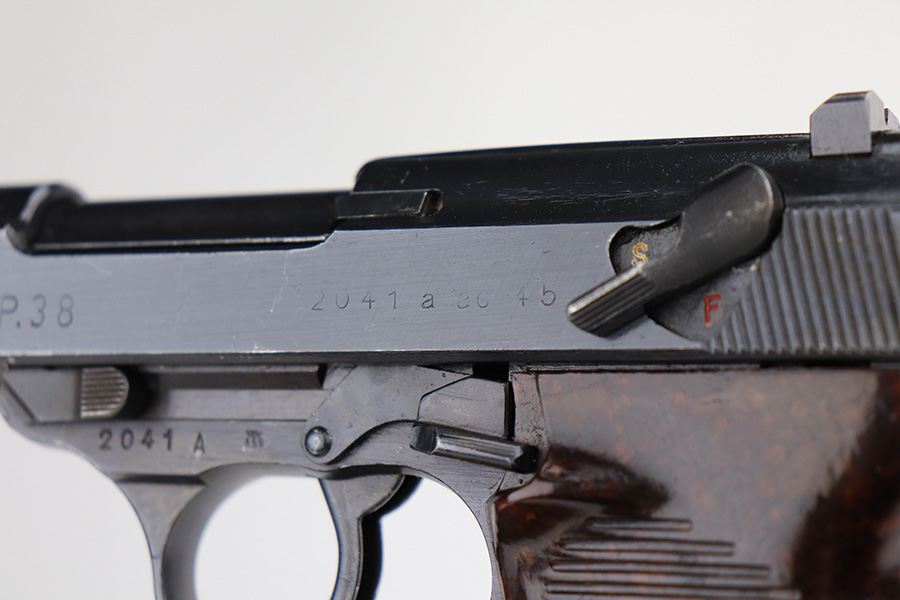 2/18/22 – This is a minty Walther P.38 from February of 1945. It’s a rare sub-variation with capital ‘A’ suffix in the serial on the frame. Only ~5,500 P.38s feature this odd design change. The gun is all original with a few minor surface scuffs on the barrel but is otherwise mint. Mint bore, looks unfired. Minty red grips with no defects. Original Walther magazine. Good mechanics, including de-cocker.