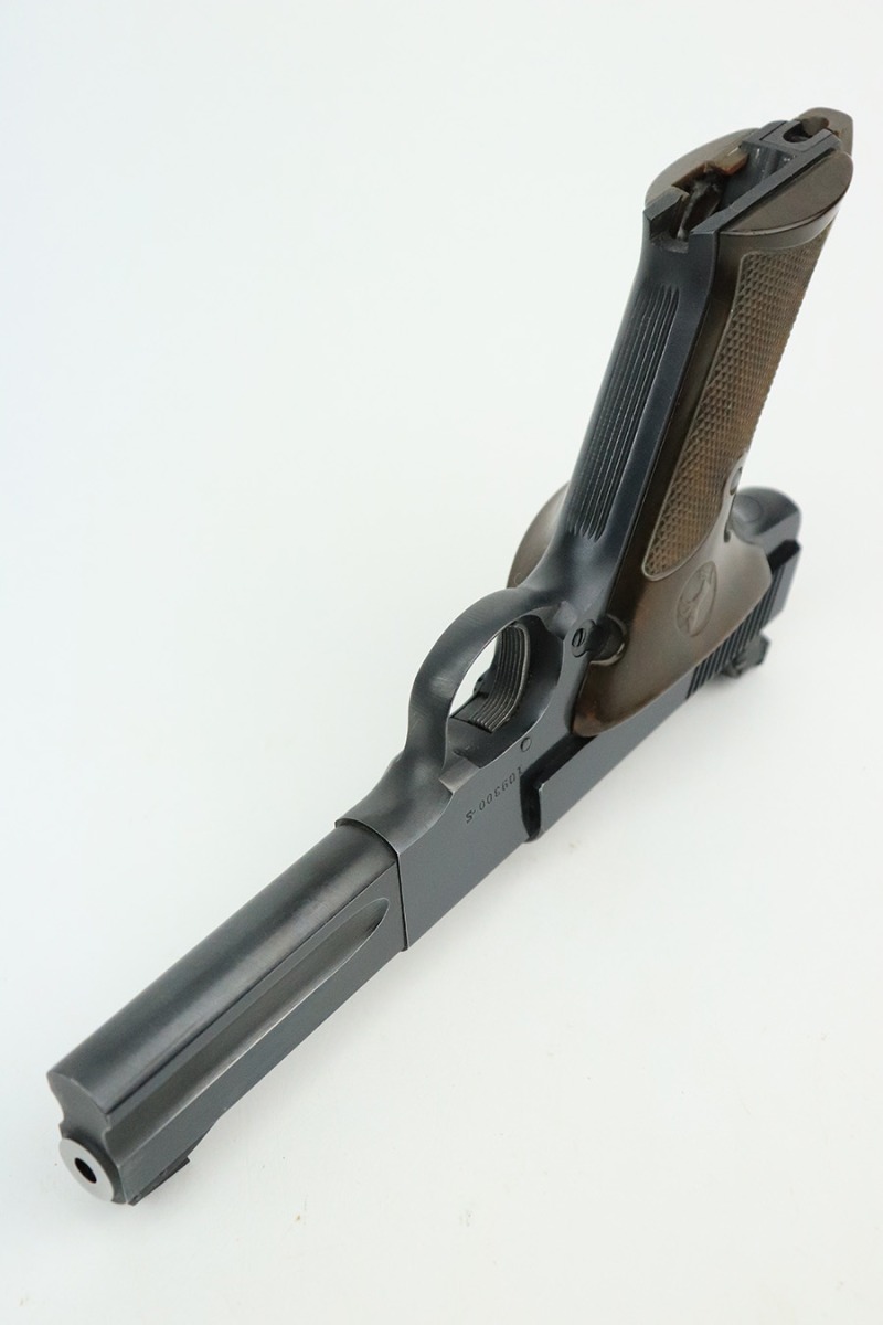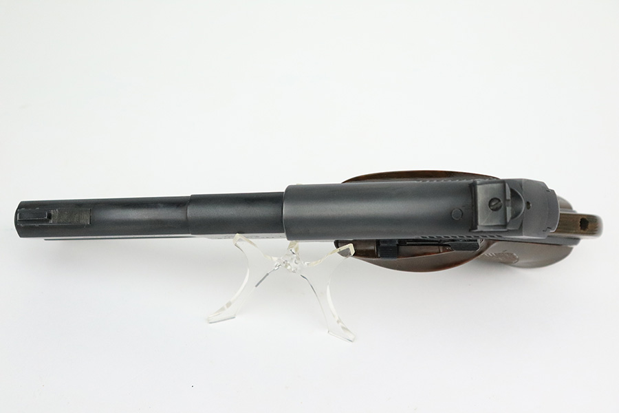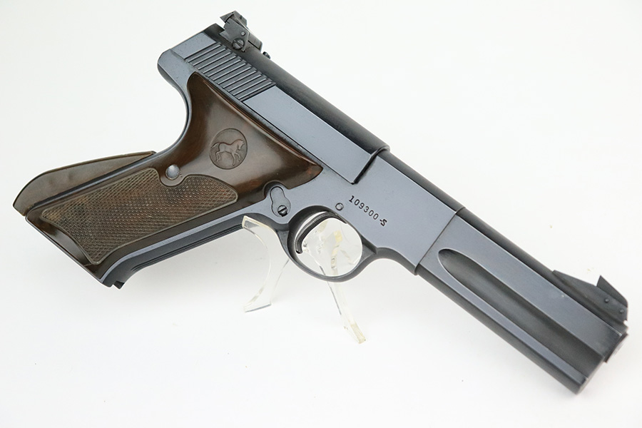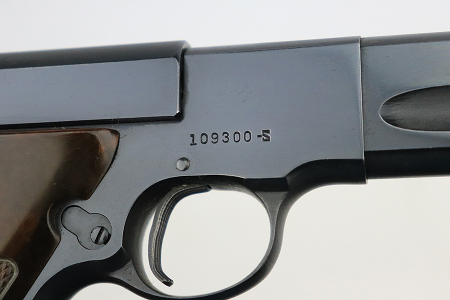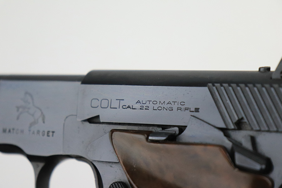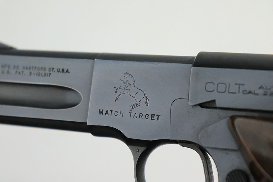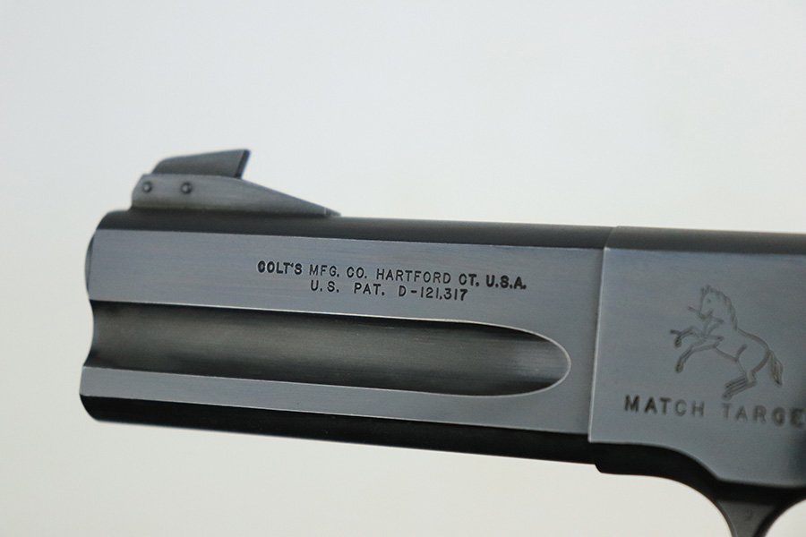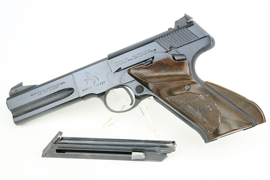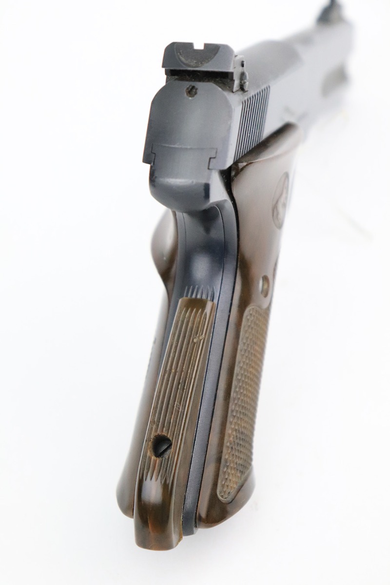 7/25/22 – This is a near-mint example of a Colt Match Target manufactured in 1952. The gun is all correct and has retained virtually all of its original finish. There is one tiny dot of discoloration on the right side of the barrel and some very minor freckling on both sides of the slide. Comes with excellent brown plastic grips and a brown plastic grip extension. Also comes with one correct magazine. Mint bore.