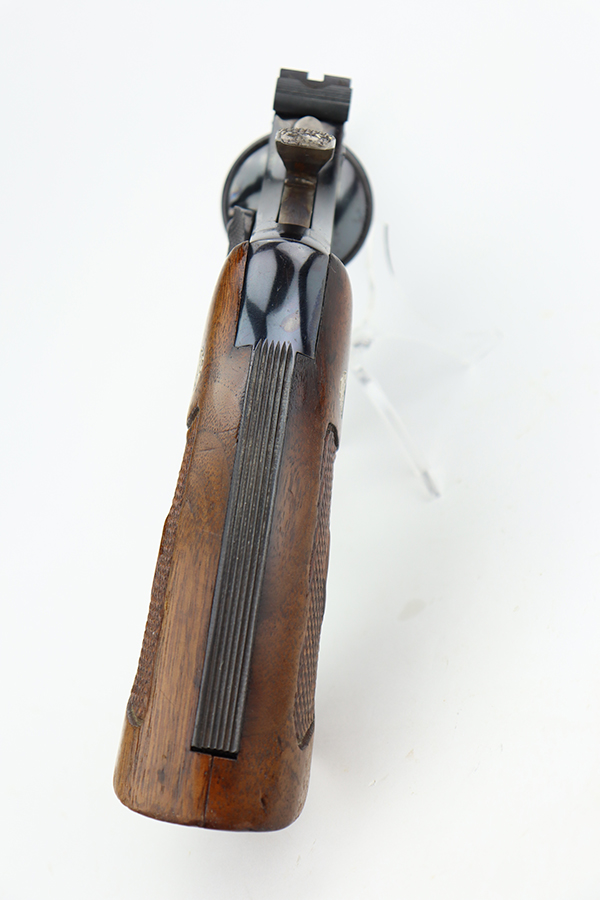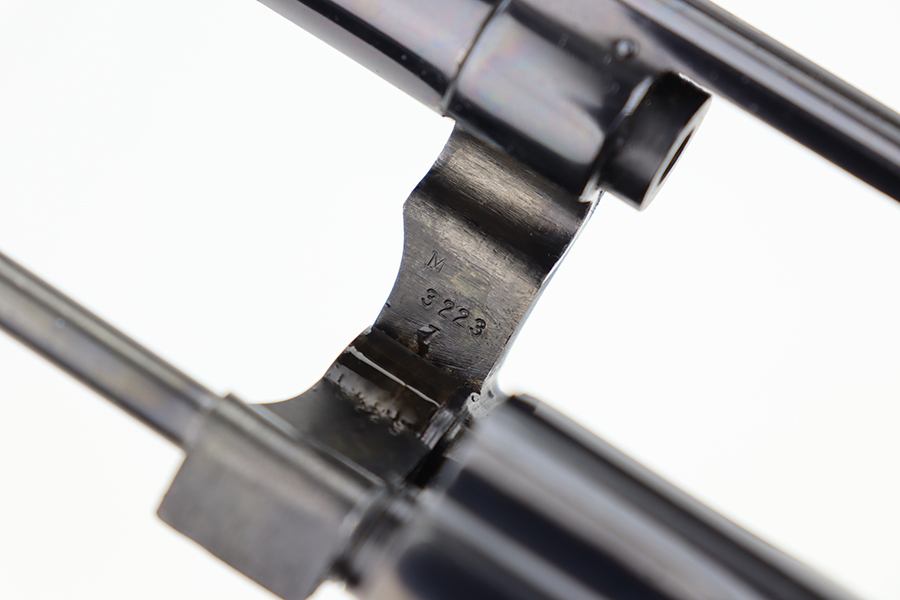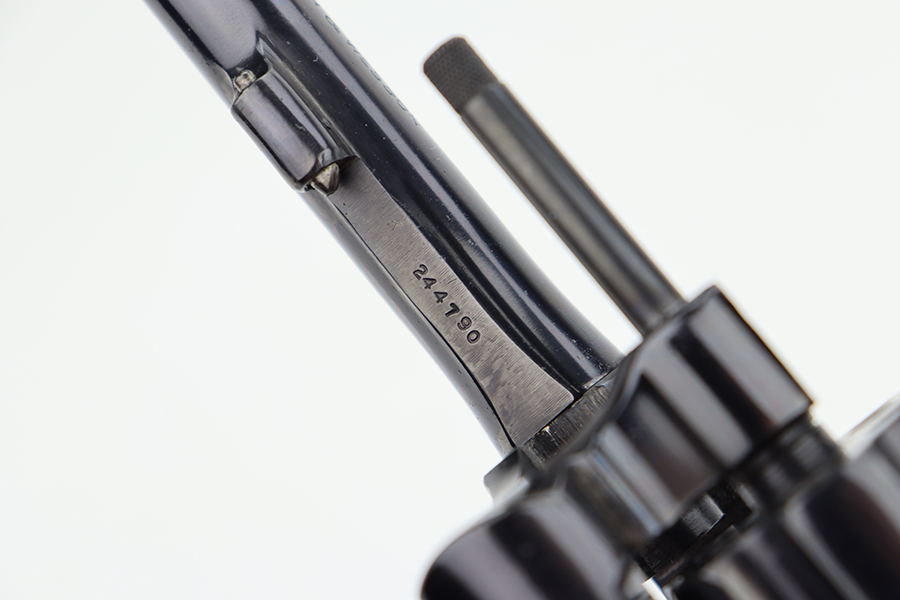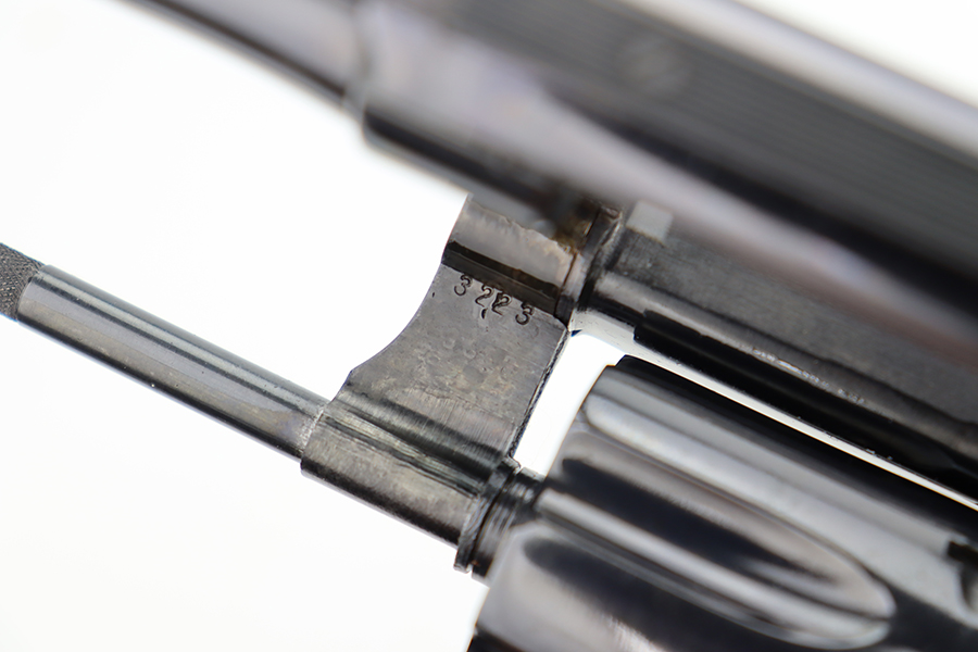 7/1/24 – This is a near-mint example of a Smith & Wesson K-22 Revolver, manufactured in 1955 and chambered in .22 LR. All matching and has retained nearly all of its original high polish finish. There are just some very light scratches here and there. Barely even a hint of a roll mark on the cylinder. Case-hardening on the hammer and trigger. Fitted with excellent checkered wood grips. Mint bore.