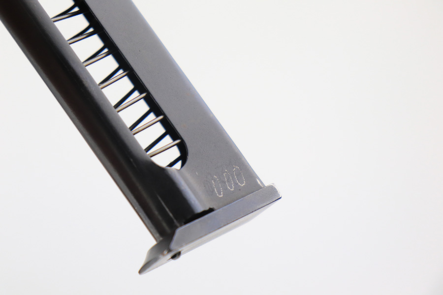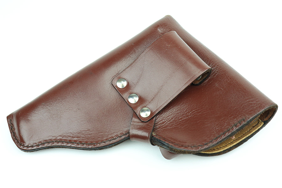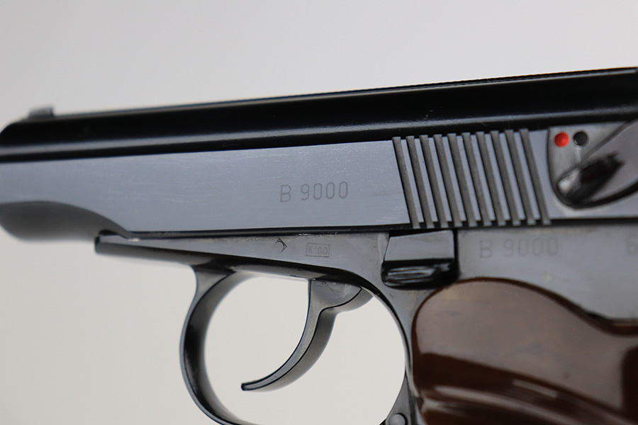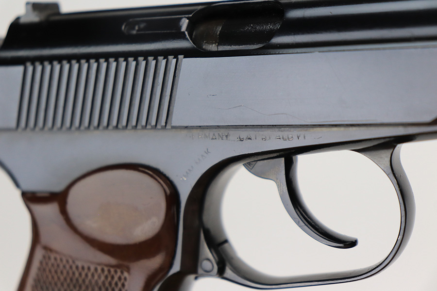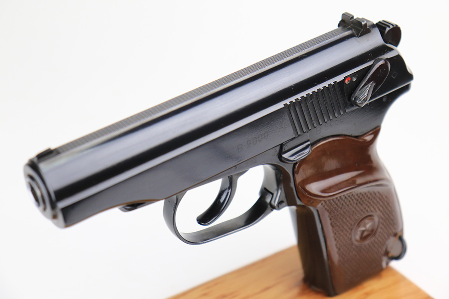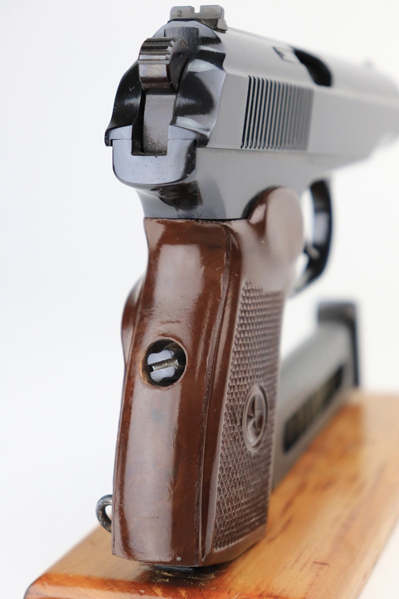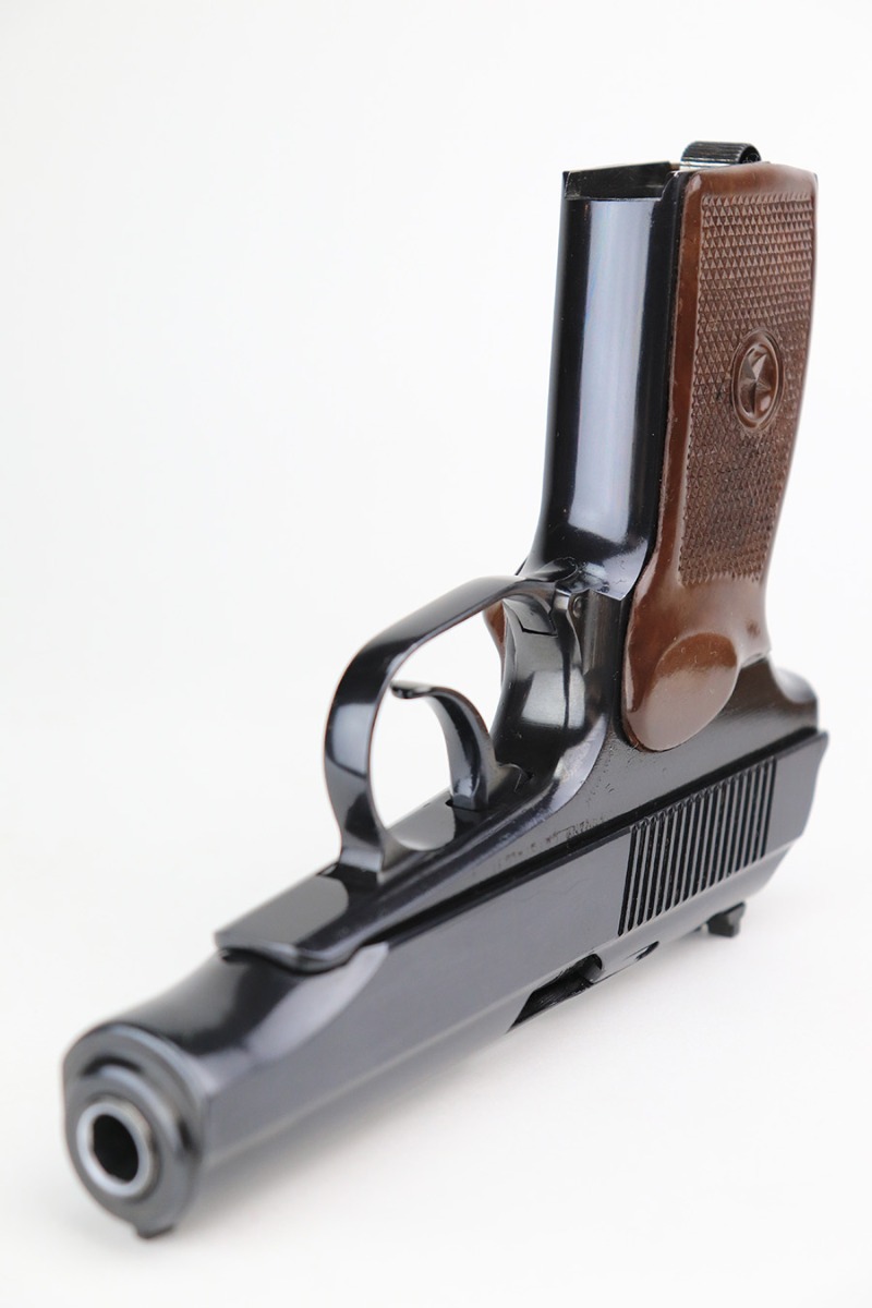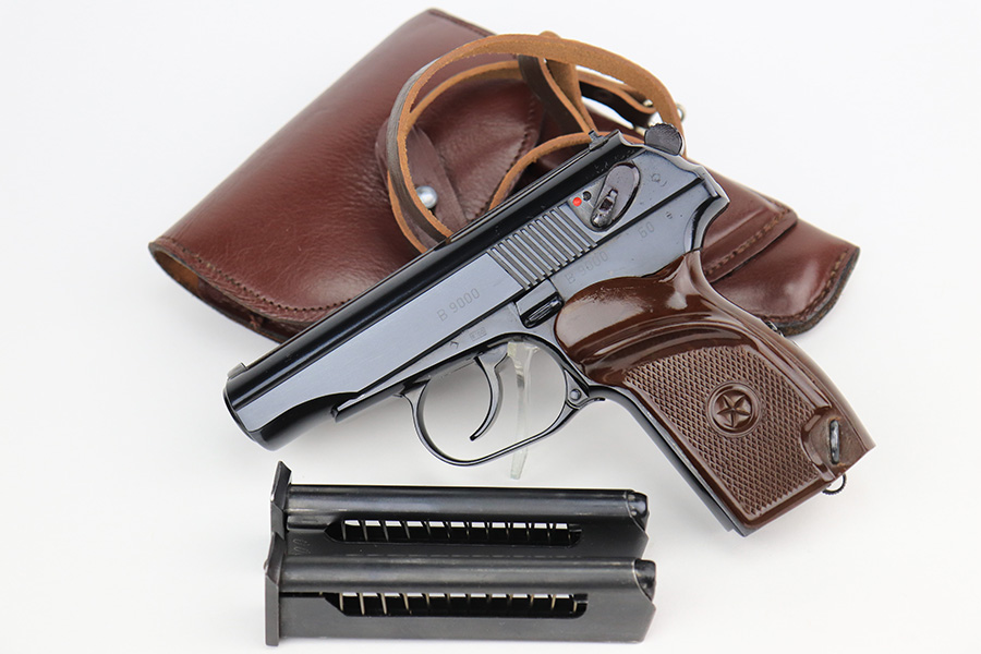 12/30/22 – This is a mint example of a Russian Makarov manufactured in 1960. It is all matching and has a light import mark on the right side of the frame. It comes as a rig with a mint holster, lanyard, and two matching-numbered magazines (electro pencil-numbered, though the font is different on the spare). The gun has retained virtually all of its high polish bluing with a scratch on the right side of the slide and a couple of tiny dots of discoloration on the left side of the frame. Comes with a minty grip. Mint bore.