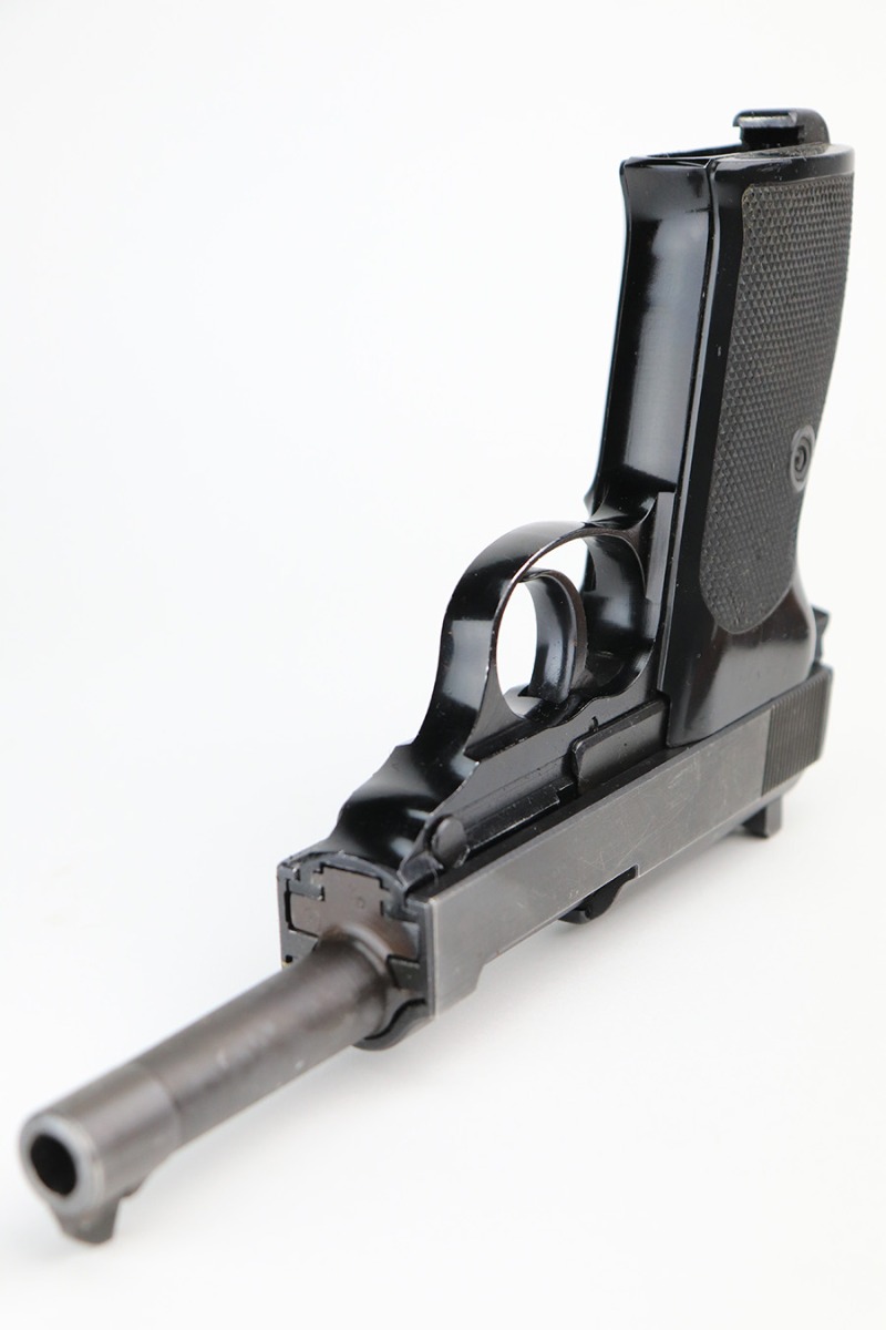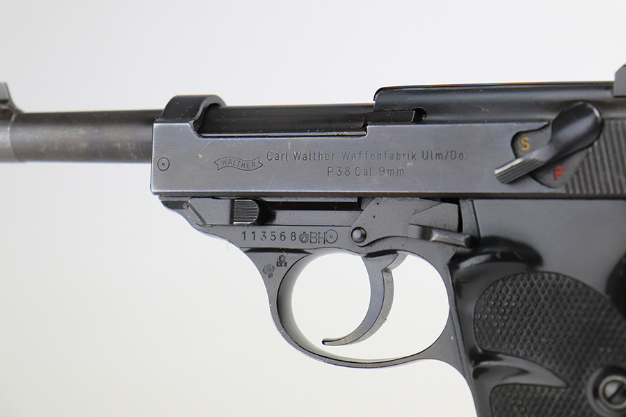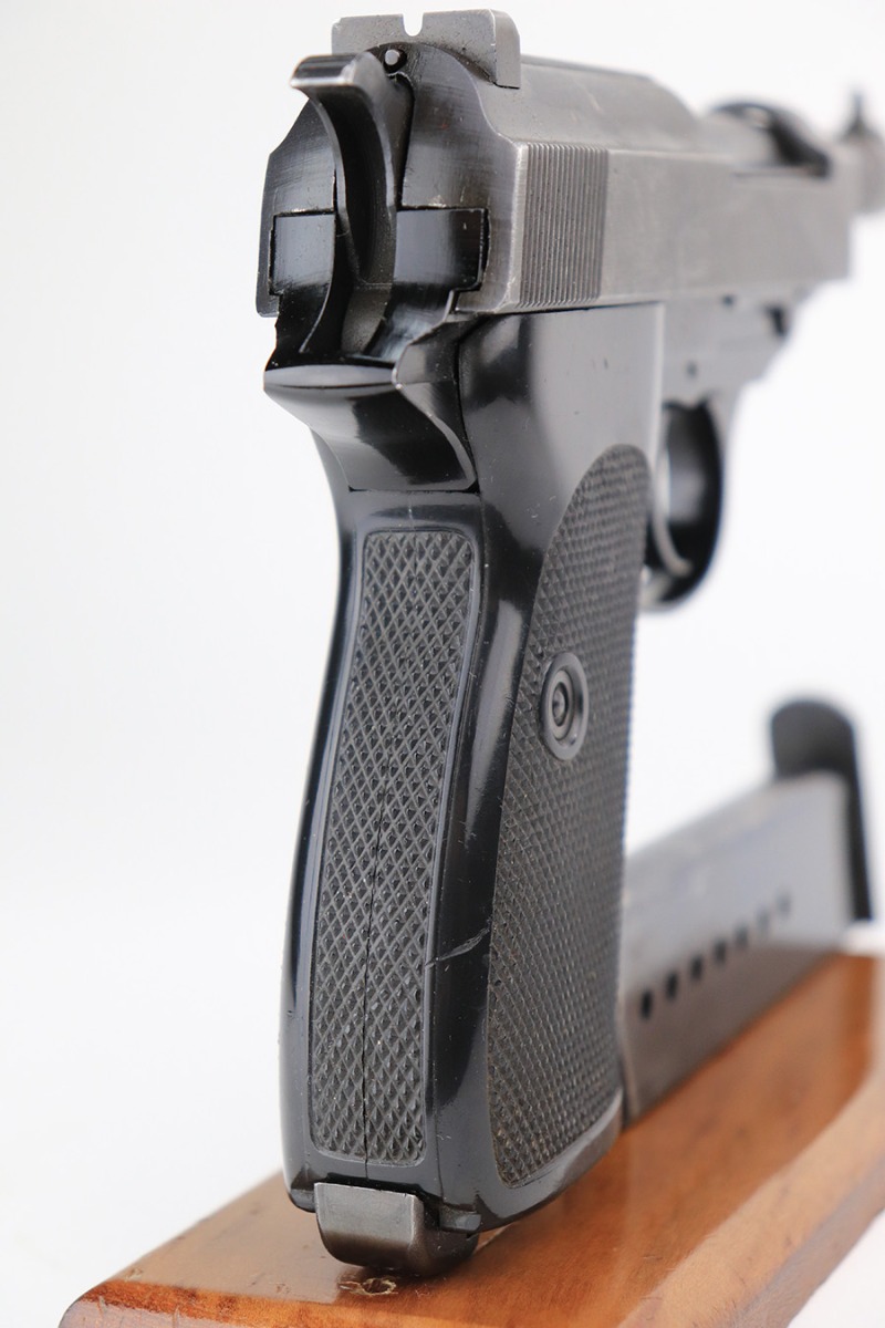 5/10/22 – This is a near-mint example of a Walther P.38 manufactured in the 1960’s. The gun is all matching and has the proper West German proofs. There is an “Eagle BH” proof on the left side of the frame, indicating this gun was delivered to the Austrian military. Lightweight aluminum frame. It has retained nearly all of its original finish. There are just some light scuffs here and there along the slide. Comes with very nice period-correct black plastic grips and one proper magazine. Mint bore. De-cocker is functional.
