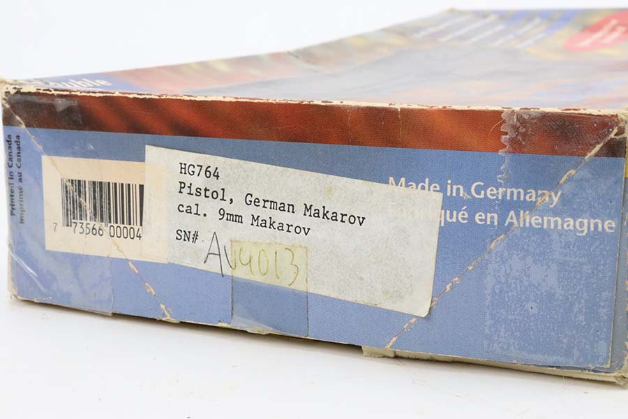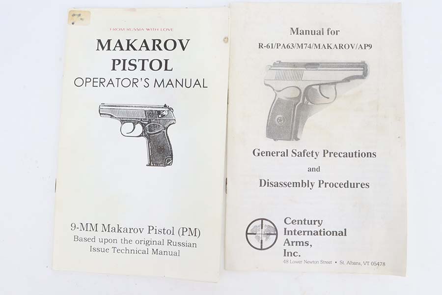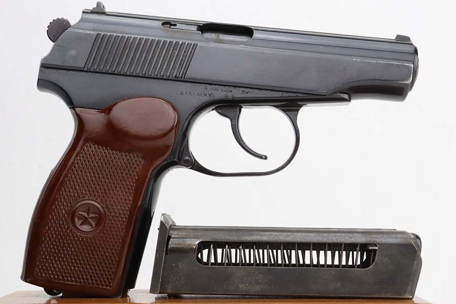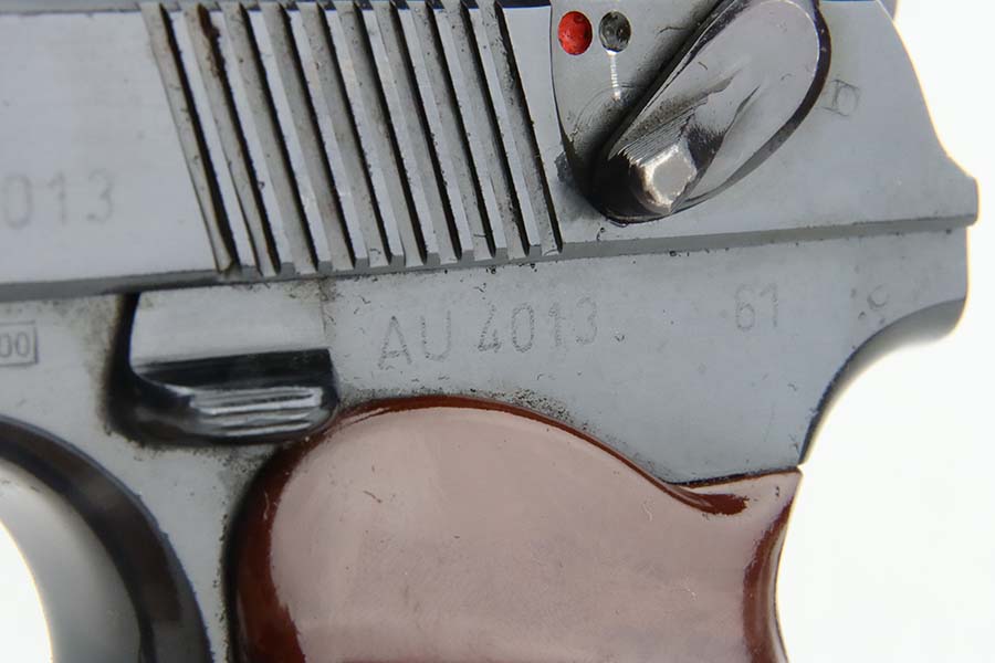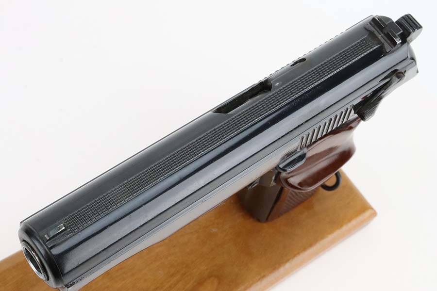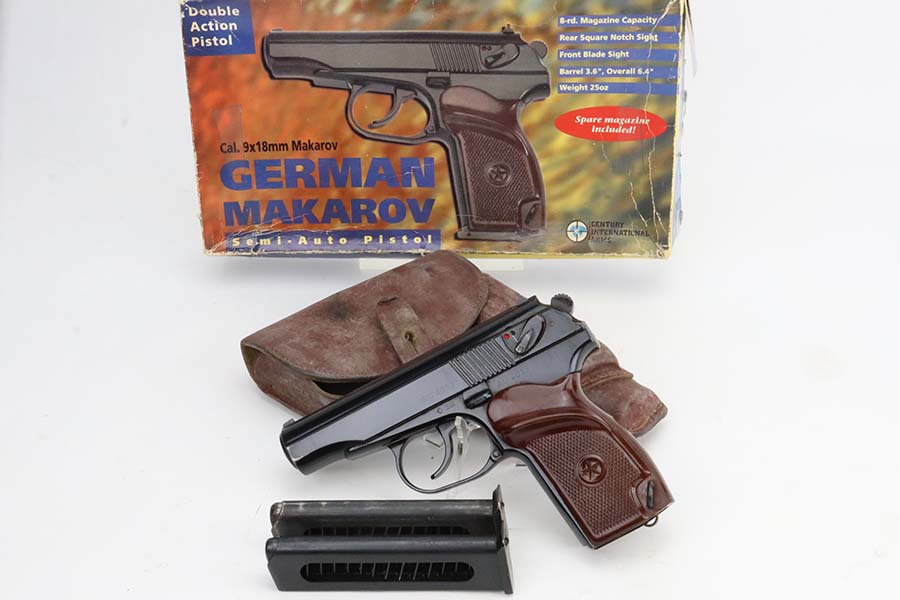 3/7/24 – This is a near-mint example of a German Makarov pistol from 1961, chambered in 9mm Makarov. It is all matching with an import mark on the right side of the frame. It comes with its matching-numbered box, leather holster, owners manual, and two magazines. The holster has some light white mold on it – should clean up just fine. The gun has retained nearly all of its original high polish finish with just very minor muzzle wear and a couple of small spots of very light freckling. Fitted with a proper reddish plastic grip. Stone-mint bore.
