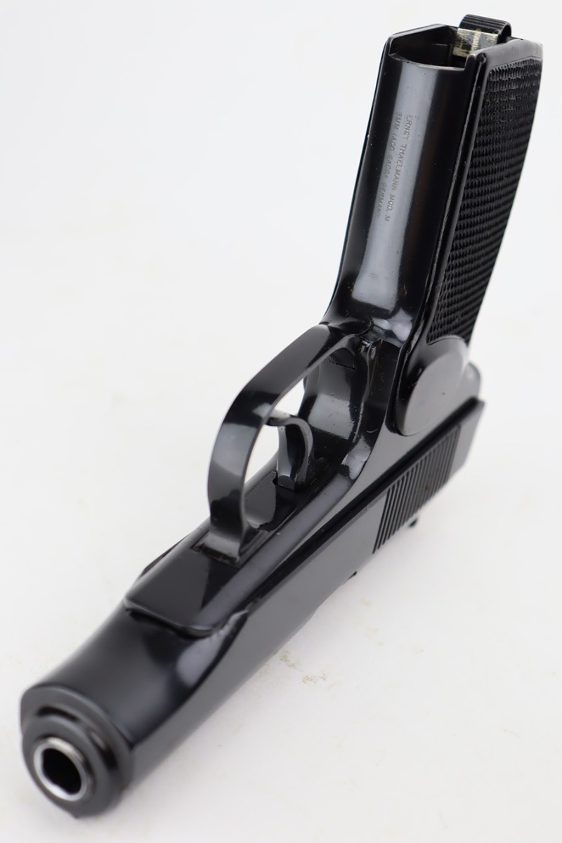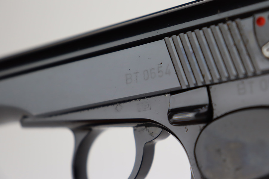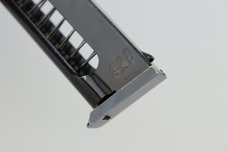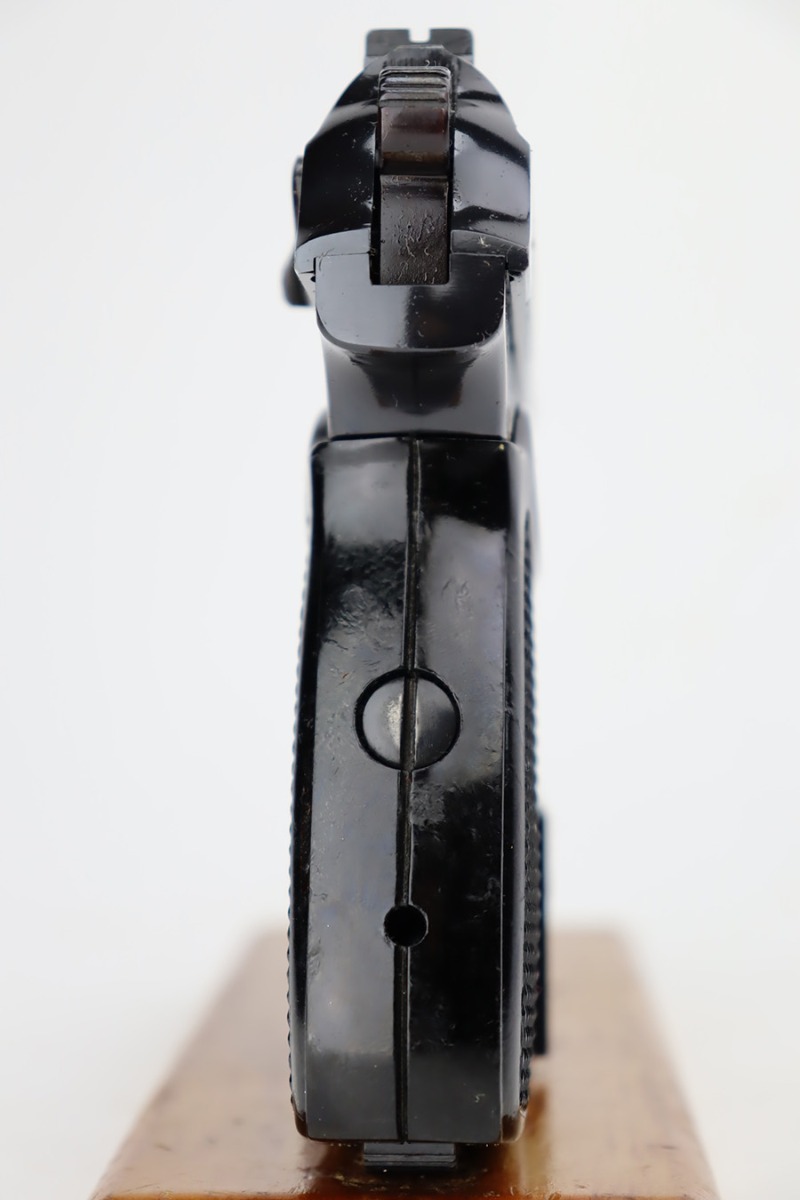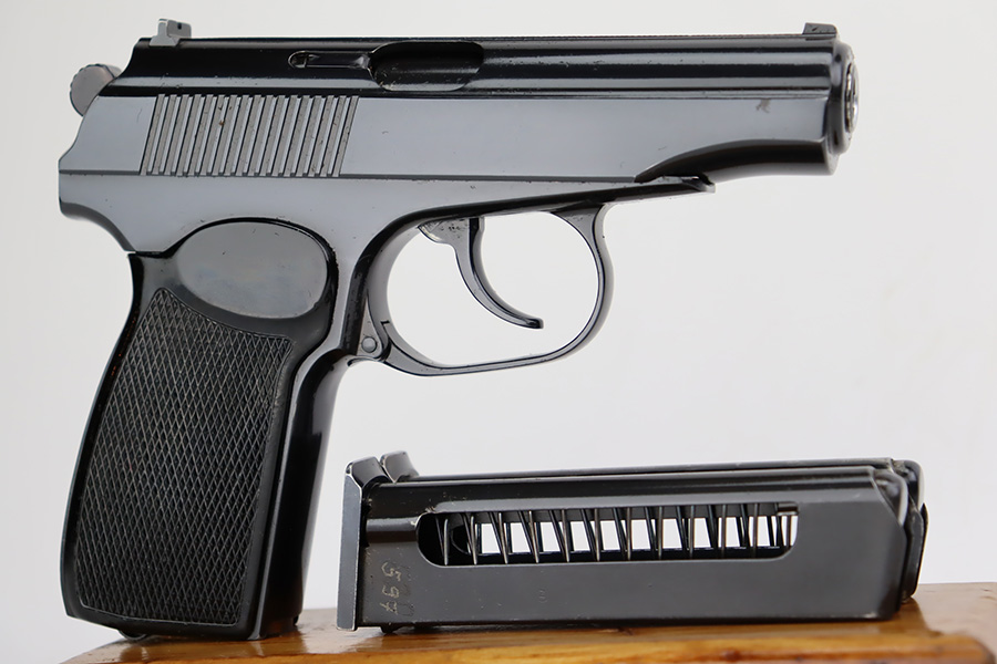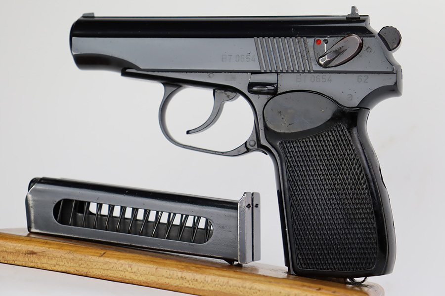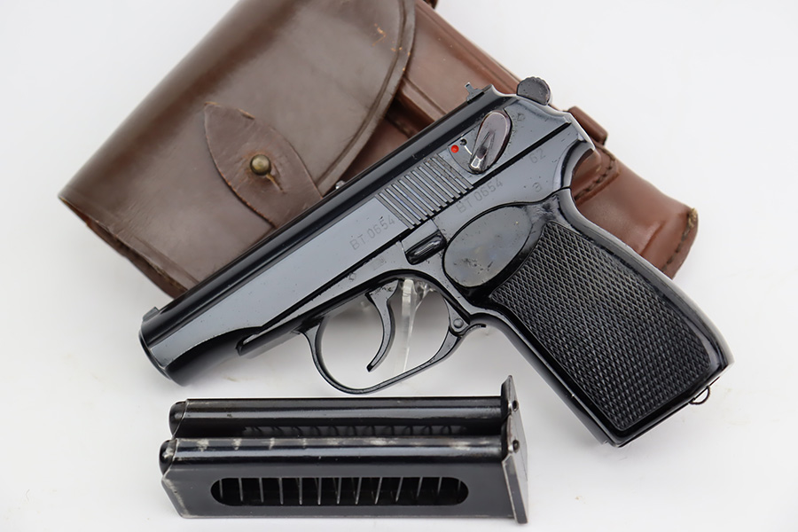 11/2/23 – This is a near-mint example of a Makarov made in East Germany in 1962. It is all matching but has an import mark on the front strap. It has retained nearly all of its high polish finish with minor muzzle wear, some tiny scratches on the slide, and a small dot of oxidation on the right side of the slide. Fitted with excellent black bakelite grips. Comes with two period-correct but mismatched magazines and an excellent leather holster. Mint bore.