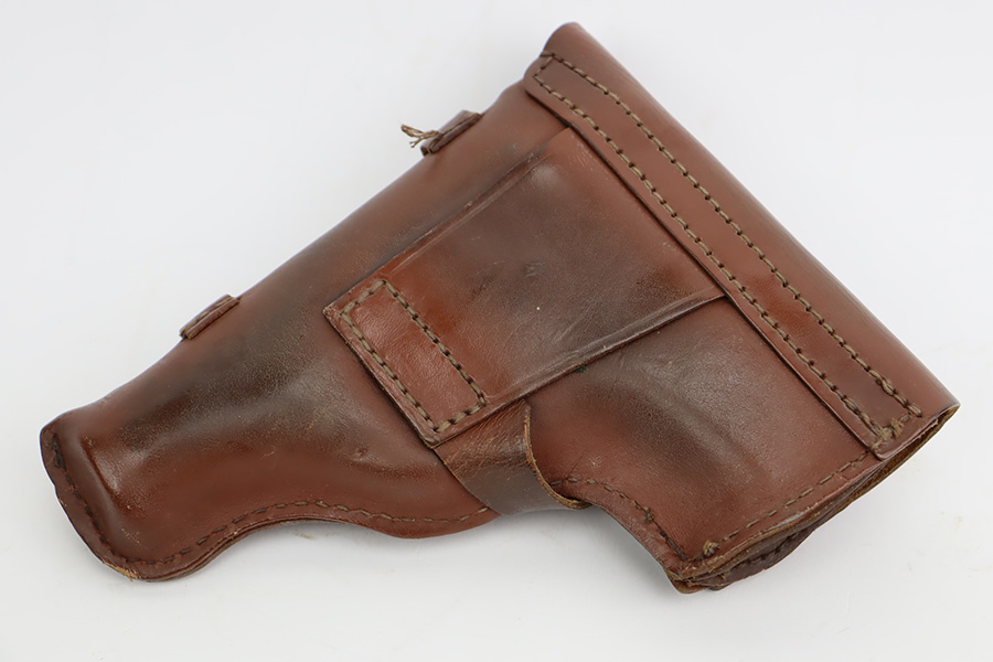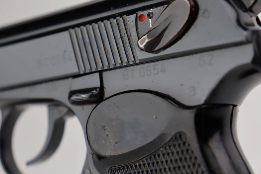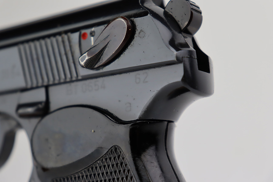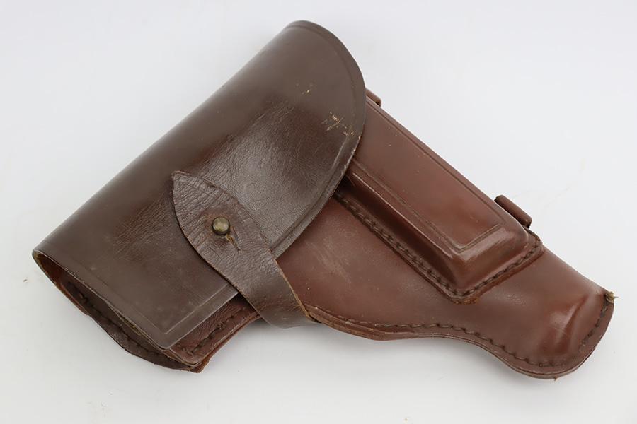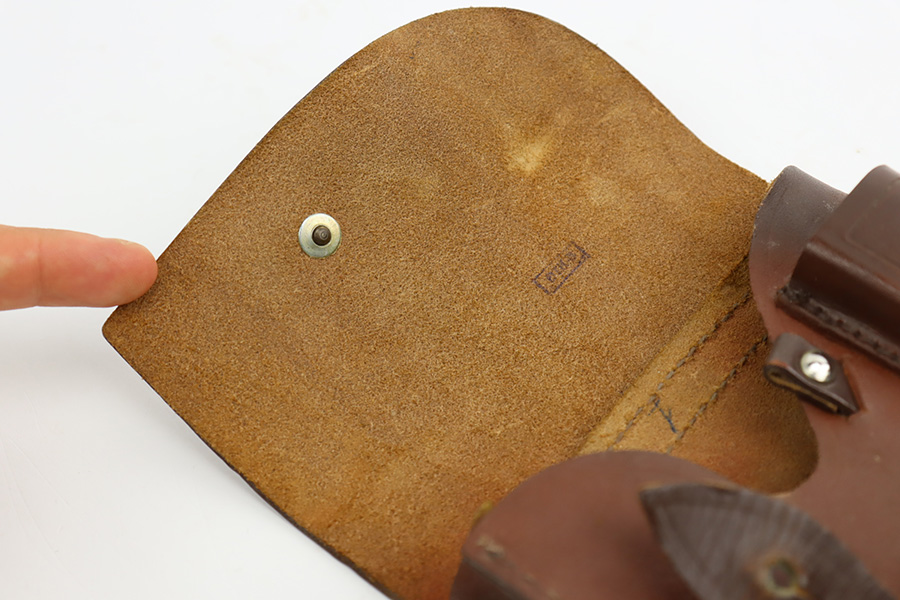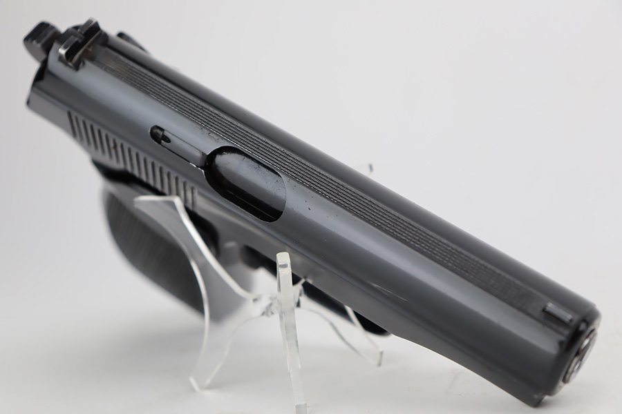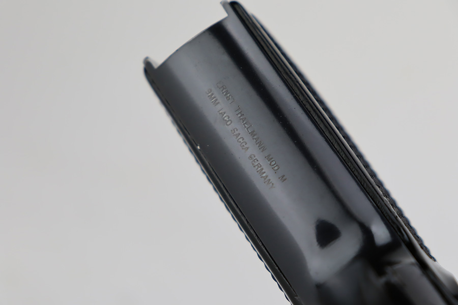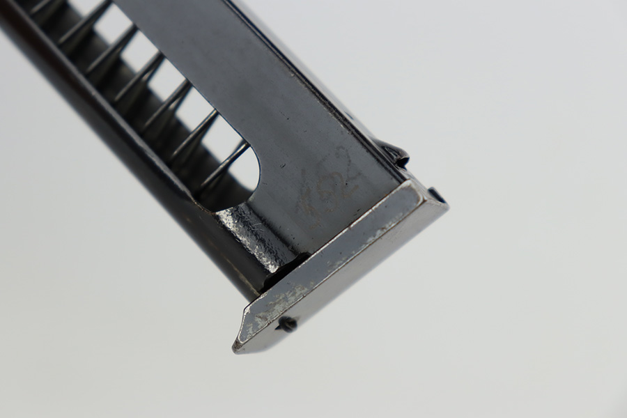 11/2/23 – This is a near-mint example of a Makarov made in East Germany in 1962. It is all matching but has an import mark on the front strap. It has retained nearly all of its high polish finish with minor muzzle wear, some tiny scratches on the slide, and a small dot of oxidation on the right side of the slide. Fitted with excellent black bakelite grips. Comes with two period-correct but mismatched magazines and an excellent leather holster. Mint bore.