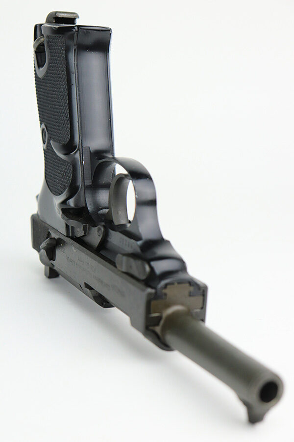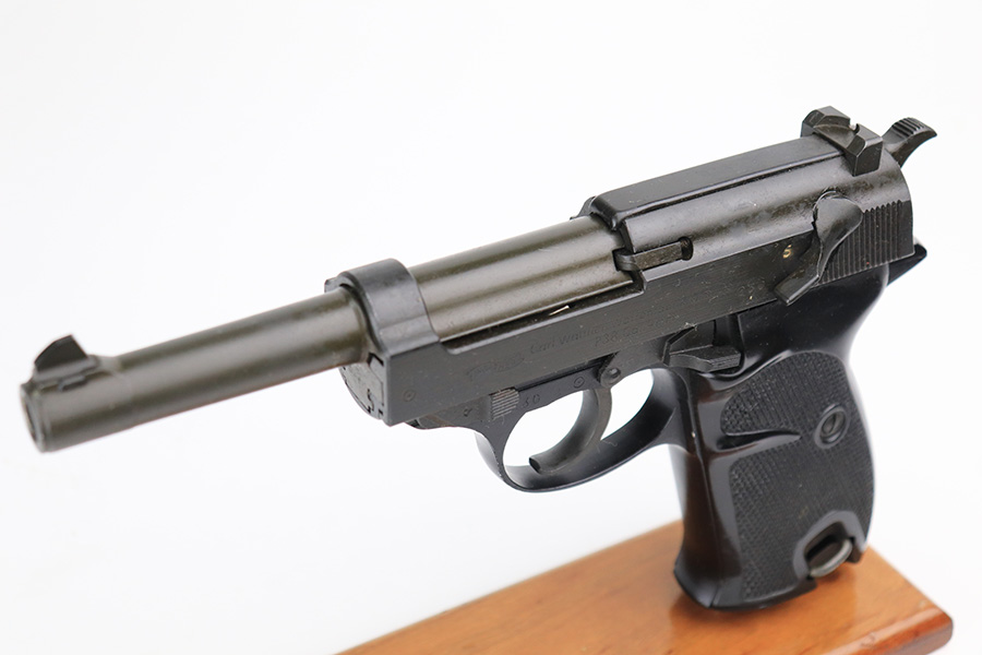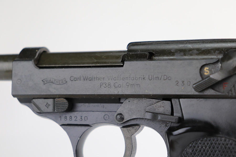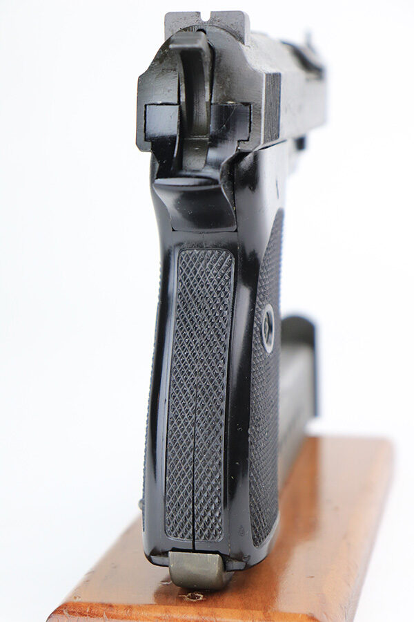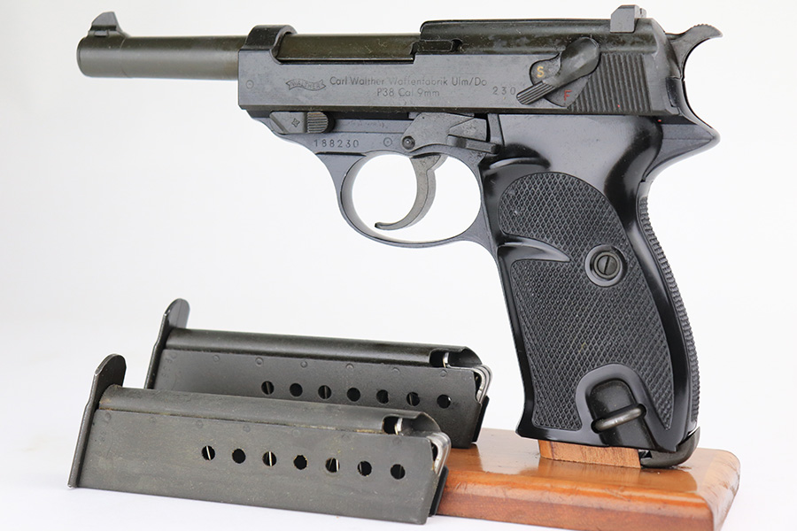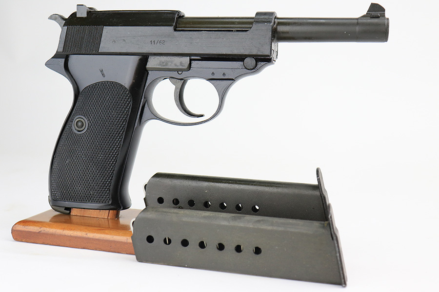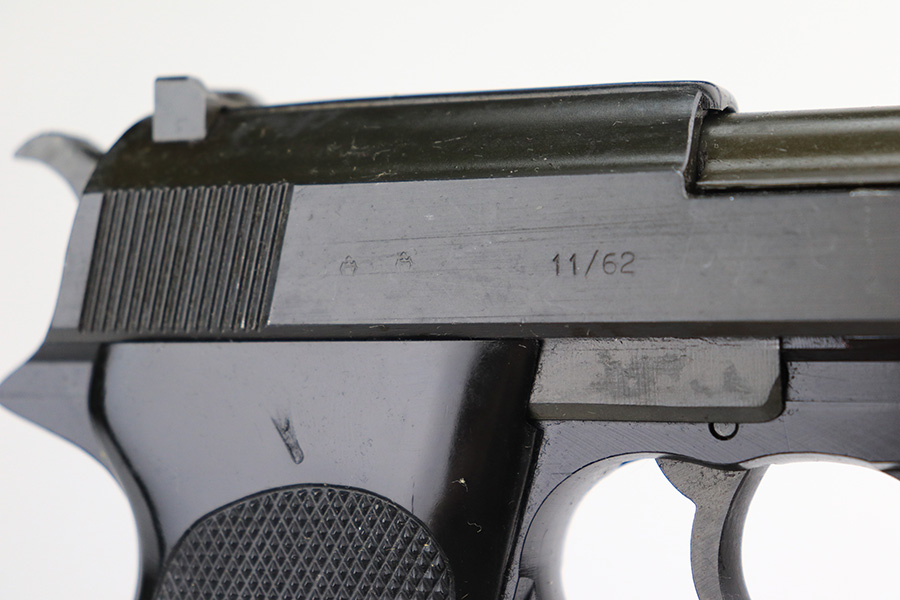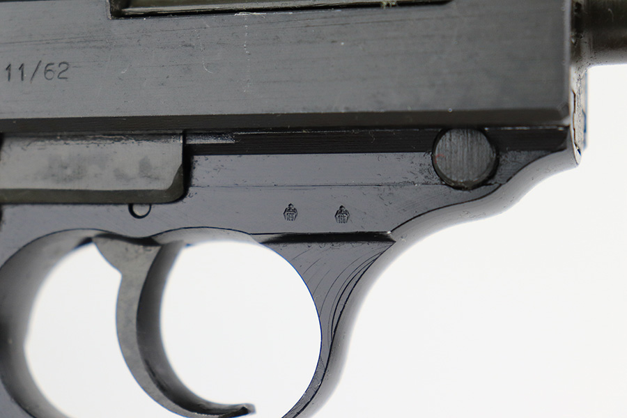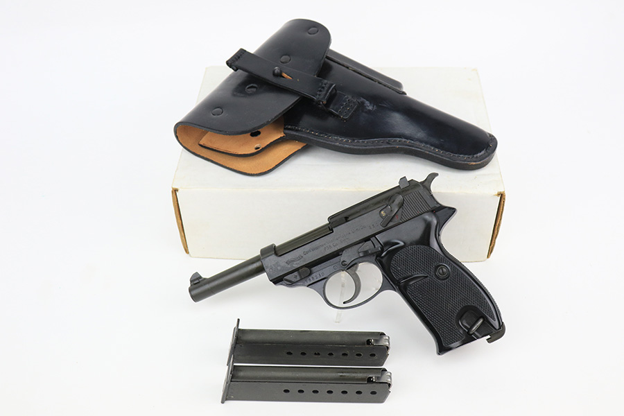 1/6/22 – This is a near-mint example of a Walther P.38 manufactured in November of 1962. It is all matching and has the proper West German proofs. Very faint import mark on the left side of the frame. It comes as a rig with a mint black leather holster and two proper magazines. There is virtually no actual finish loss on the gun, but there is splotchy, oily discoloration on all of the phosphate parts. Comes with excellent black plastic grips – one small blemish on the right side. The bore is mint.