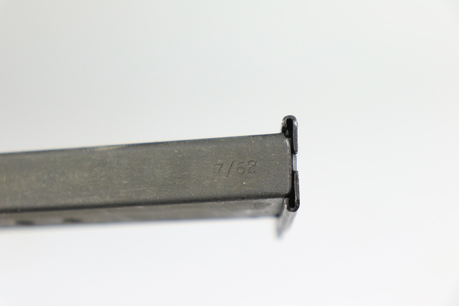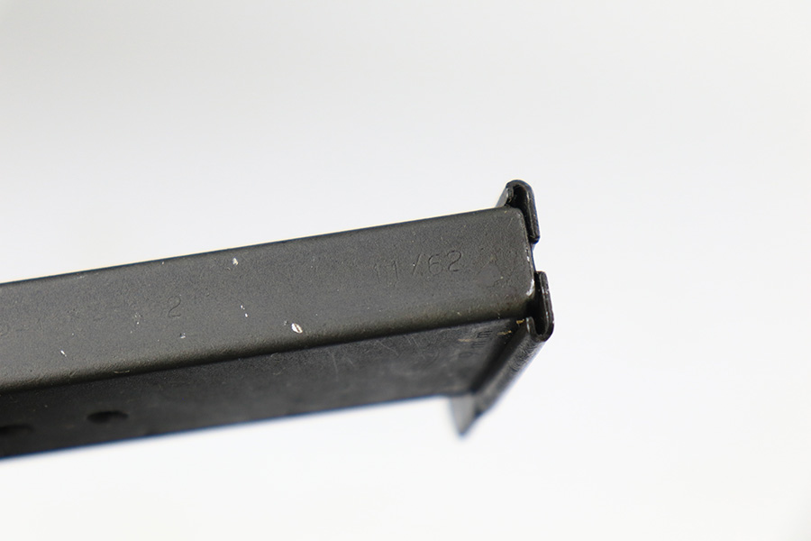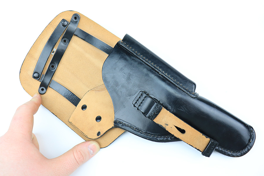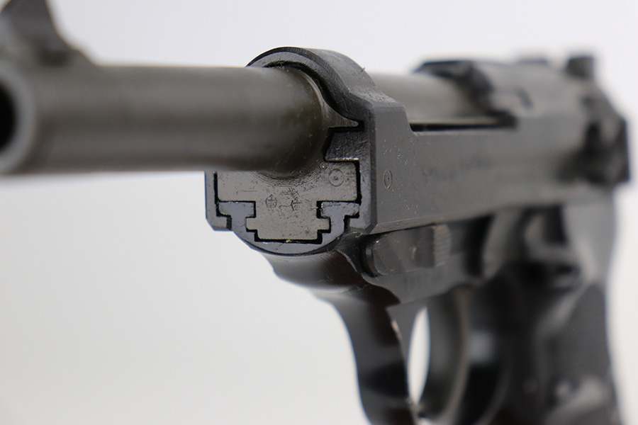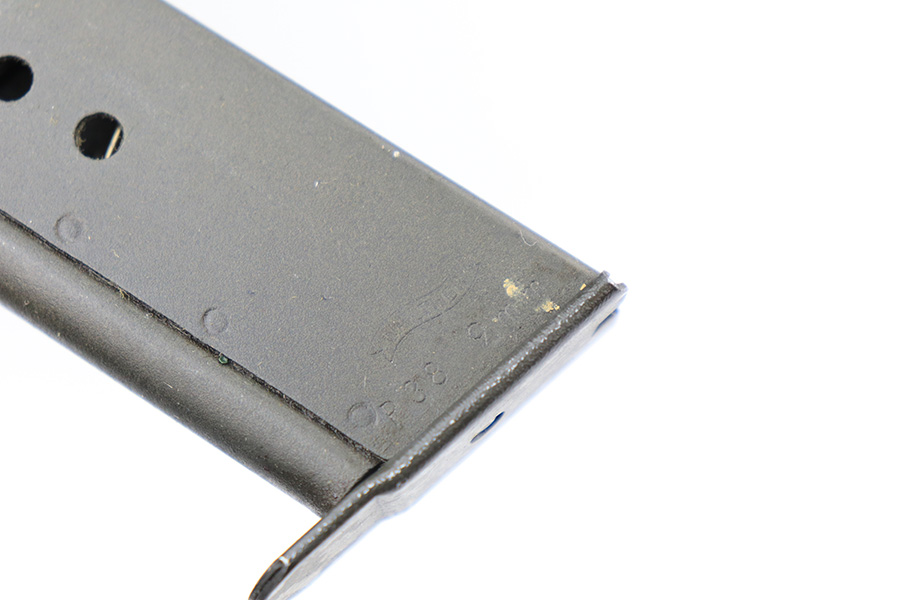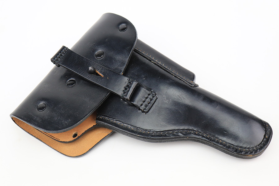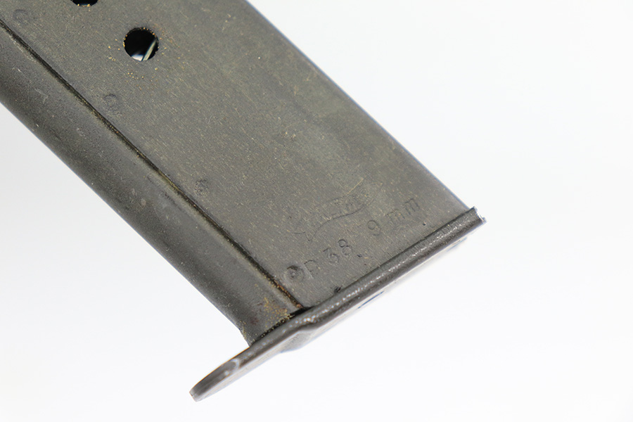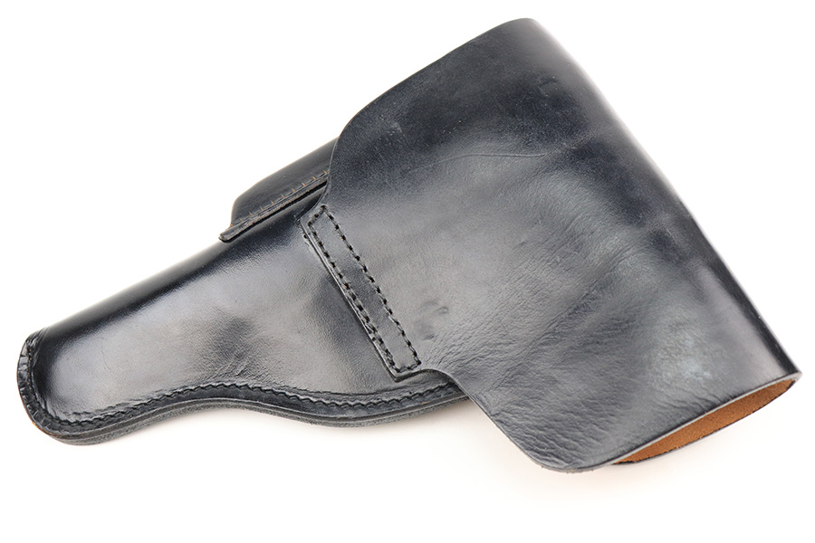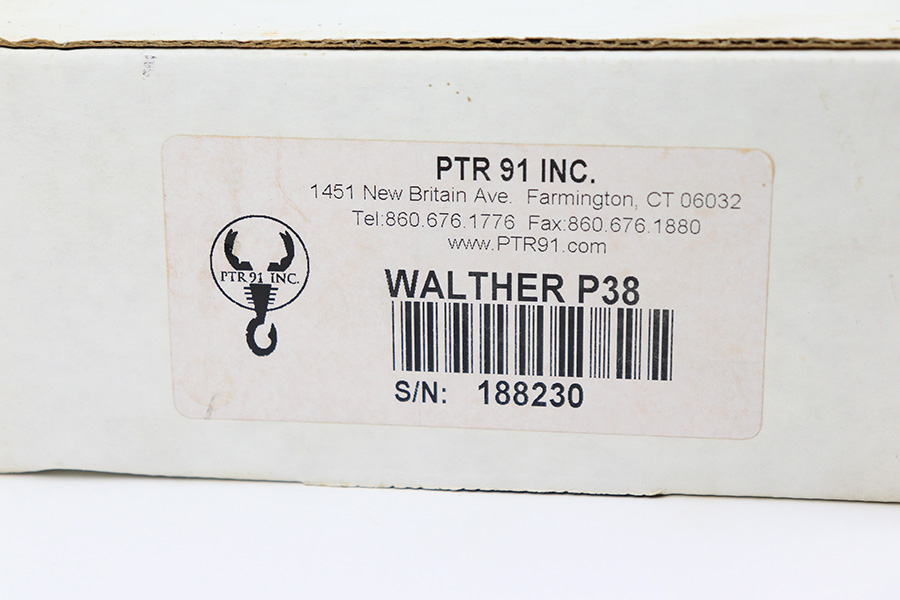 1/6/22 – This is a near-mint example of a Walther P.38 manufactured in November of 1962. It is all matching and has the proper West German proofs. Very faint import mark on the left side of the frame. It comes as a rig with a mint black leather holster and two proper magazines. There is virtually no actual finish loss on the gun, but there is splotchy, oily discoloration on all of the phosphate parts. Comes with excellent black plastic grips – one small blemish on the right side. The bore is mint.