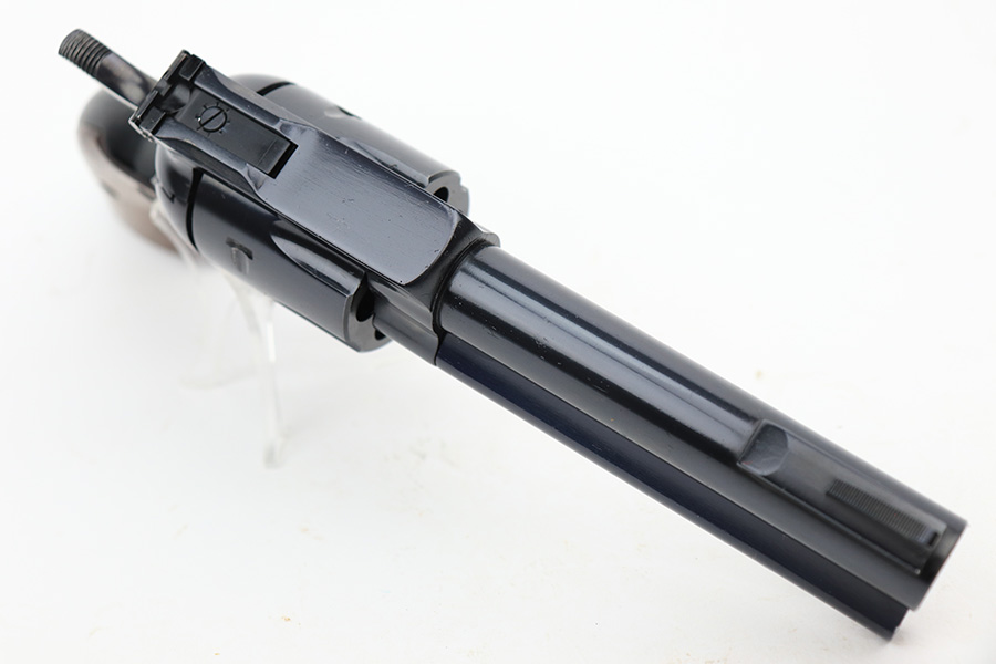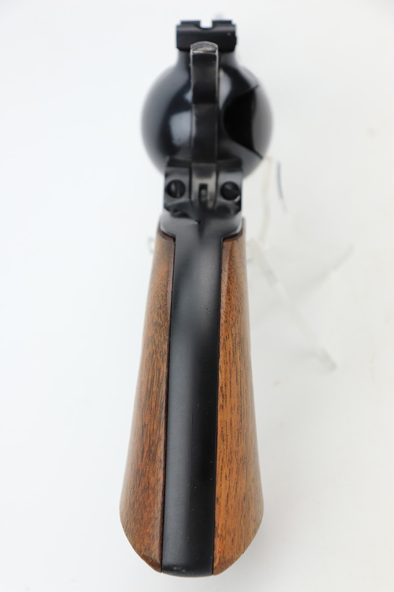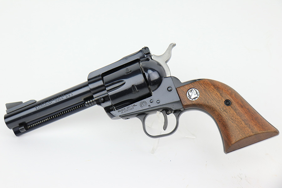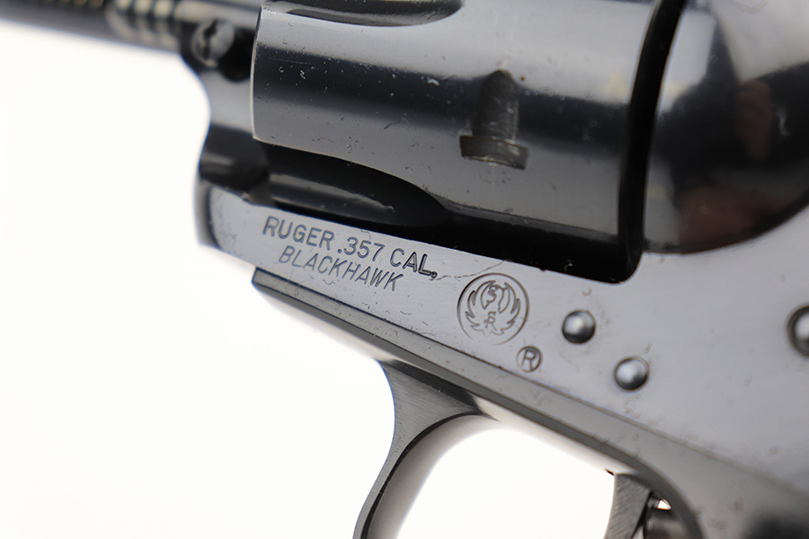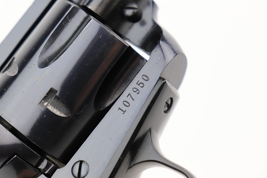 5/8/23 – This is a near-mint example of a Ruger Blackhawk revolver, manufactured in 1967 and chambered in .357 Magnum. 4.5″ barrel. No added safety bar. It has retained nearly all of its original finish with just a few tiny handling marks along the ejector rod and on the butt of the frame. Barely a hint of a roll mark on the cylinder. Fitted with excellent wood grips. Like-new bore. The cylinder is tight, and the action is very smooth.
