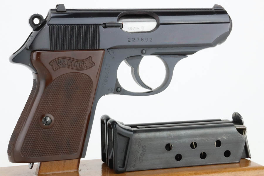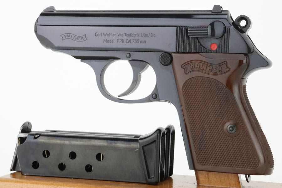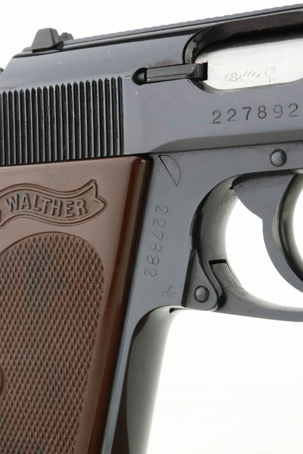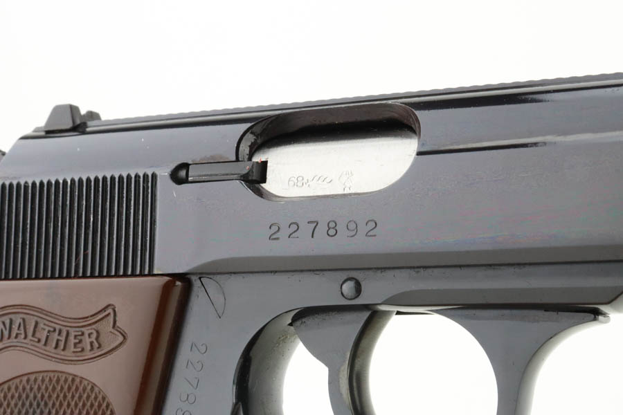 7/19/24 – This is a mint example of a Walther PPK, manufactured in 1968 and chambered in 7.65mm. All matching with the proper West German proofs. No import marks. The gun is in like-new condition with no signs of wear or finish loss. Fitted with brown plastic grips. Mint bore. It comes with two finger extension magazines, one flat bottom magazine, and a reprinted owners manual.