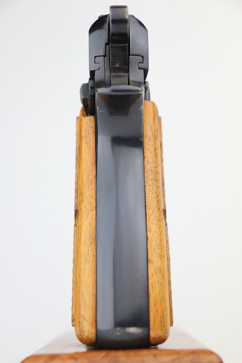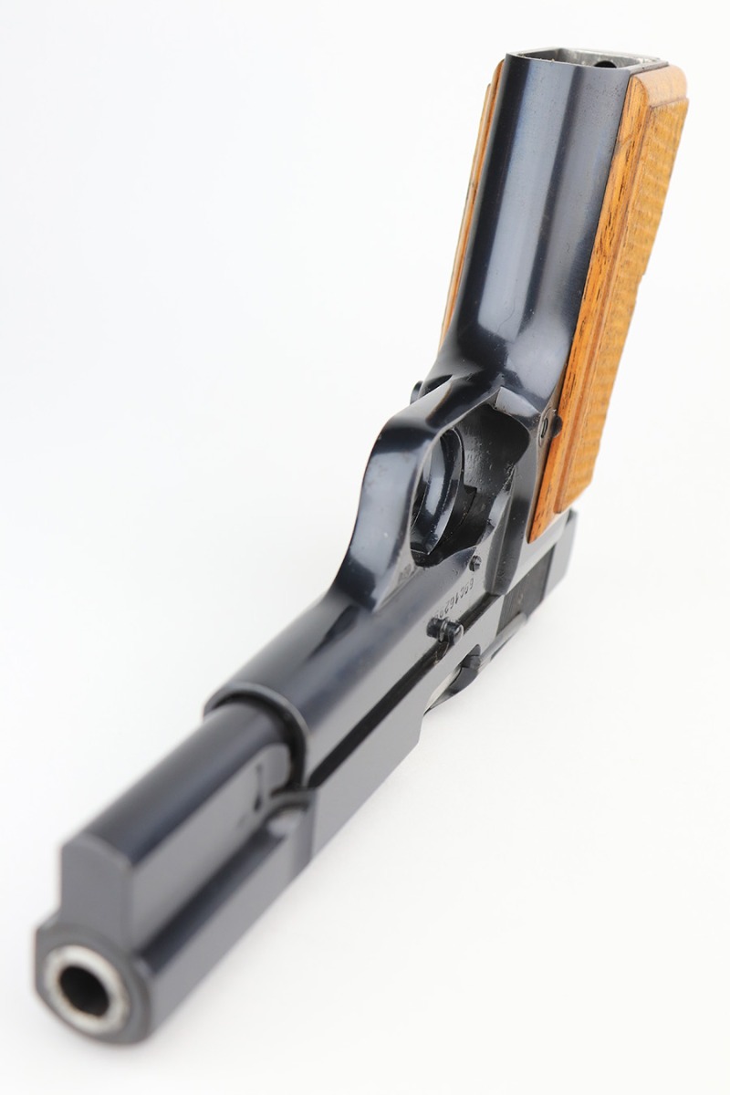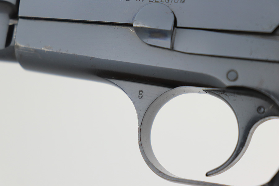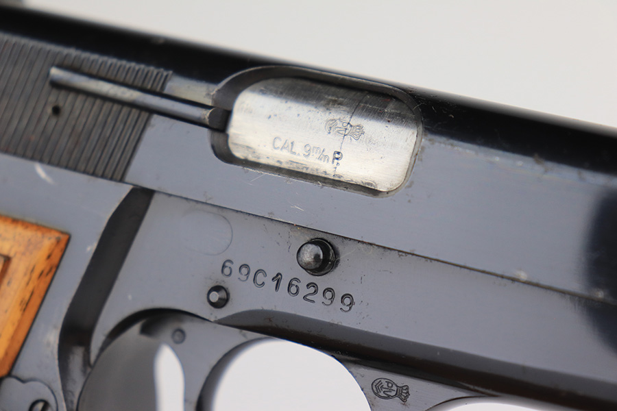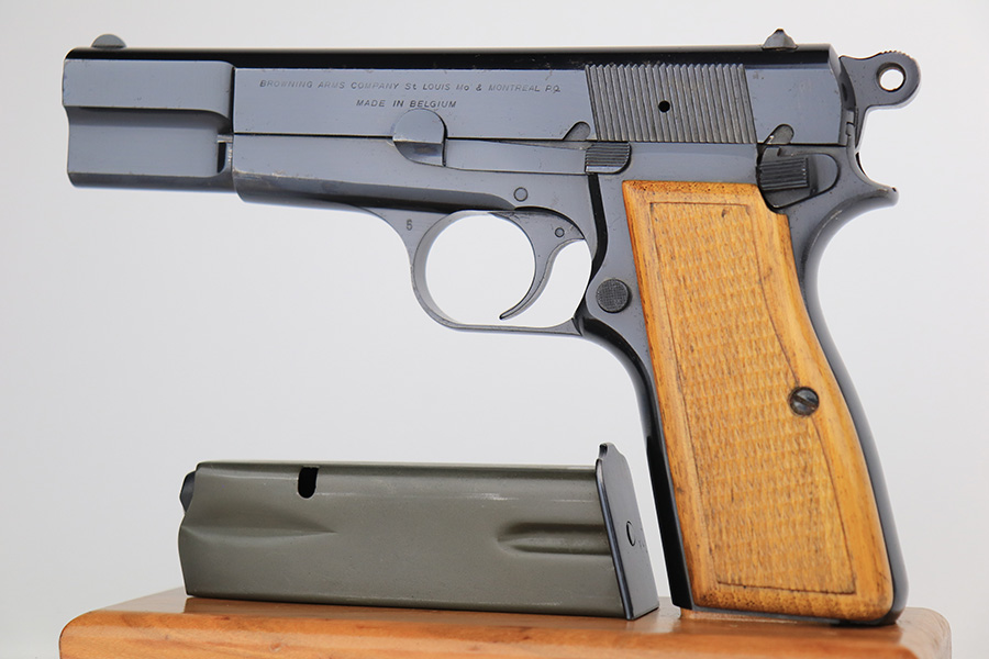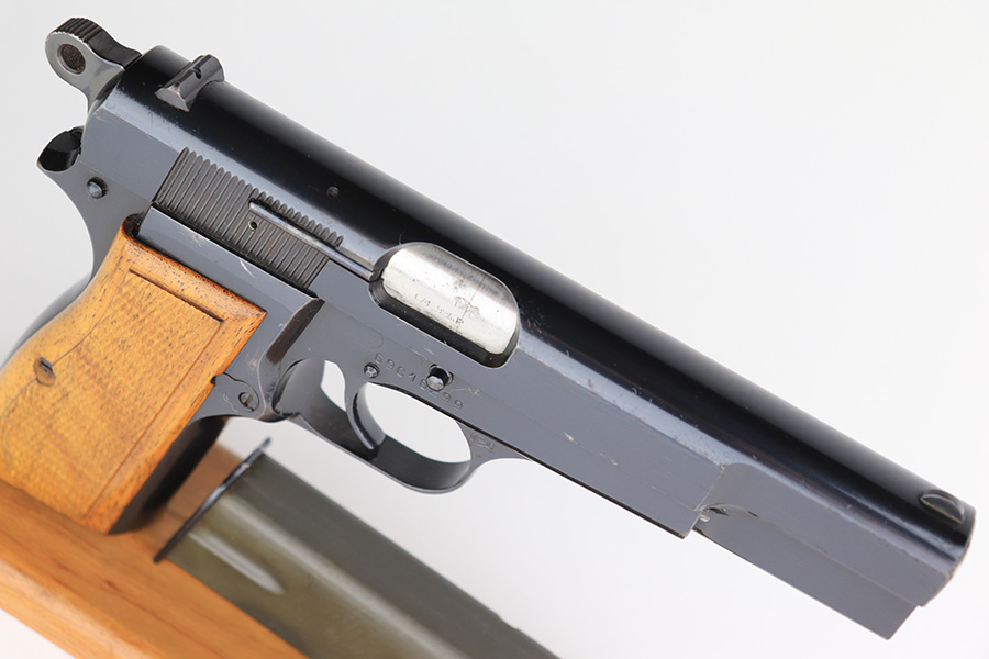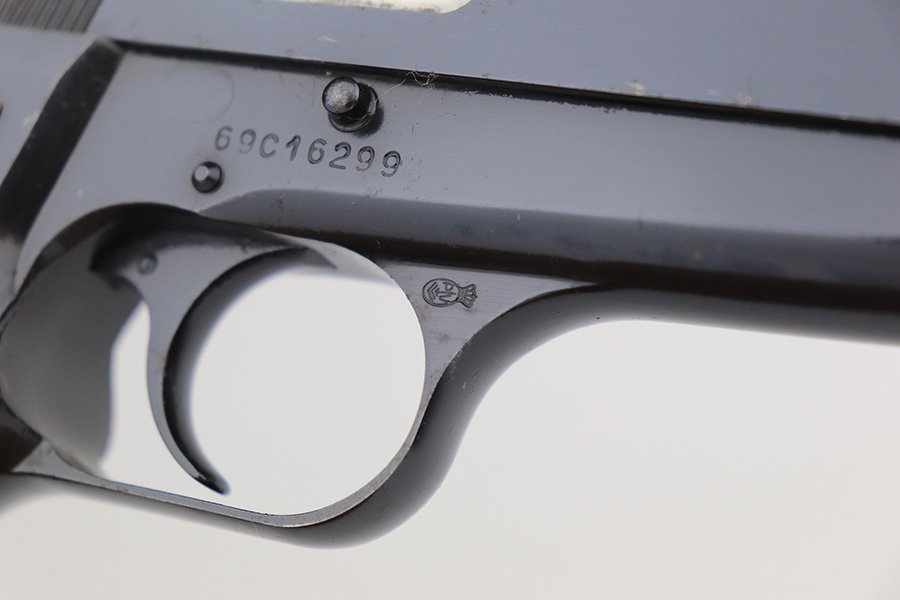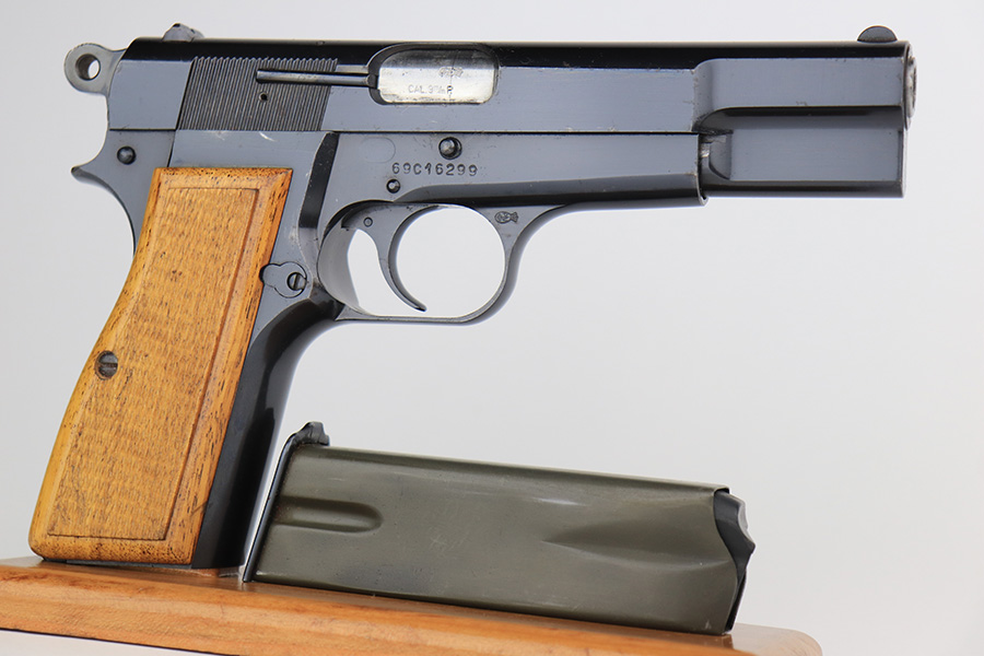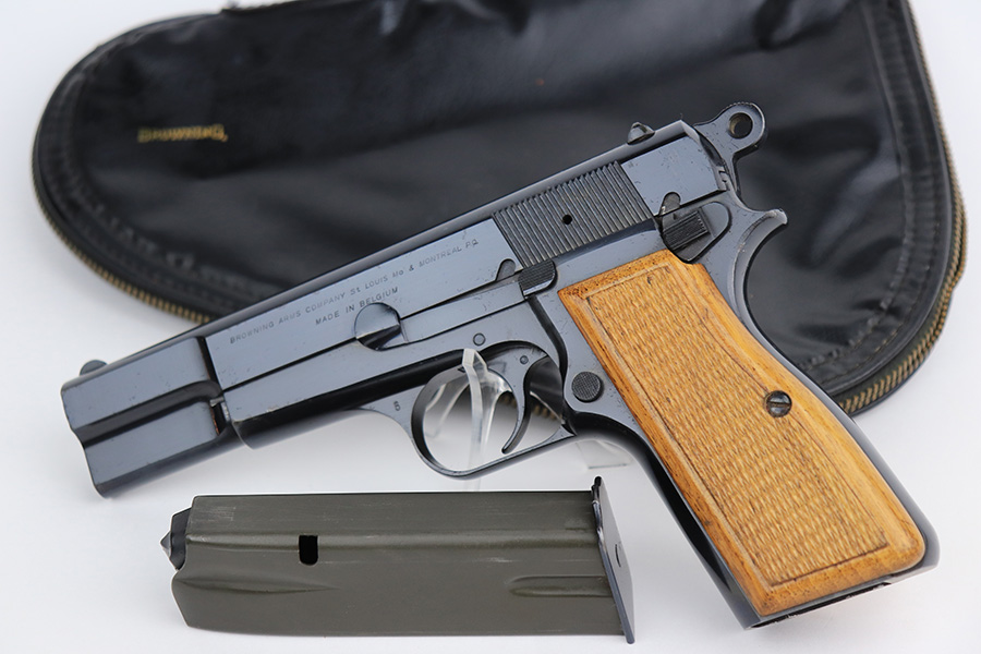 4/4/23 – This is a minty example of an early “C Series” FN Browning Hi-Power manufactured in Belgium in 1969. It is all matching with the proper proofs. Comes with one correct magazine and its original Browning soft case. The gun has retained nearly all of its original high polish finish, with some tiny dots of discoloration around the high edges of the slide. Minty blond wood grips. Pristine bore.