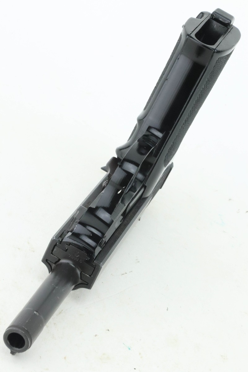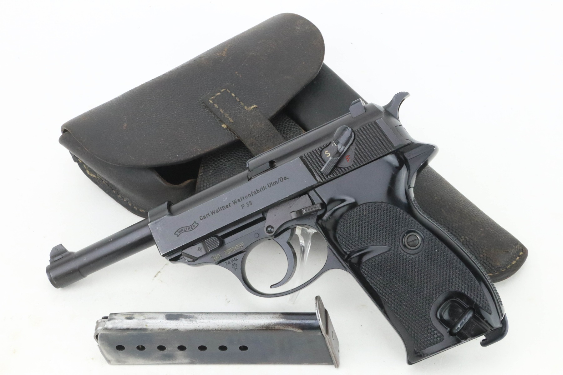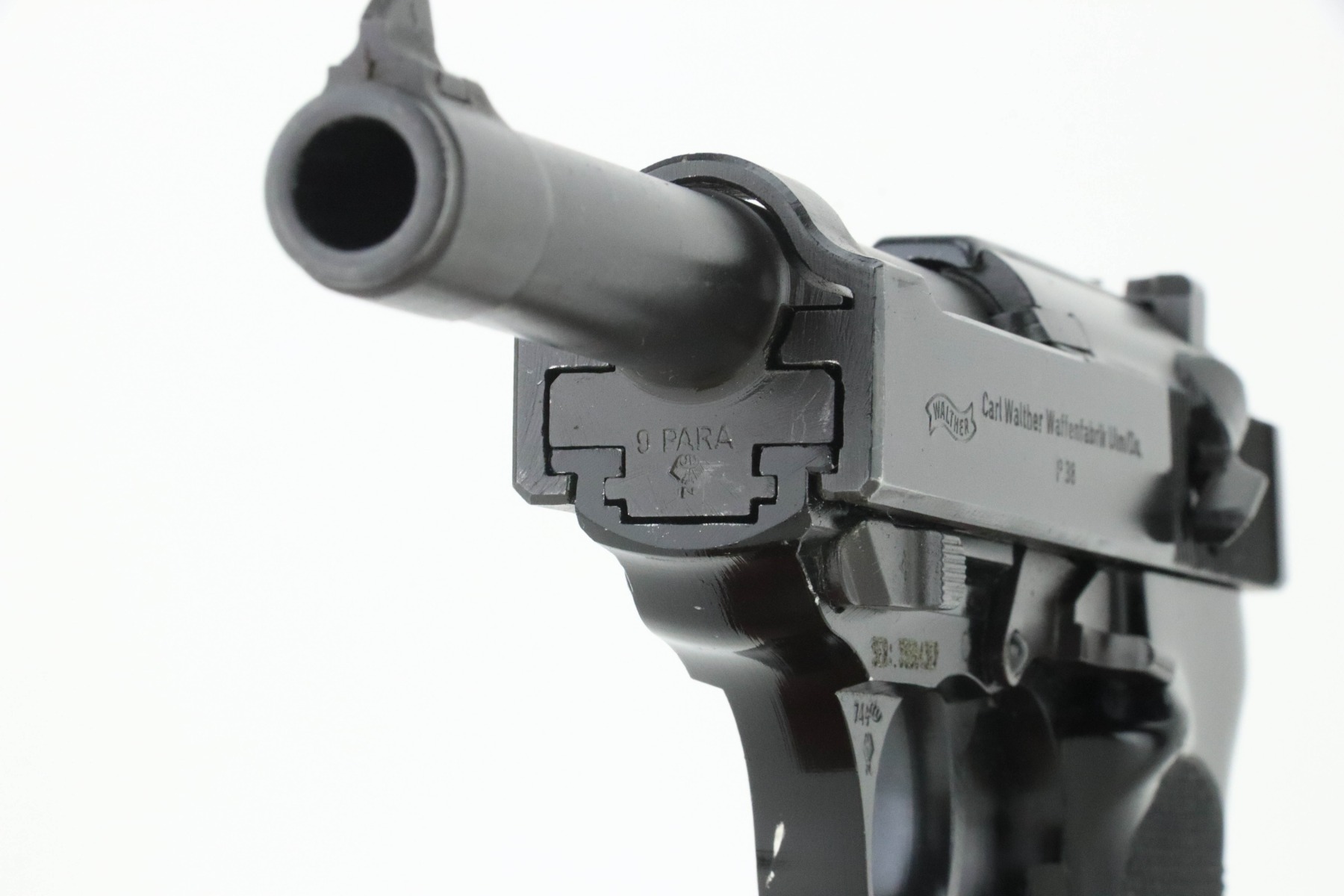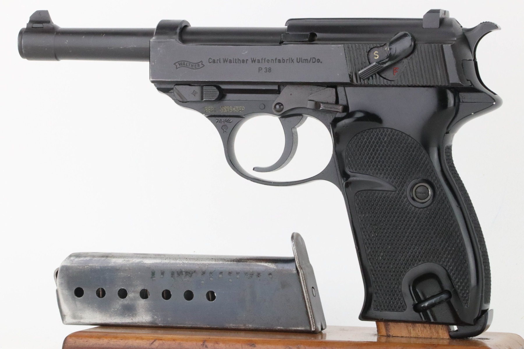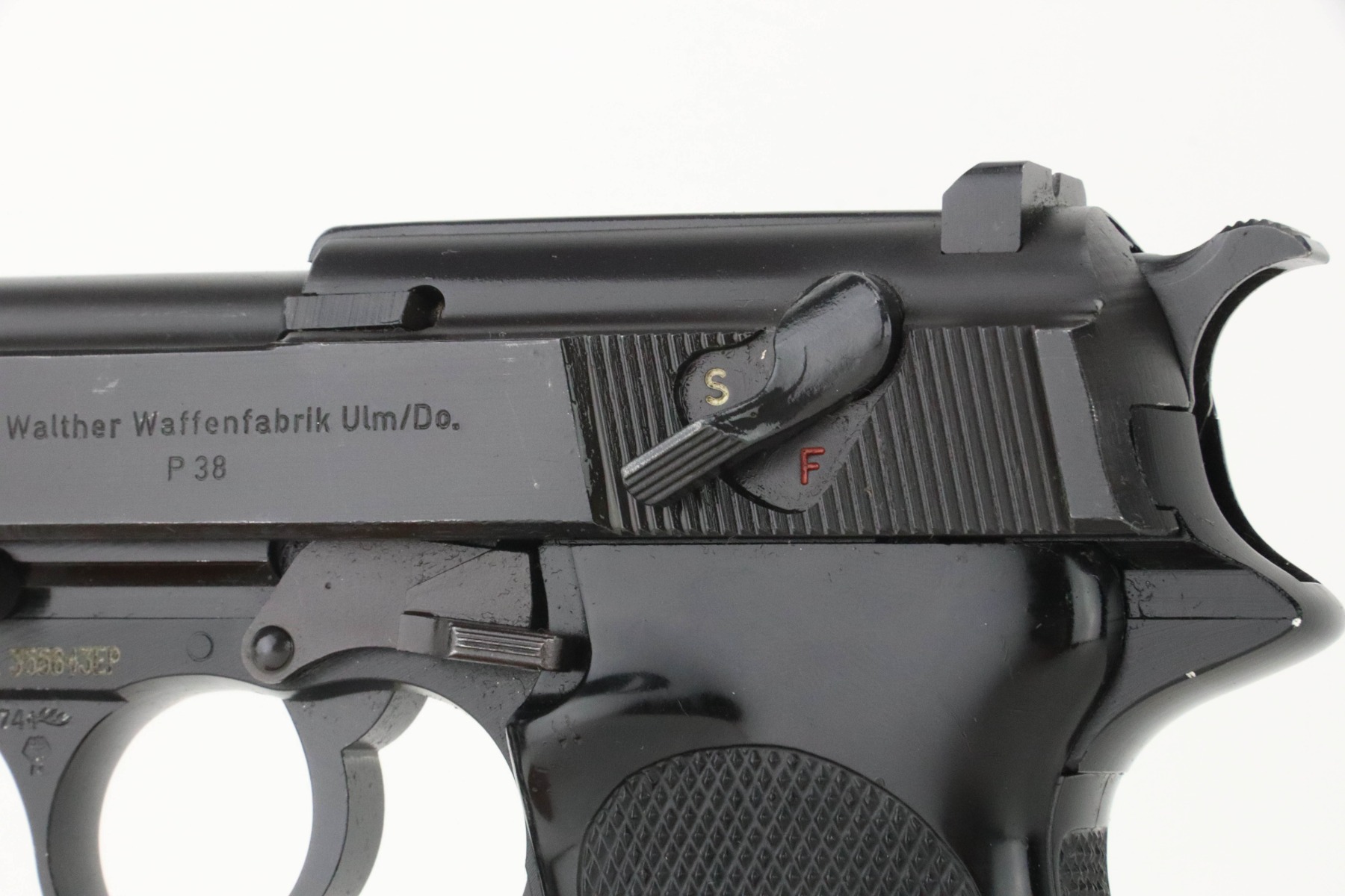 10/16/24 – This is a minty example of a Walther P.38 from 1974. There is an added serial number on the frame and an import mark on the underside of the slide. Comes with one magazine and a pebble grain leather holster. The gun itself has retained nearly all of its finish, but there are a few tiny marks and scratches here and there. Fitted with black plastic grips. Mint bore. De-cocker is functional.