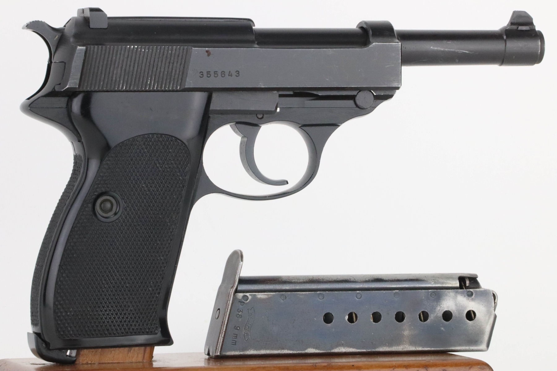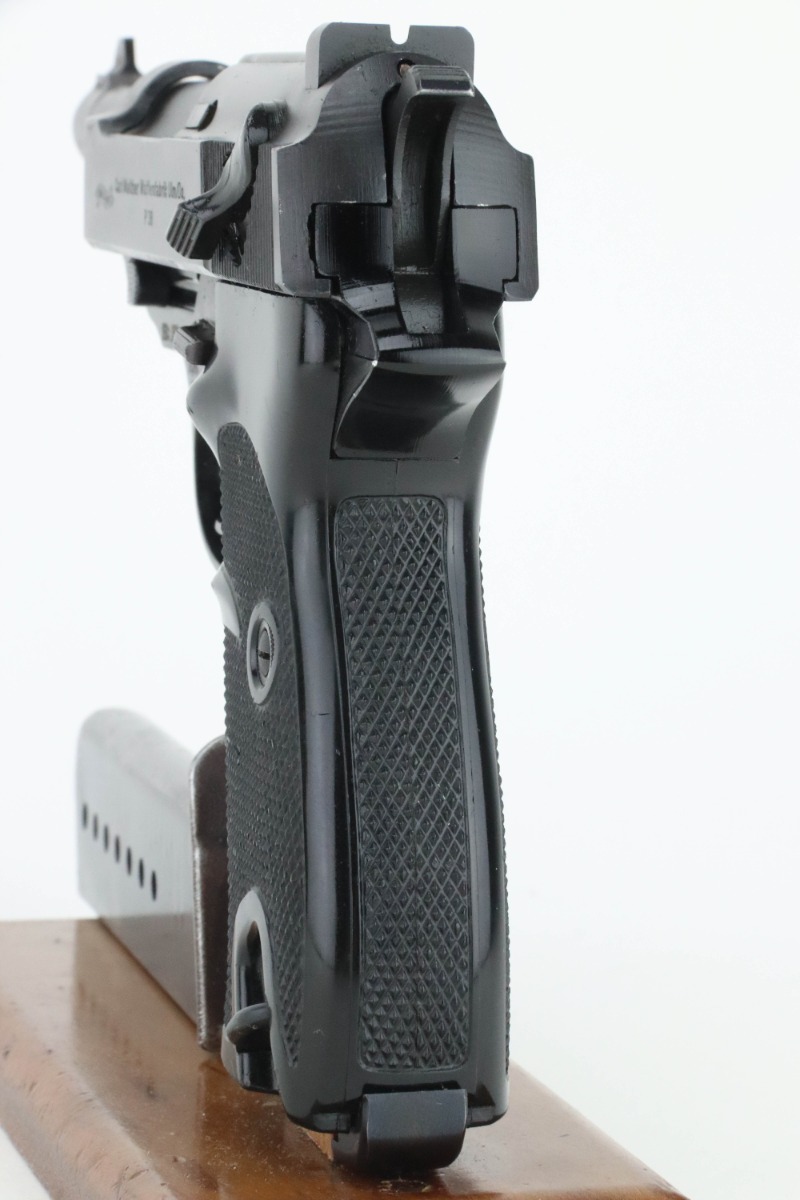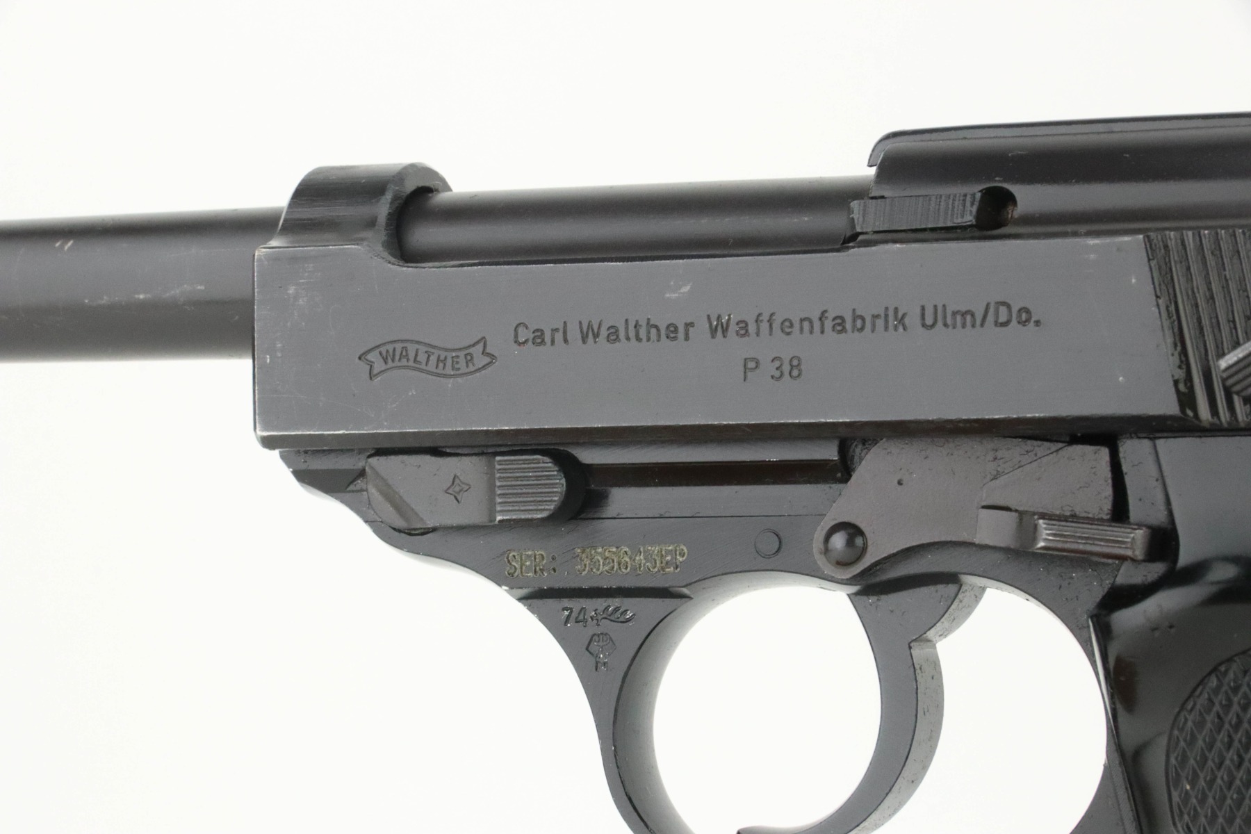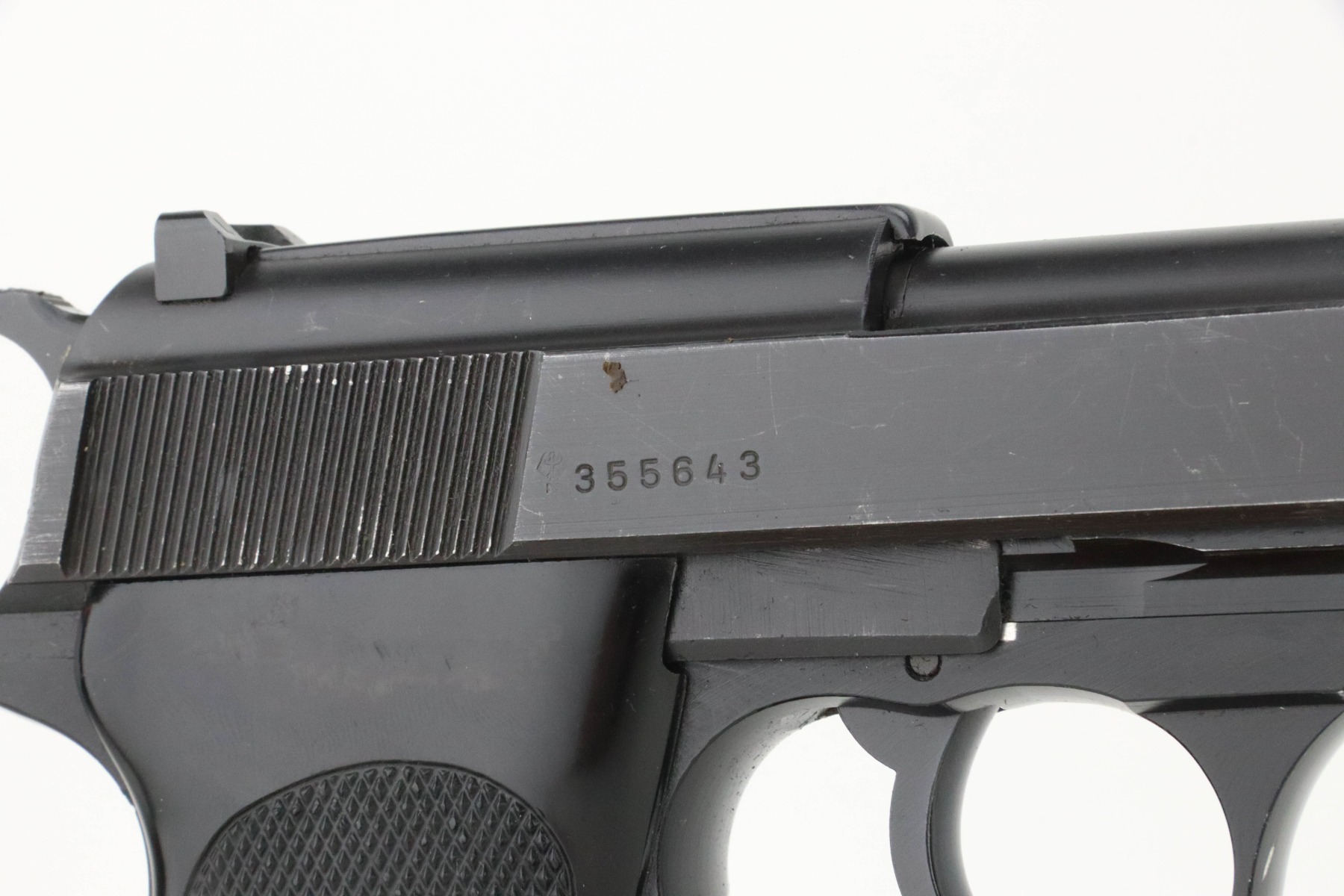 10/16/24 – This is a minty example of a Walther P.38 from 1974. There is an added serial number on the frame and an import mark on the underside of the slide. Comes with one magazine and a pebble grain leather holster. The gun itself has retained nearly all of its finish, but there are a few tiny marks and scratches here and there. Fitted with black plastic grips. Mint bore. De-cocker is functional.