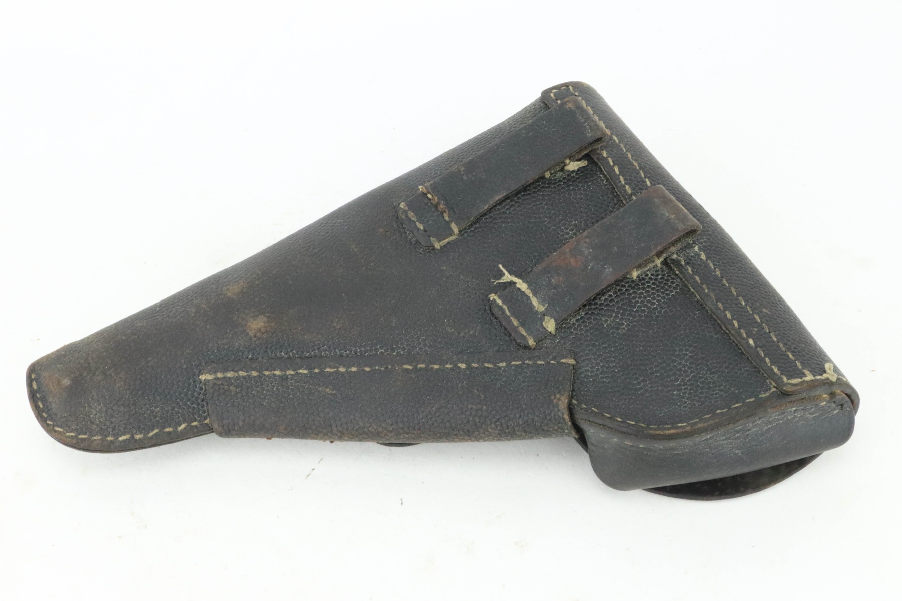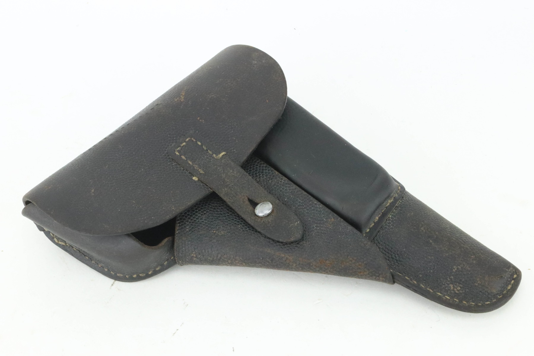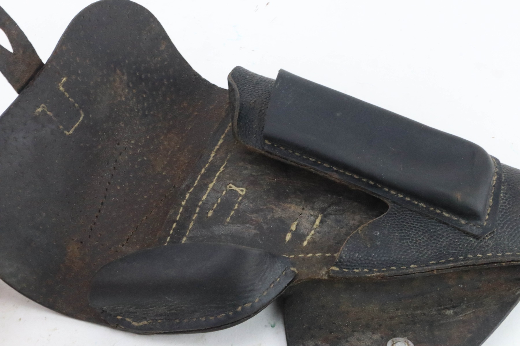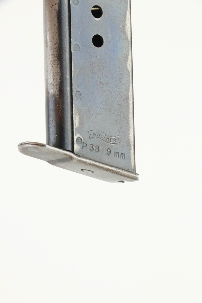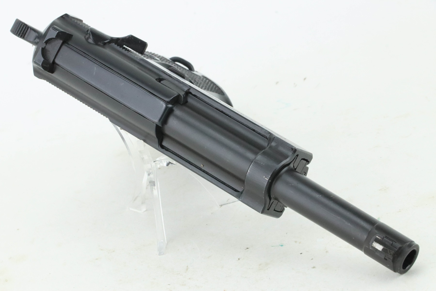 10/16/24 – This is a minty example of a Walther P.38 from 1974. There is an added serial number on the frame and an import mark on the underside of the slide. Comes with one magazine and a pebble grain leather holster. The gun itself has retained nearly all of its finish, but there are a few tiny marks and scratches here and there. Fitted with black plastic grips. Mint bore. De-cocker is functional.