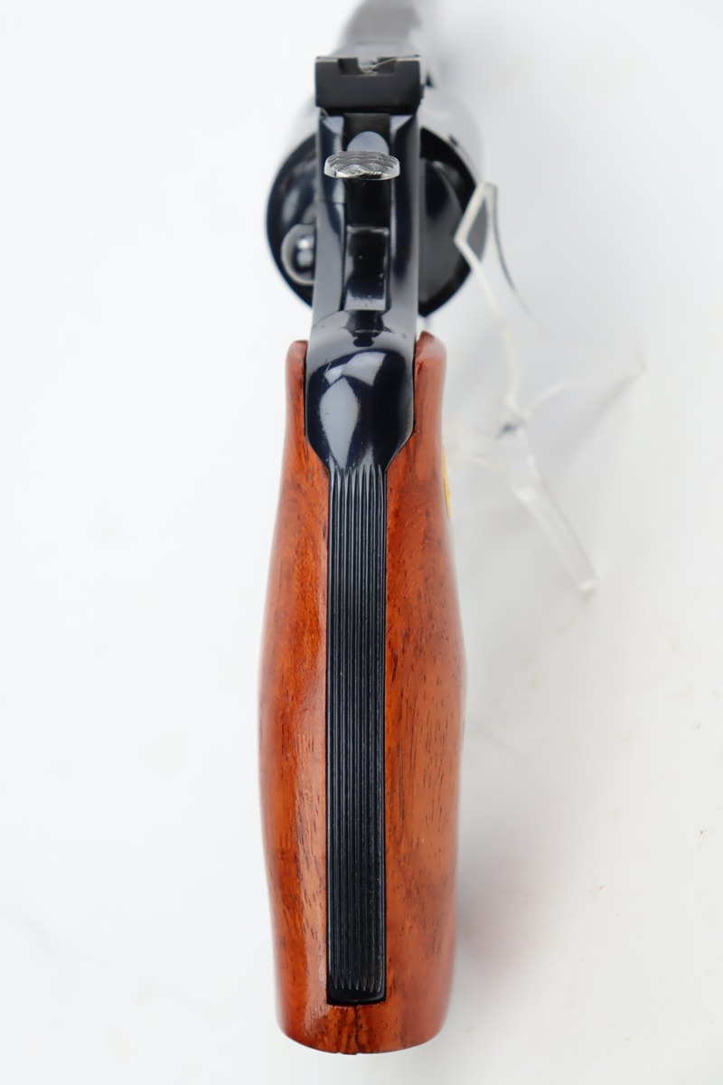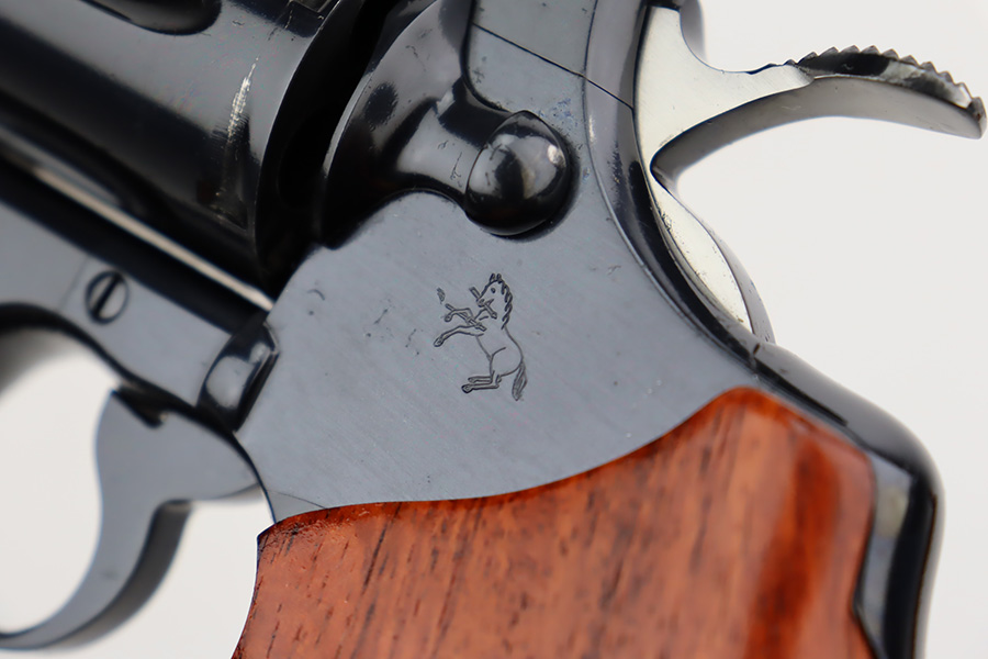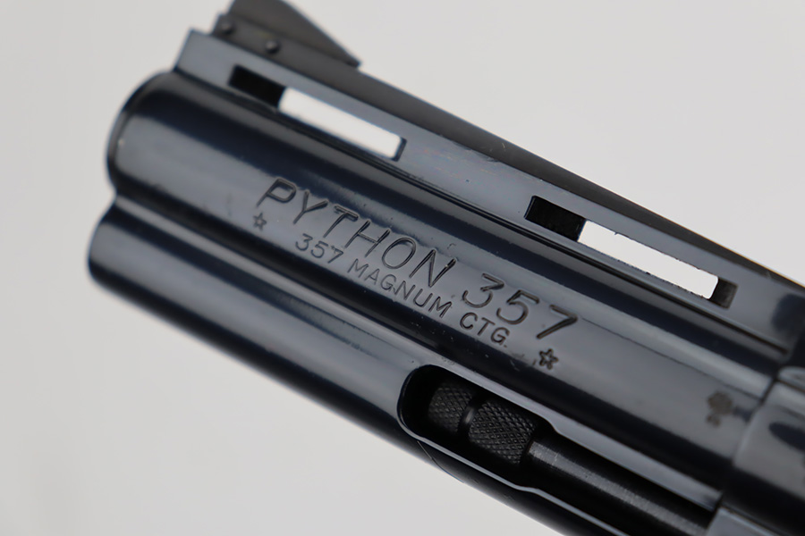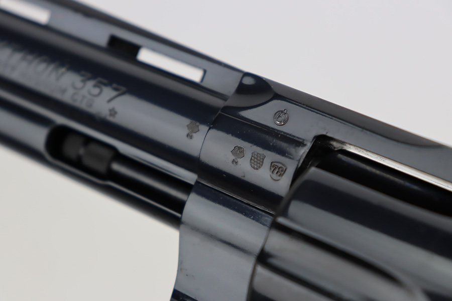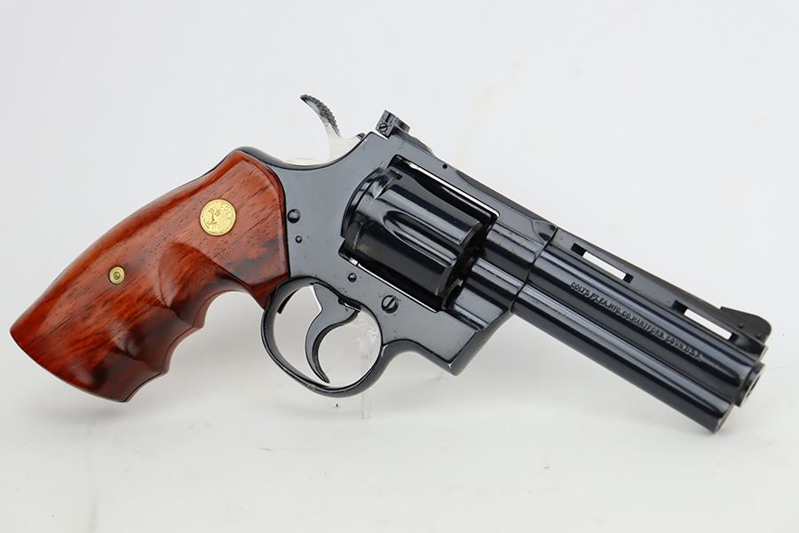 9/20/23 – This is a near-mint example of a Colt Python Revolver, manufactured in 1978 and chambered in .357 Magnum. It is all matching, has a tiny import mark in the well for the ejector rod, and has West German export proofs. It has retained nearly all of its original high polish finish with just a few tiny handling marks here and there and a couple of small dots of wear on the underside of the trigger guard. Fitted with excellent wood grips. Mint bore. The cylinder is tight, and the action is smooth.