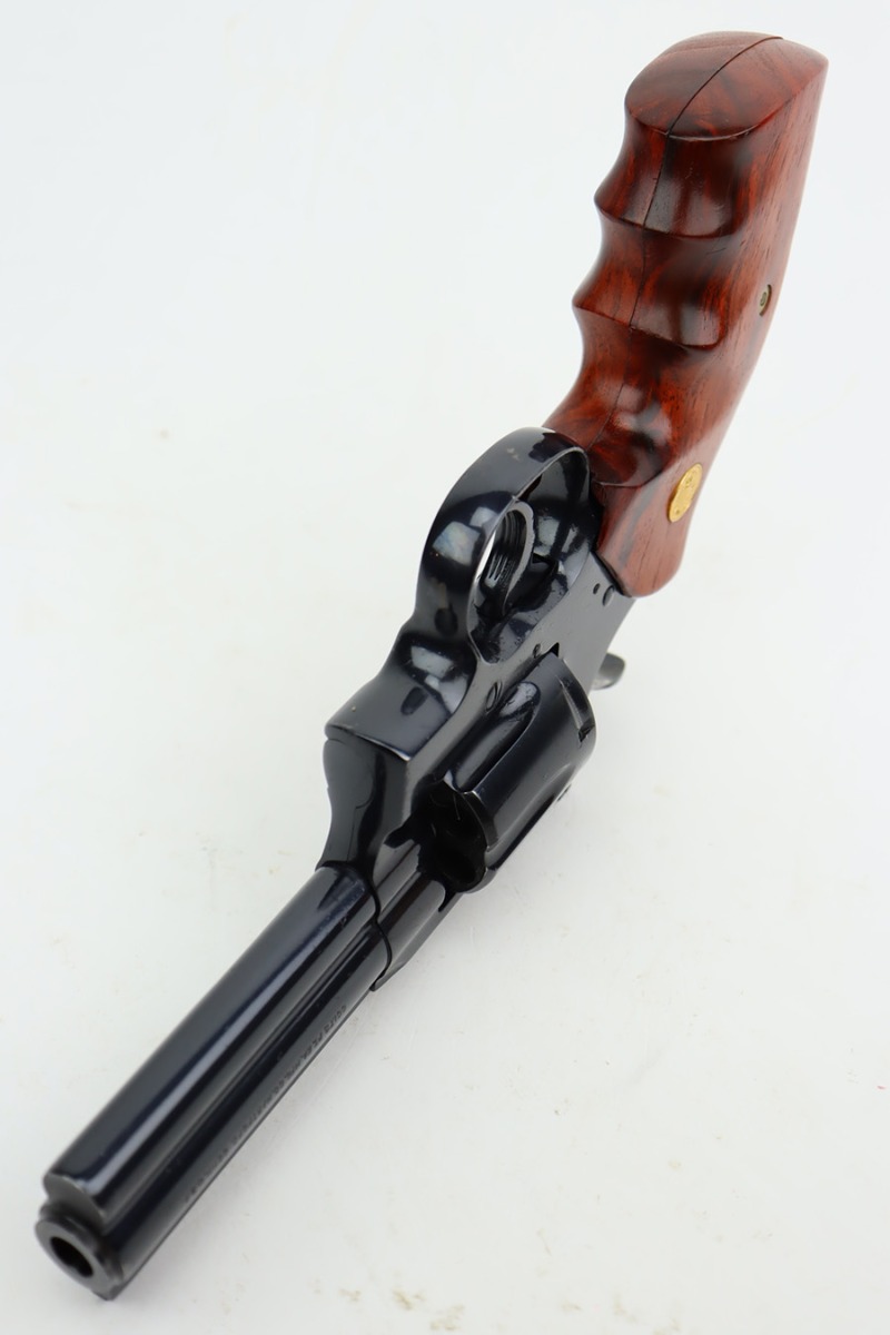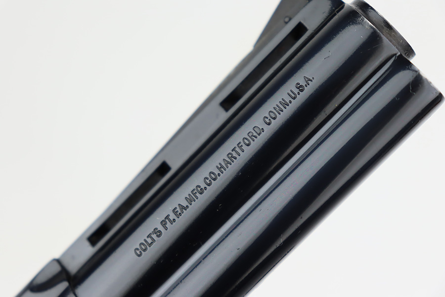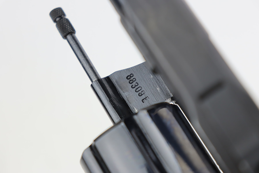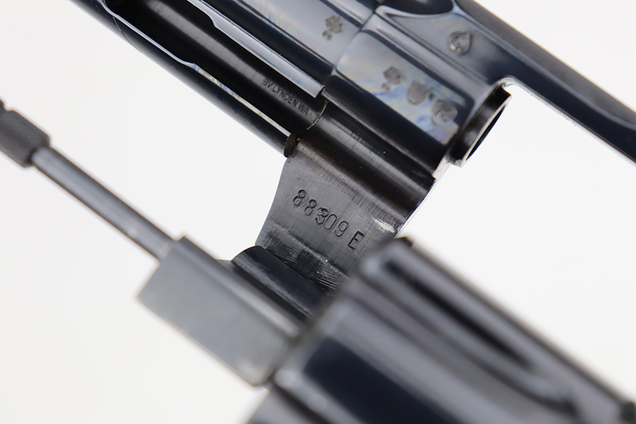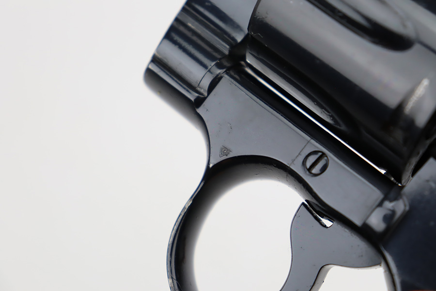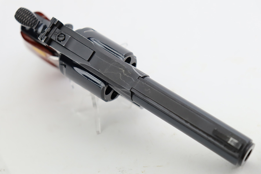 9/20/23 – This is a near-mint example of a Colt Python Revolver, manufactured in 1978 and chambered in .357 Magnum. It is all matching, has a tiny import mark in the well for the ejector rod, and has West German export proofs. It has retained nearly all of its original high polish finish with just a few tiny handling marks here and there and a couple of small dots of wear on the underside of the trigger guard. Fitted with excellent wood grips. Mint bore. The cylinder is tight, and the action is smooth.