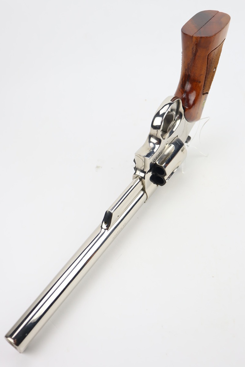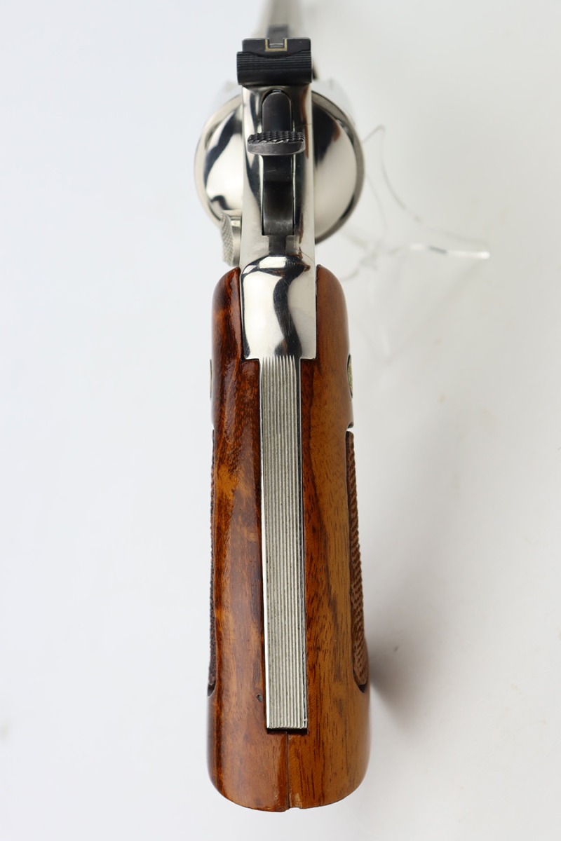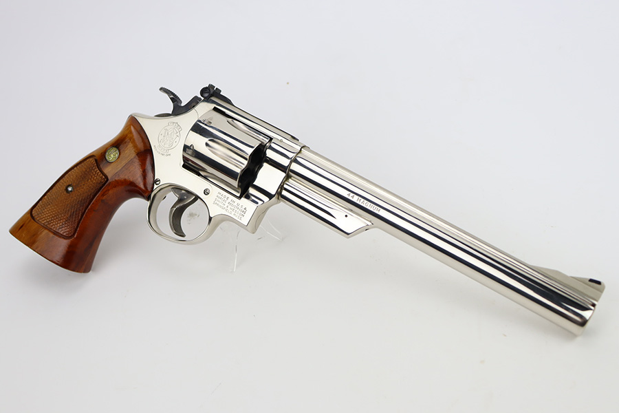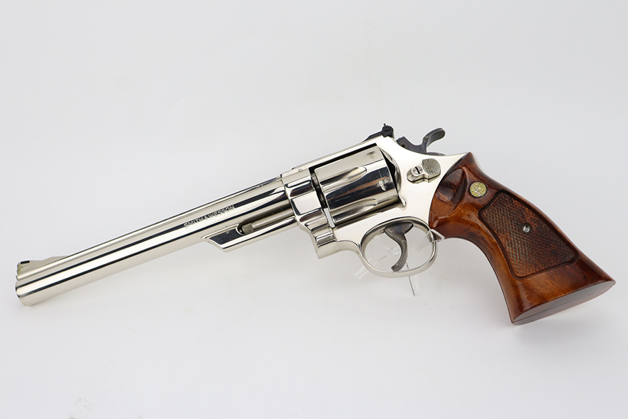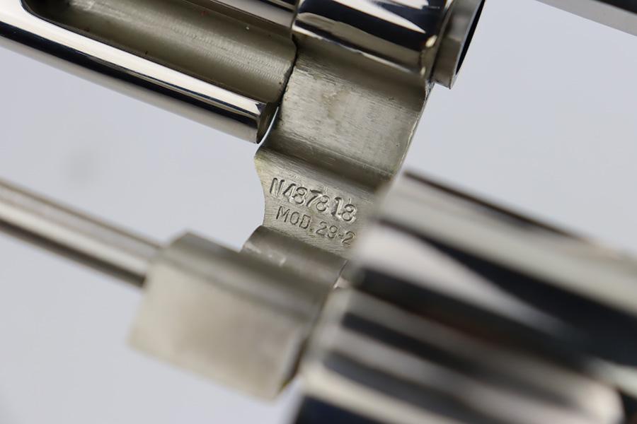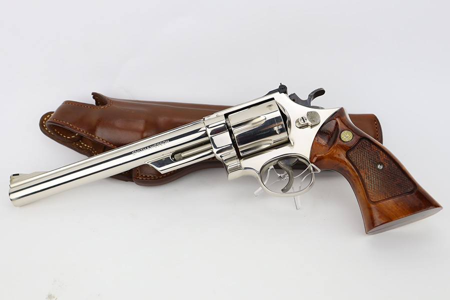 10/18/23 – This is a near-mint example of a Smith & Wesson Model 29-2 revolver, manufactured in 1978 and chambered in .44 Magnum. 8.25″ barrel. It is all matching with a really nice nickeled finish. There are almost no signs of wear or use except for some tiny micro-scratches and a very light roll mark on the cylinder. Fitted with beautiful checkered wood grips and comes with an excellent tan leather holster. The bore is like-new.
