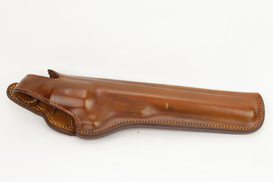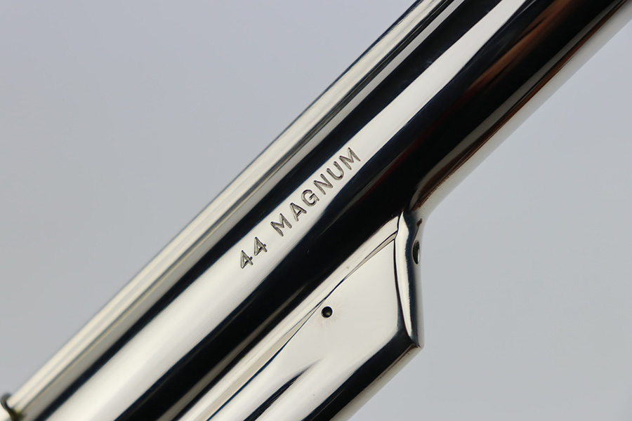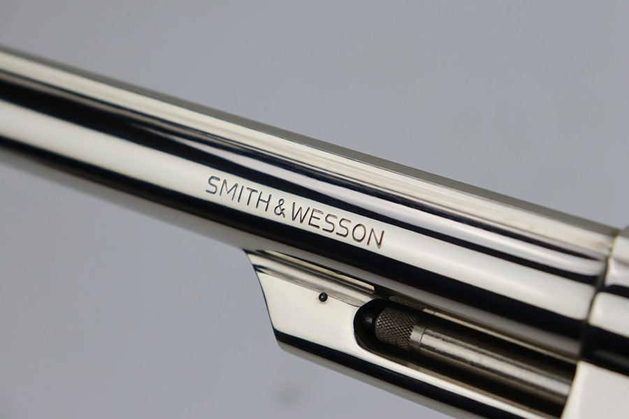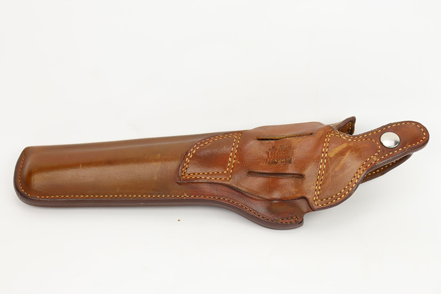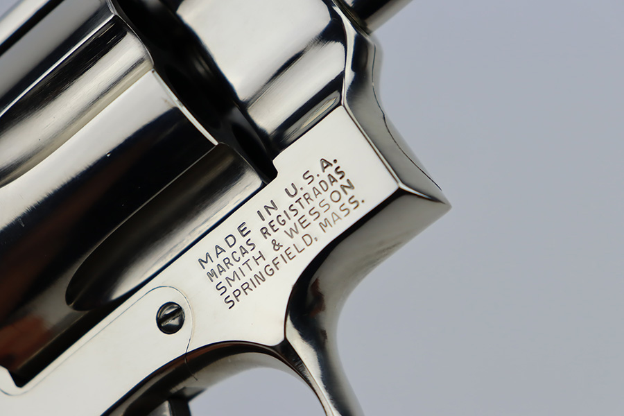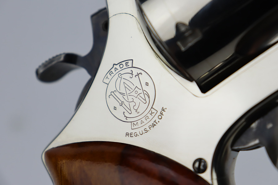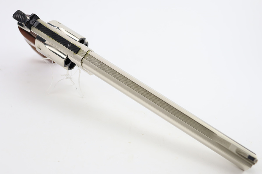 10/18/23 – This is a near-mint example of a Smith & Wesson Model 29-2 revolver, manufactured in 1978 and chambered in .44 Magnum. 8.25″ barrel. It is all matching with a really nice nickeled finish. There are almost no signs of wear or use except for some tiny micro-scratches and a very light roll mark on the cylinder. Fitted with beautiful checkered wood grips and comes with an excellent tan leather holster. The bore is like-new.