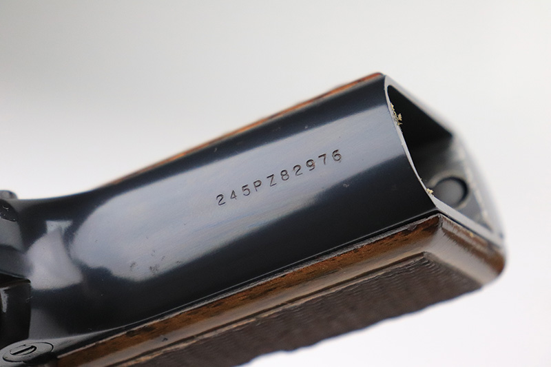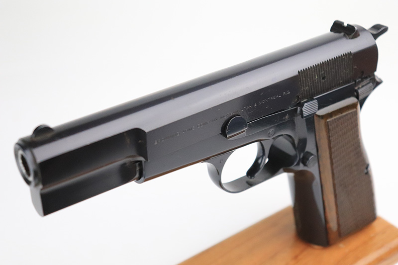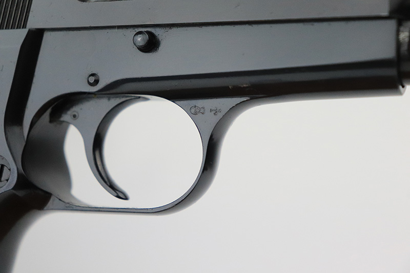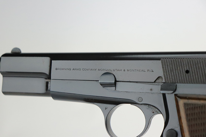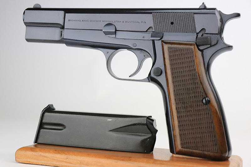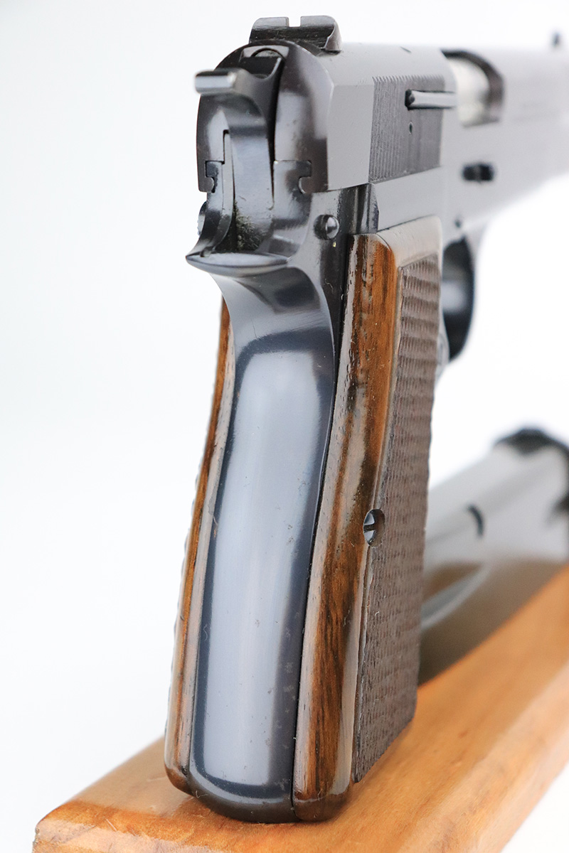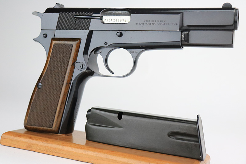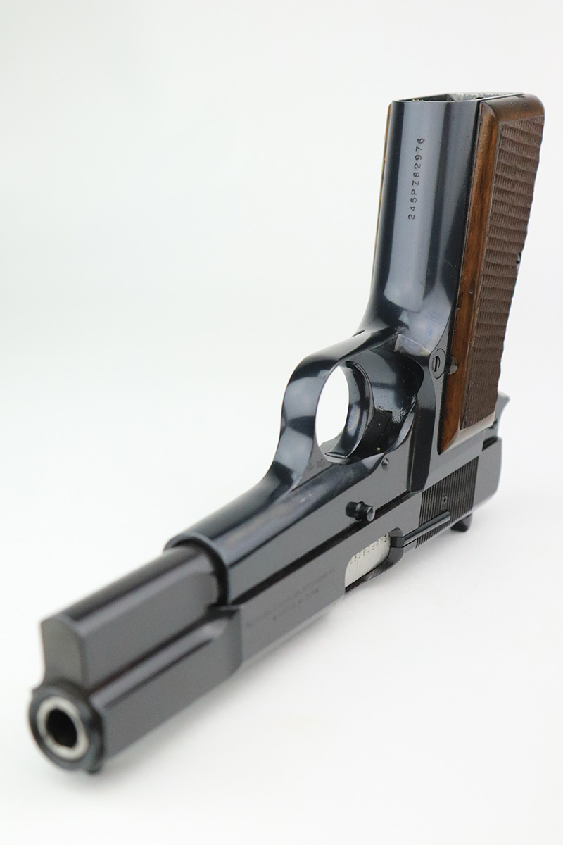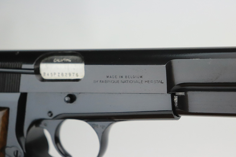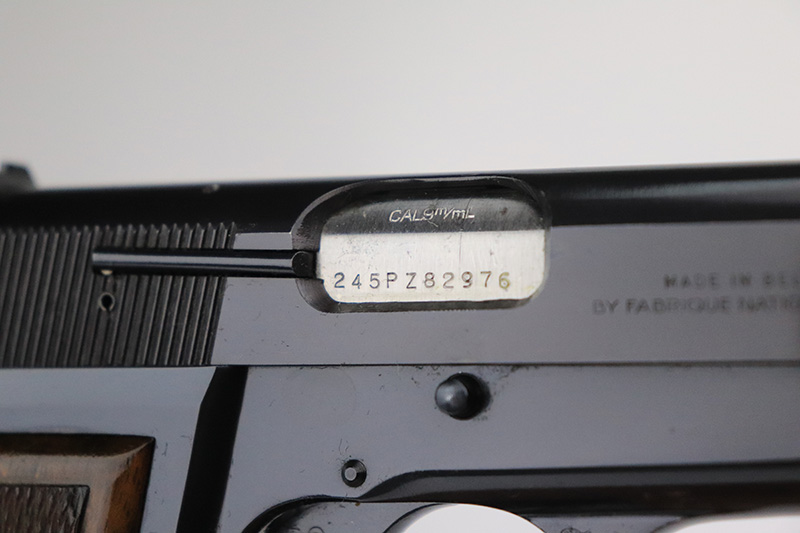 9/16/22 – This is a near-mint example of an FN Browning Hi Power, manufactured in Belgium in 1981. It is all matching and has the proper Belgian proofs. It has retained nearly all of its original high polish finish with just a few tiny handling marks here and there and some very light freckling on both grip straps. Comes with excellent wood grips and one proper magazine. Mint bore.
