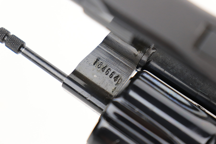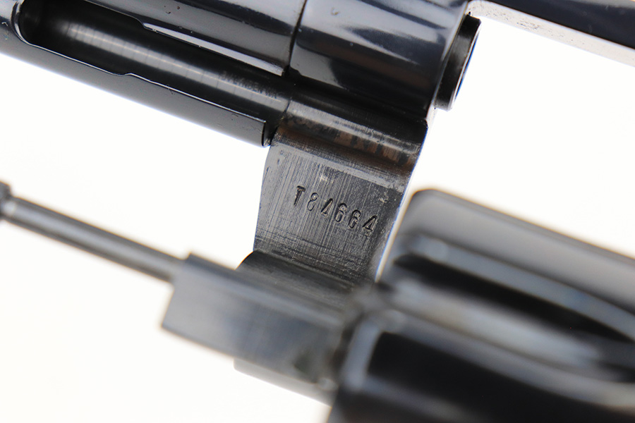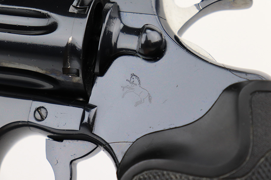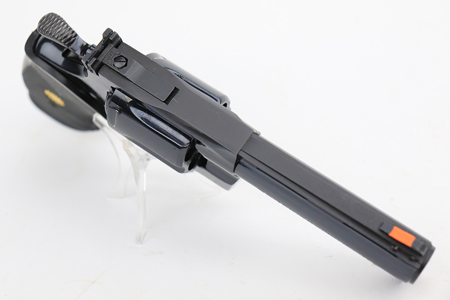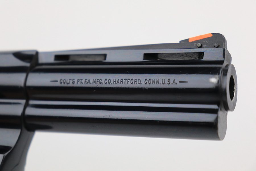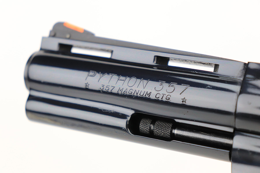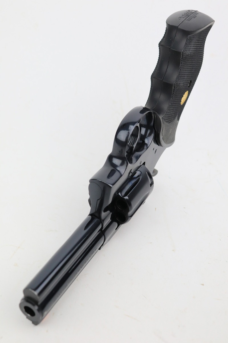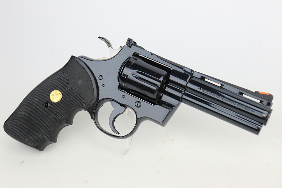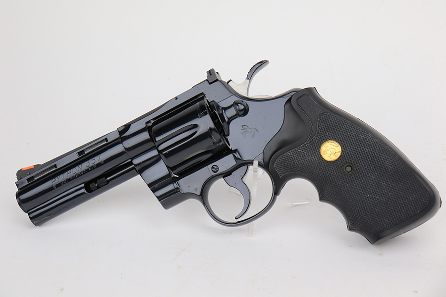 6/2/23 – This is a minty example of a Colt Python revolver, manufactured in 1989 and chambered in .357 Magnum. 4″ barrel. It has retained nearly all of its original high polish finish with just a light roll mark and some tiny scratches and handling marks on the cylinder. Fitted with a nice Pachmayr black rubber grip. Excellent bore – shiny with very strong rifling. The action is extremely smooth.