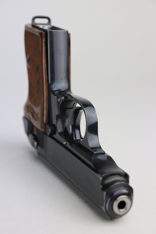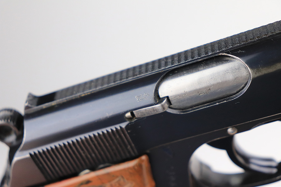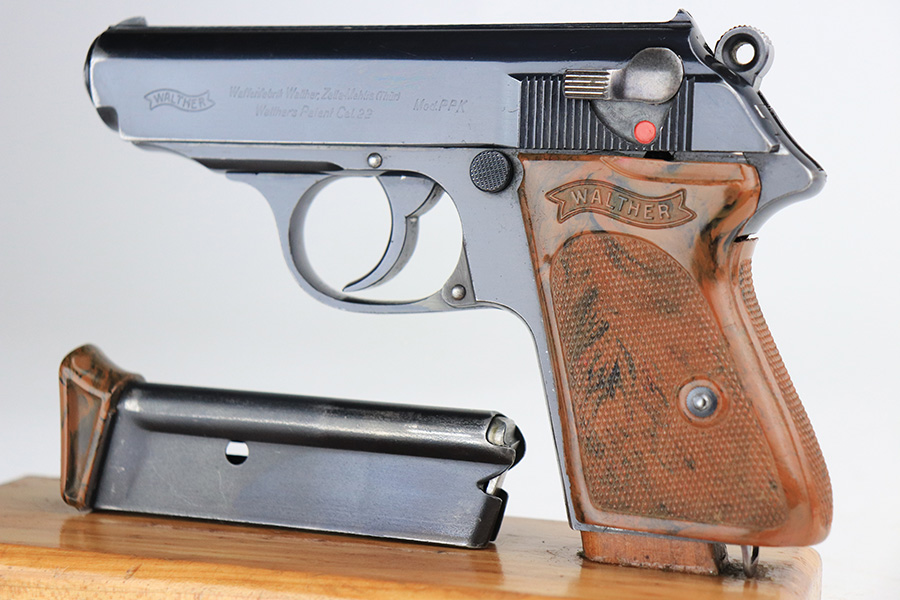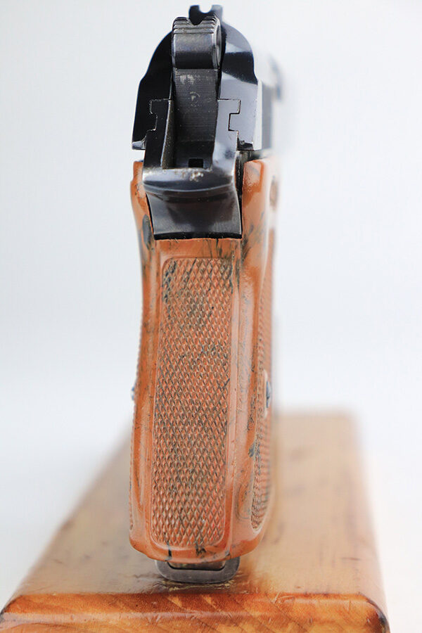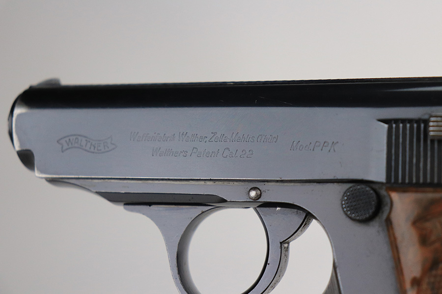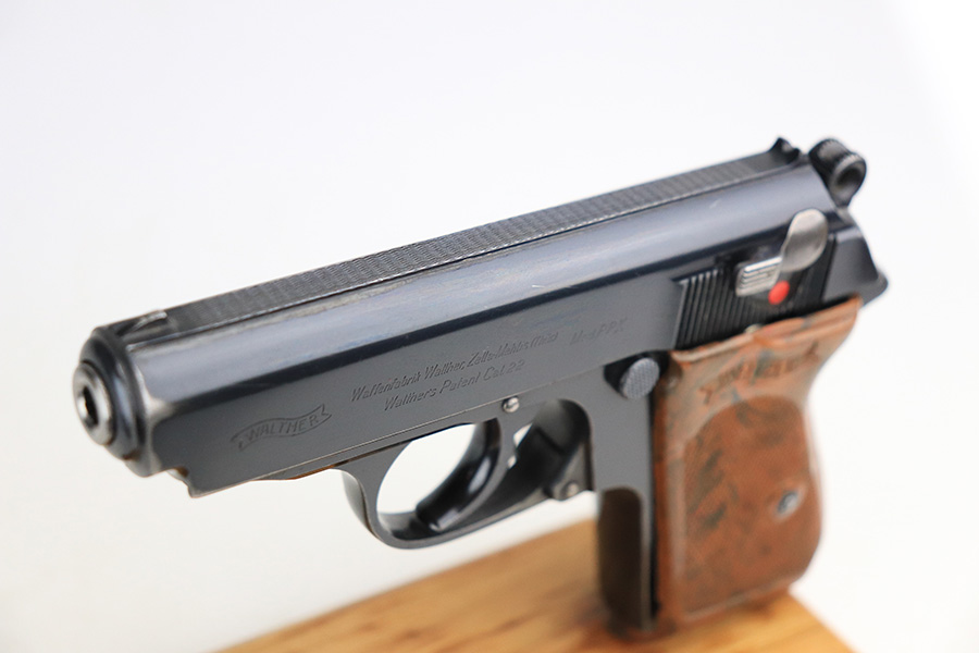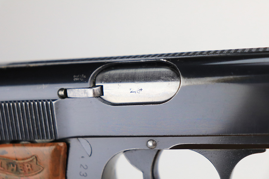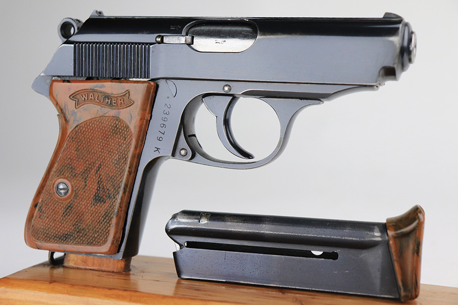 1/25/22 – This is a minty example of a .22 Caliber Walther PPK sold in the commercial market in 1939. The gun is all matching and has the proper “Crown N” commercial proofs. It has retained about 97% of its original high polish finish. There is just very minor wear around the muzzle and hints of wear along the round edges of the slide. A few small spots of wear on the front strap. Comes with an excellent brown grip and a period-correct .22 Caliber finger extension magazine. The bore is mint.