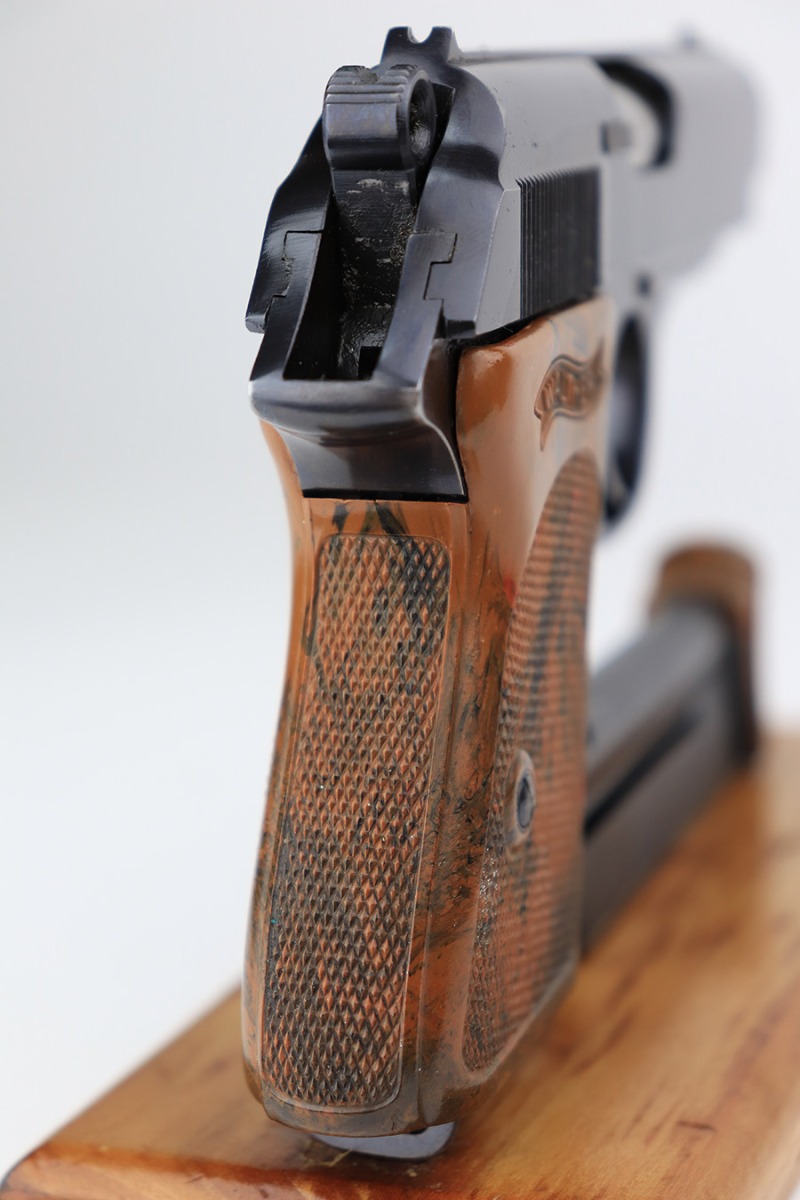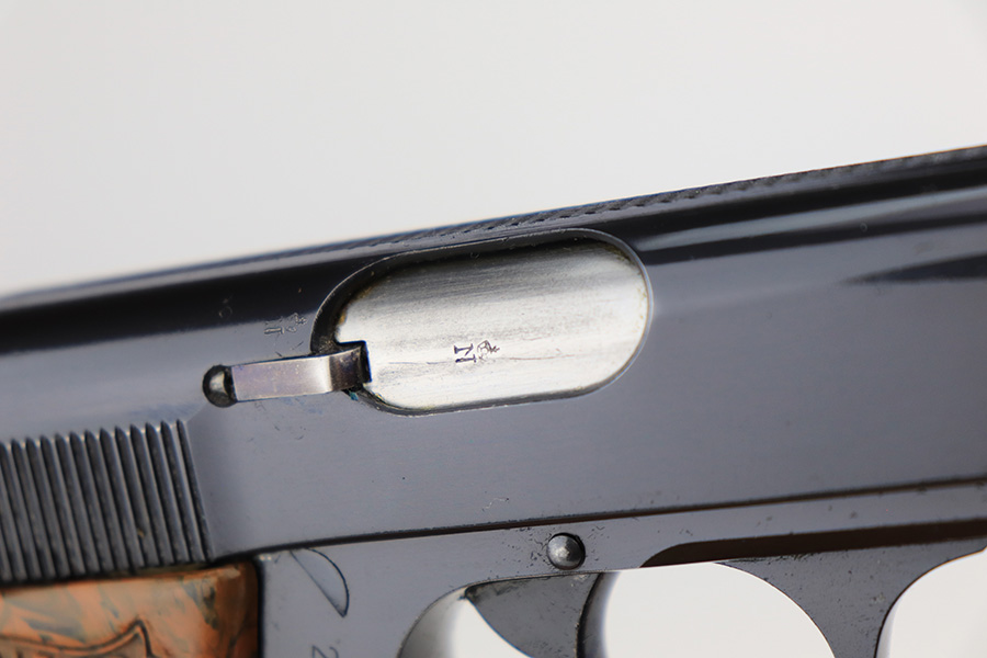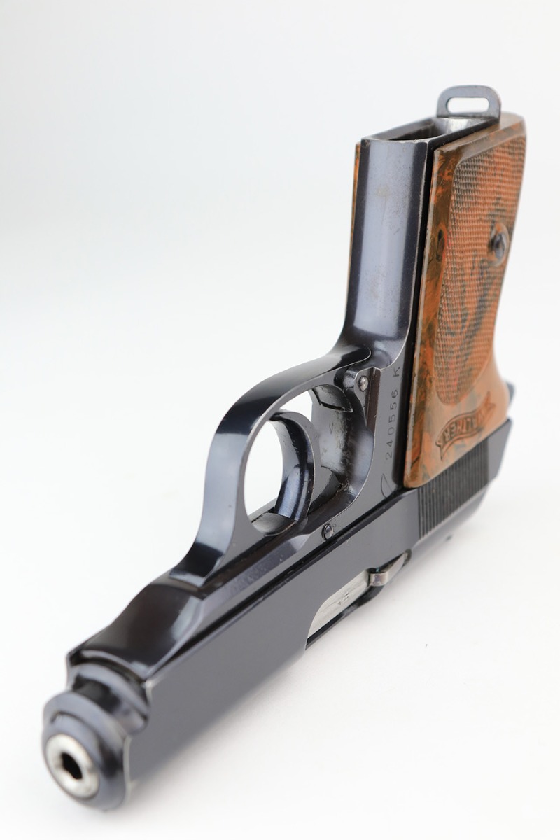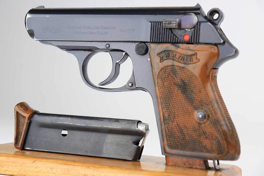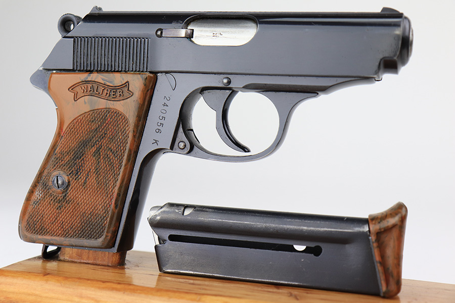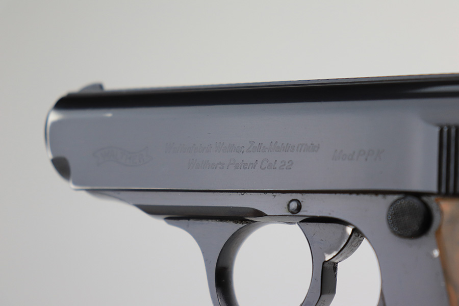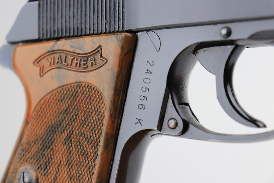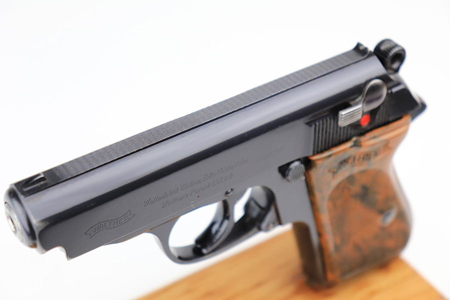 7/19/22 – This is a near-mint example of a .22 Caliber Walther PPK sold in the commercial market in 1939. The gun is all matching and has the proper “Crown N” commercial proofs. It has retained about 98% of its original high polish finish. There is very minor muzzle wear and a couple of small spots of minor wear on the front strap. Also some very minor freckling on the front strap. Some of the original fire bluing is visible on the safety lever. Minty brown Walther grip with just a tiny crack at the top of the spine. Comes with an excellent period-correct .22 Caliber finger extension magazine – no cracks or chips. Mint bore.
