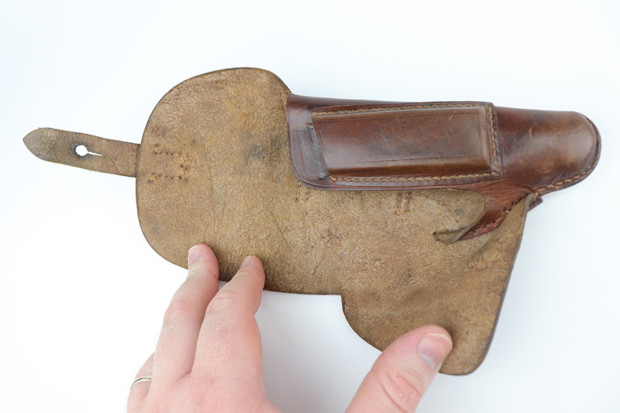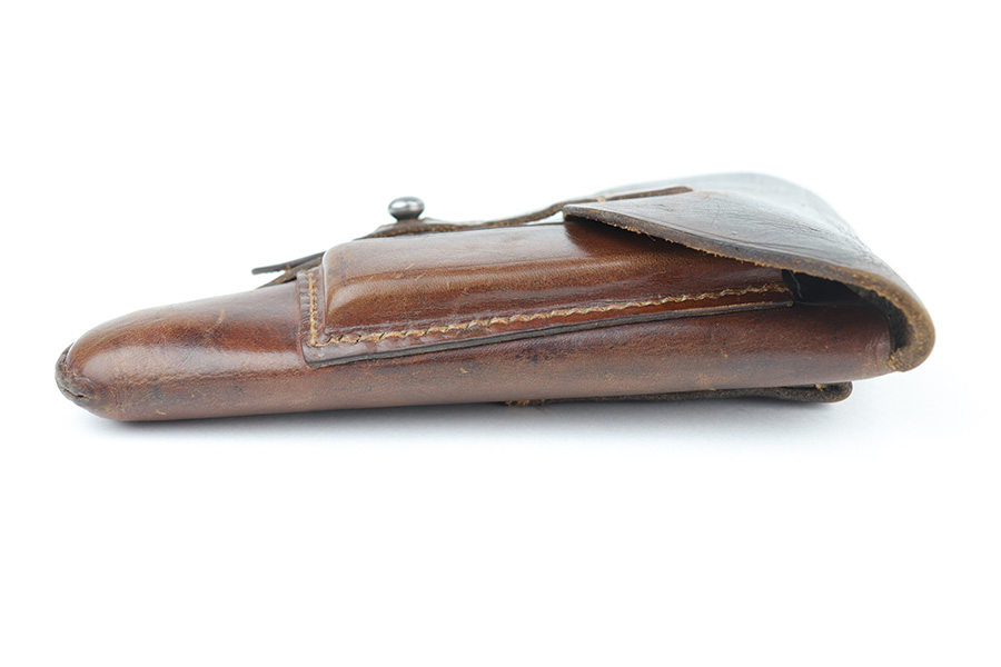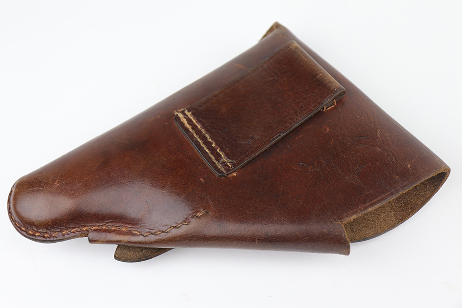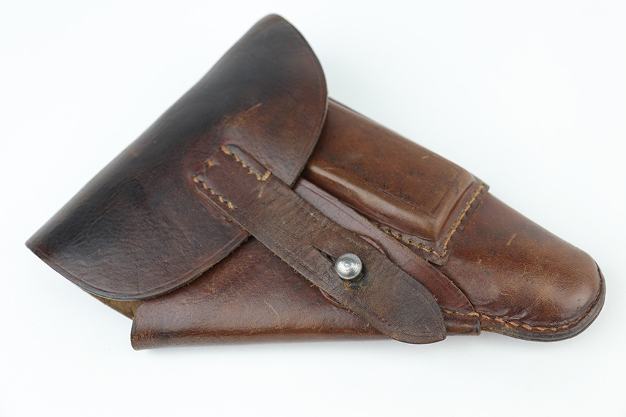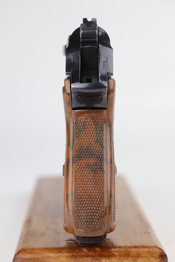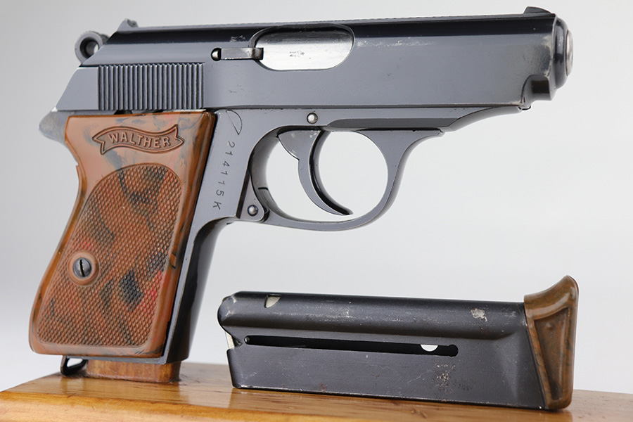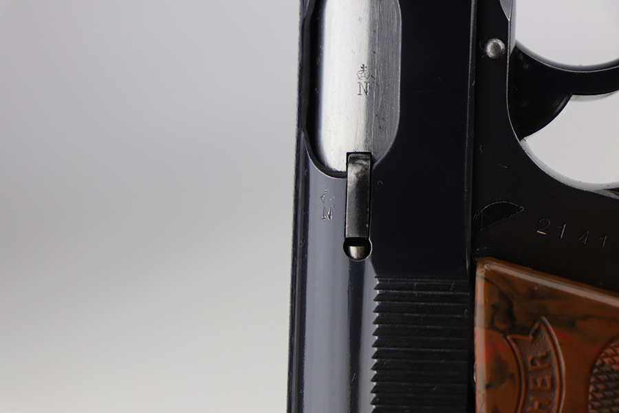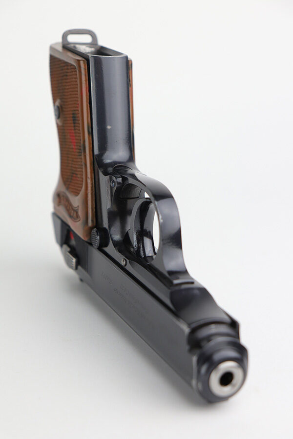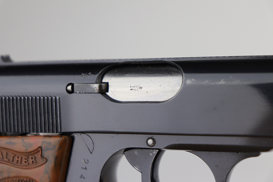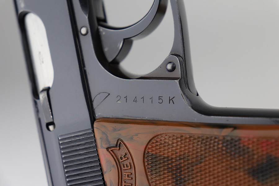 9/7/21 – This is a minty example of a Walther PPK sold in the commercial market in 1939. It is all matching and has the proper “Crown N” commercial proofs. The rig comes with a generic unmarked leather holster, one period-correct finger extension magazine, and one period-correct flat-bottom magazine. It comes with an excellent brown grip that has nice splashes of red color here and there. There is a hairline crack in the spine and on the right side. It has retained about 97-98% of its original high polish finish. There is very minor wear around the muzzle, near the ejection port, and a few tiny spots on the front strap. Mint bore.