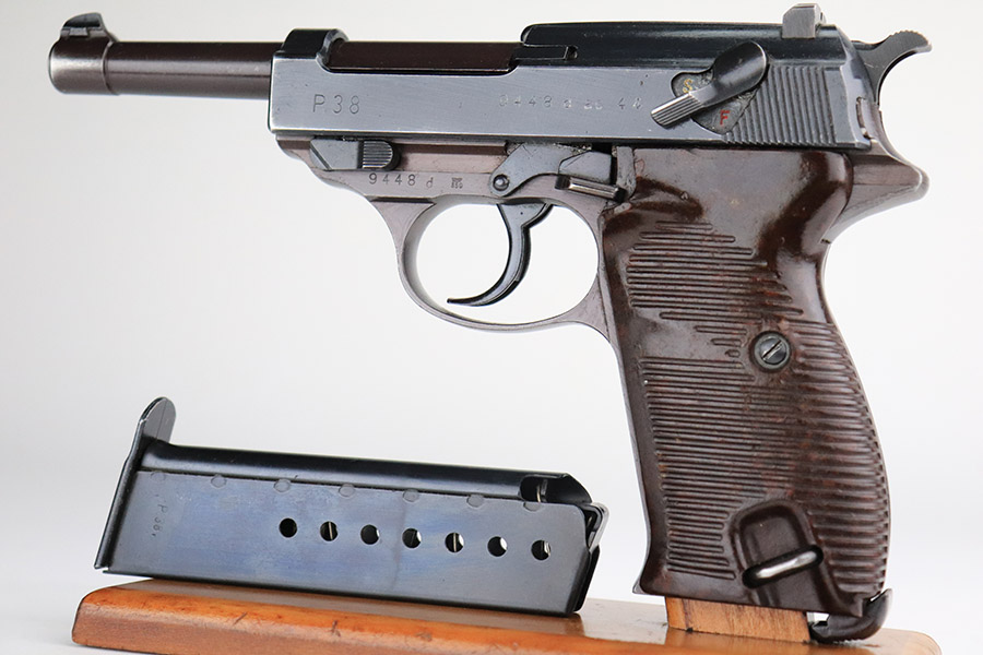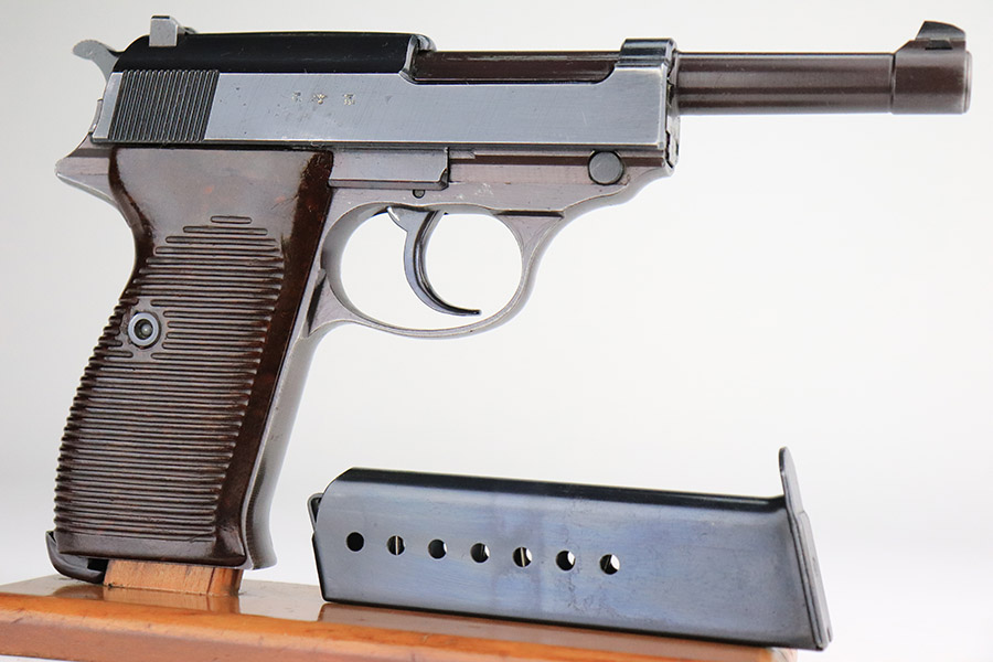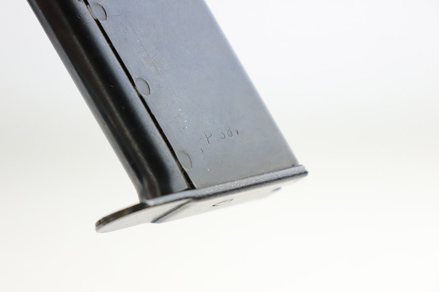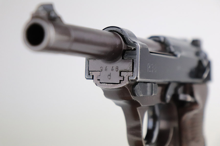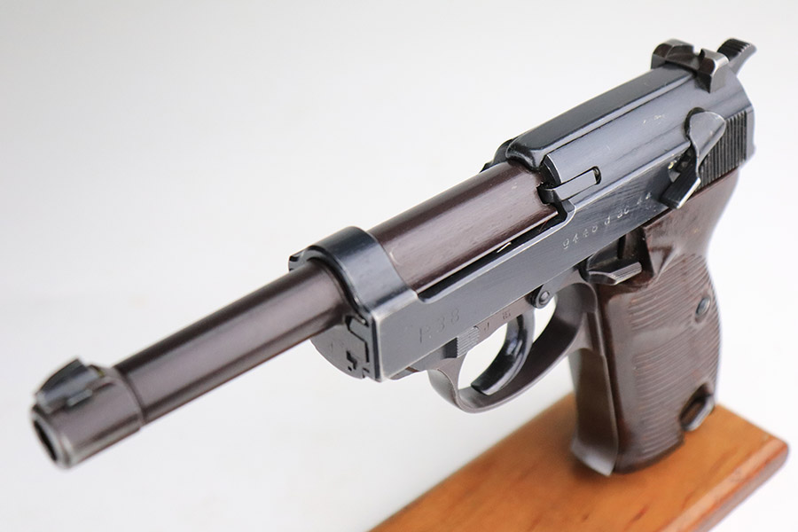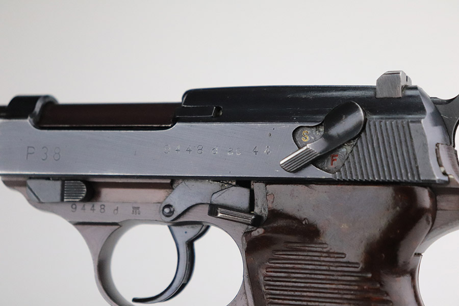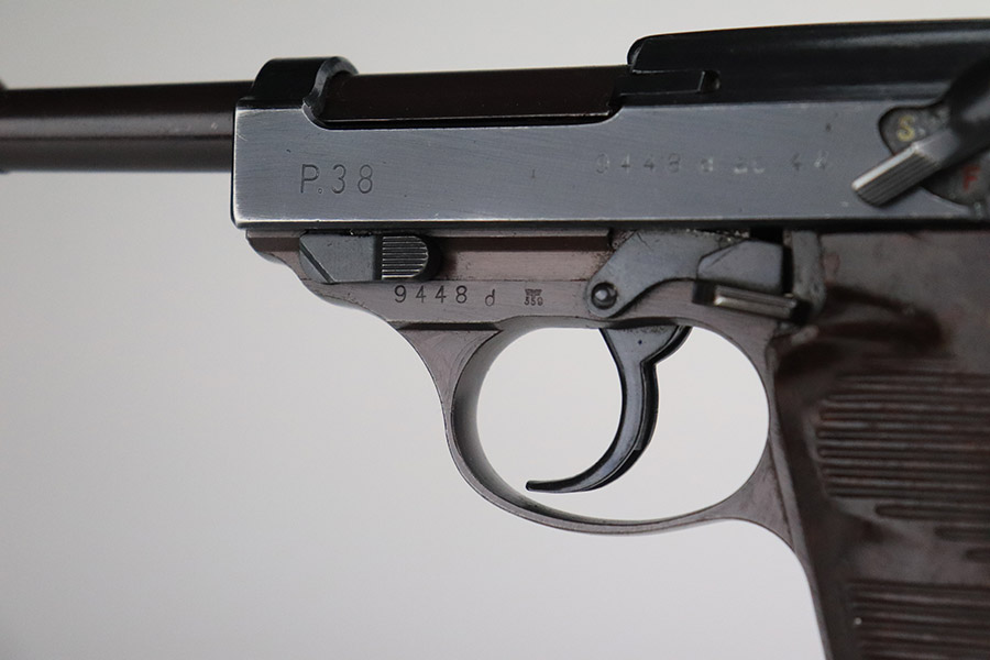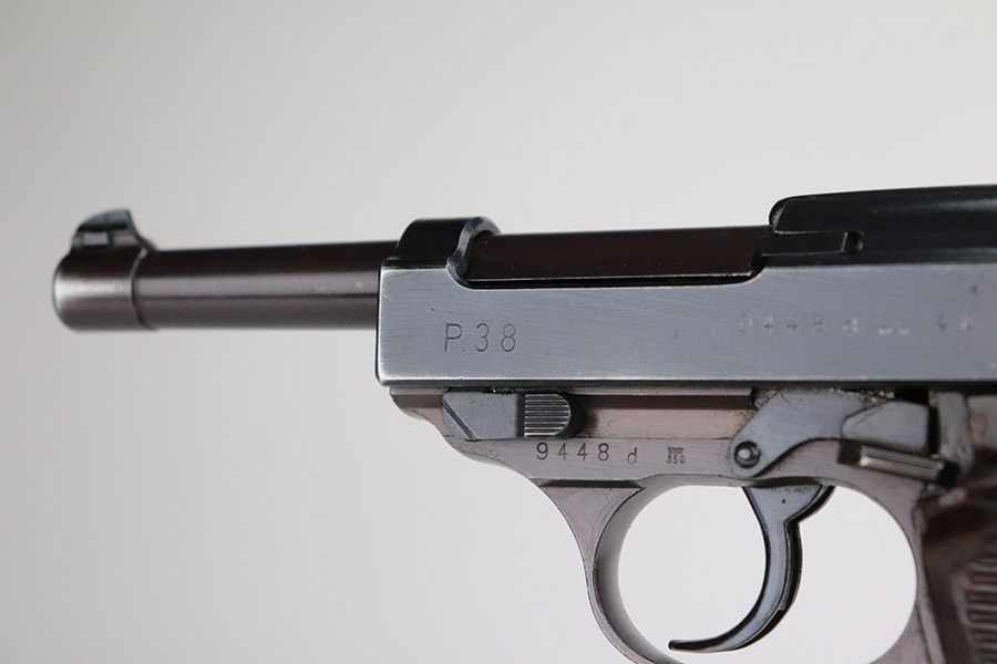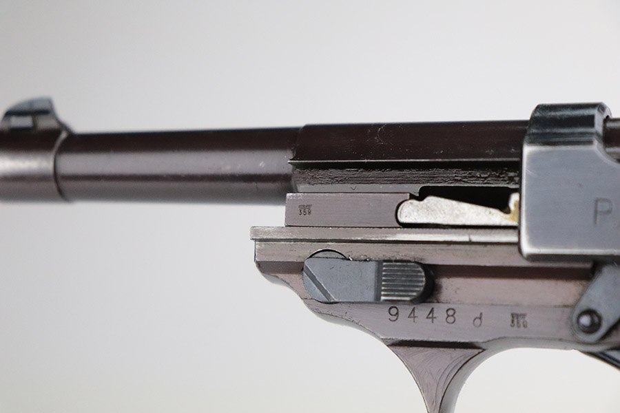 11/7/22 – This is a minty example of an AC 44 Walther P.38 issued to the Nazi military in 1944. It is all matching and has the proper “Eagle 359” military acceptance proofs throughout. This one happens to have a beautiful plum-colored finish on its barrel and frame. The slide has a more traditional blue color, giving it a really nice almost dual-tone appearance. The gun has retained about 97% of its finish with just very minor thinning on the front strap and areas of very minor wear around the muzzle and on the very front edges of the slide. Comes with excellent reddish brown bakelite grips and an “Eagle 135” proofed Mauser magazine. Mint bore. De-cocker is functional.