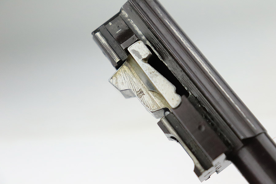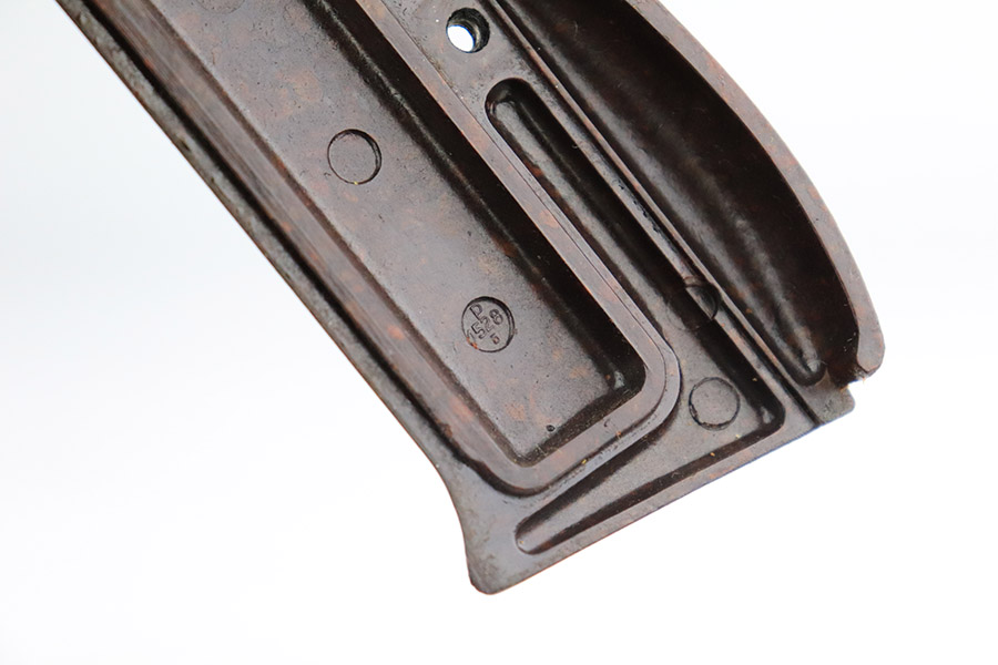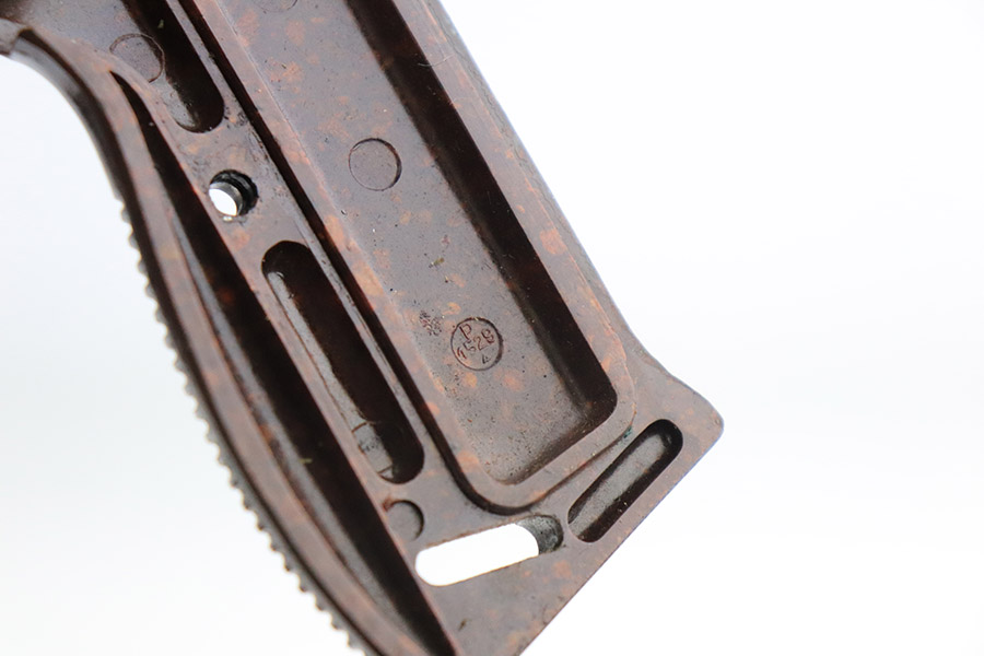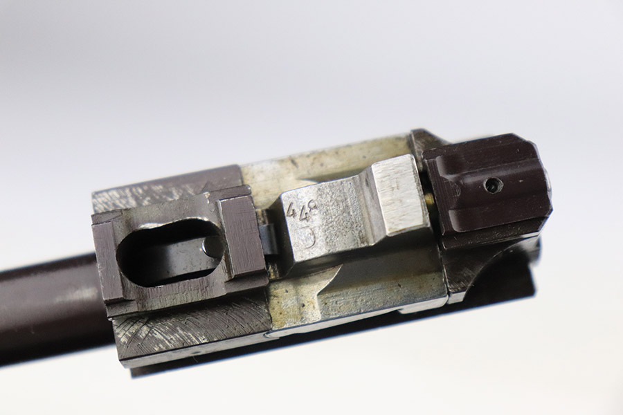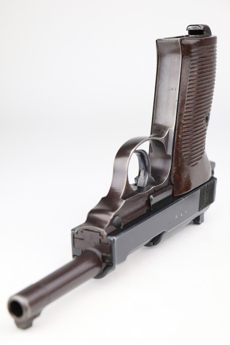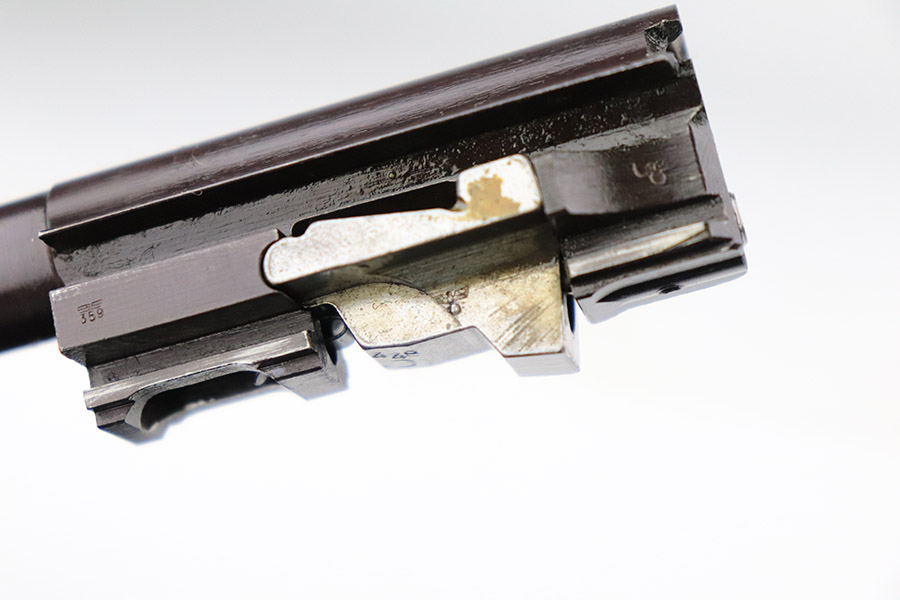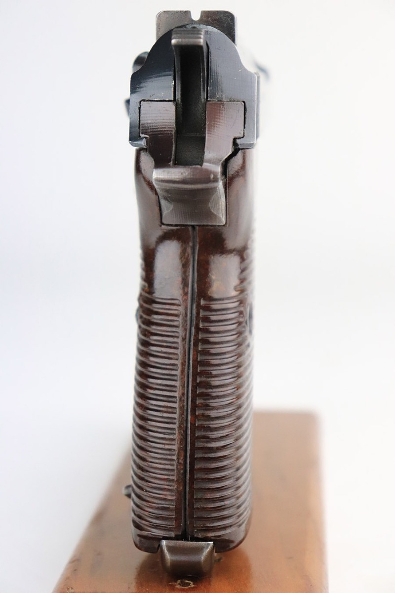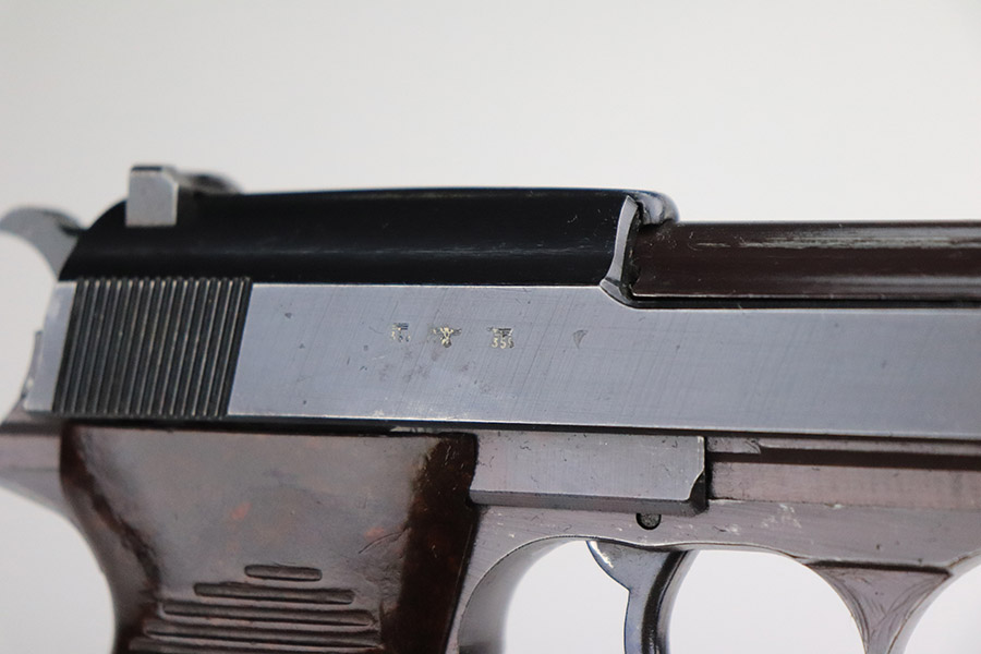 11/7/22 – This is a minty example of an AC 44 Walther P.38 issued to the Nazi military in 1944. It is all matching and has the proper “Eagle 359” military acceptance proofs throughout. This one happens to have a beautiful plum-colored finish on its barrel and frame. The slide has a more traditional blue color, giving it a really nice almost dual-tone appearance. The gun has retained about 97% of its finish with just very minor thinning on the front strap and areas of very minor wear around the muzzle and on the very front edges of the slide. Comes with excellent reddish brown bakelite grips and an “Eagle 135” proofed Mauser magazine. Mint bore. De-cocker is functional.