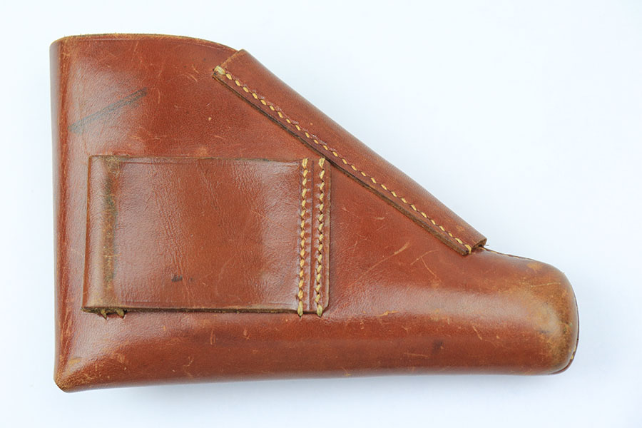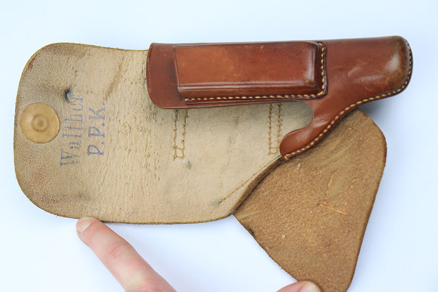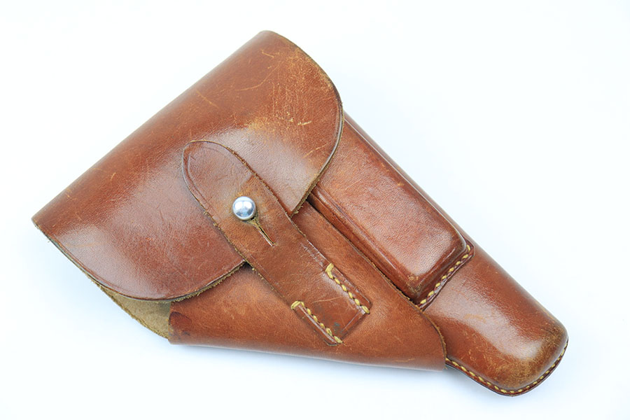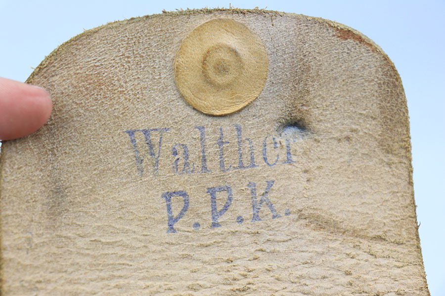 12/16/21 – This is an excellent AKAH Walther PPK holster from WW2. The holster has very nice light brown leather and excellent stitching throughout. There are some mild scuffs but no major issues. The interior leather is Walther PPK ink stamped, and there is an AKAH maker stamp under the closure strap. We rarely find AKAH PPK holsters in this condition !