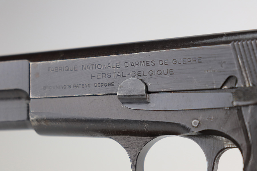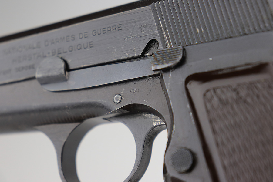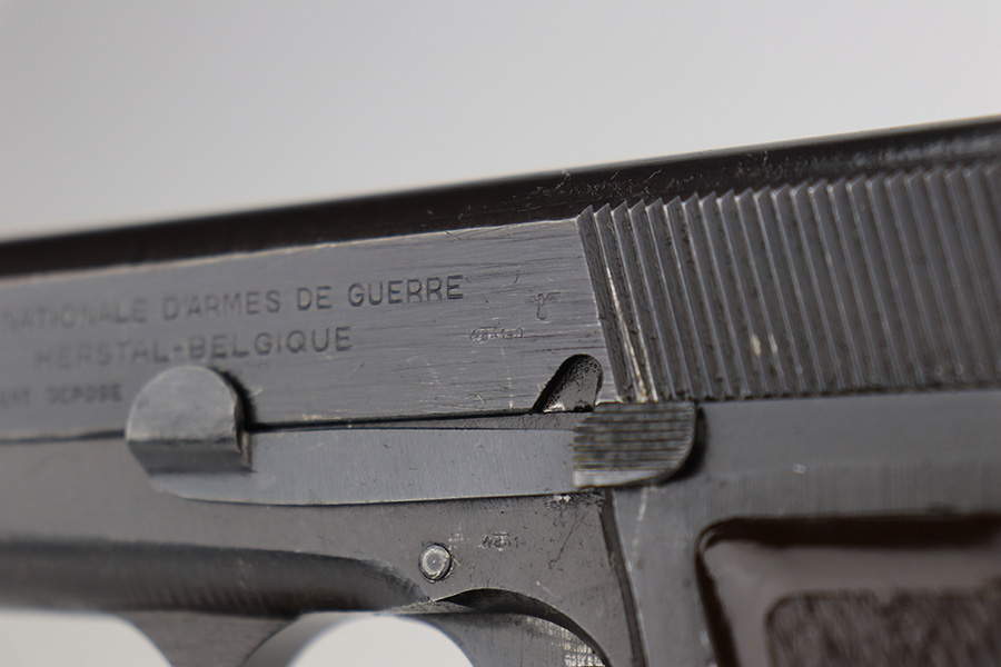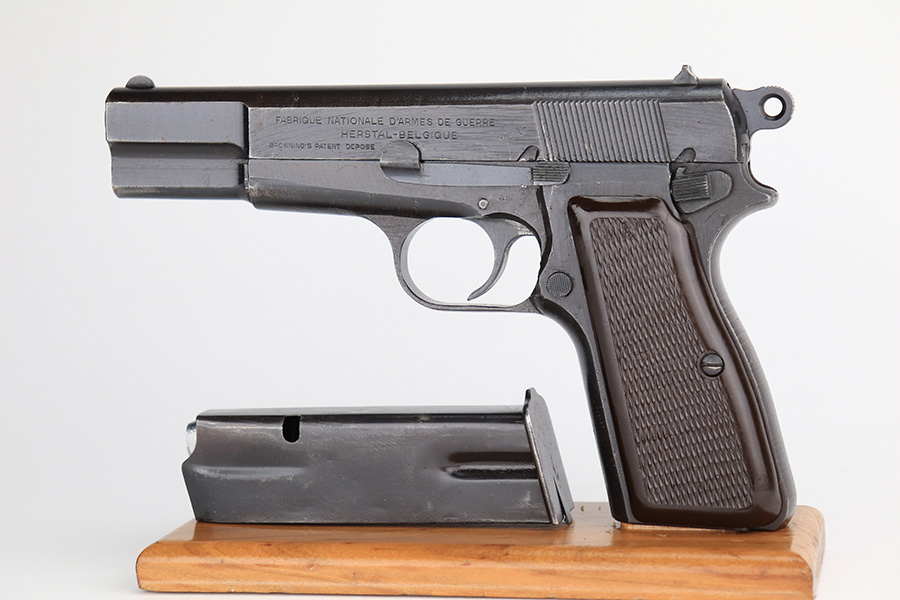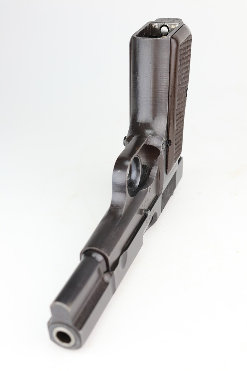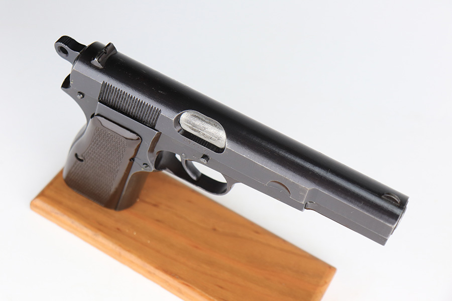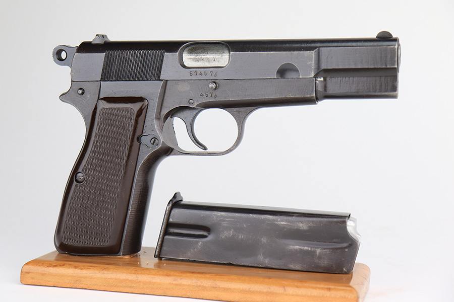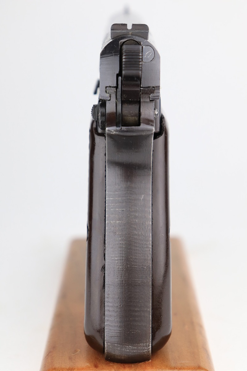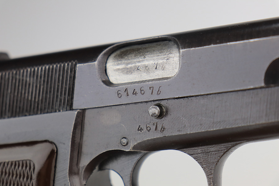 1/6/23 – This is a minty FN Browning High Power that was issued to the German Army in WW2. All matching and original with 98-99% of the military blue remaining. Tiny hints of edge wear to the rough later war finish but terrific condition overall. Excellent brown bakelite grips with no cracks. Rare WaA103 marked magazine. Excellent bore.