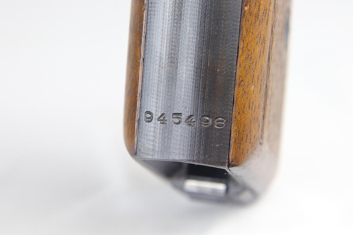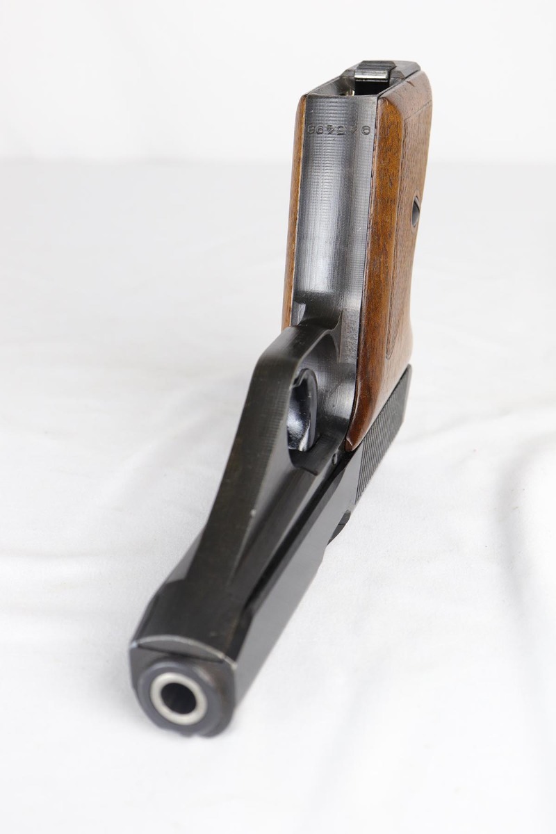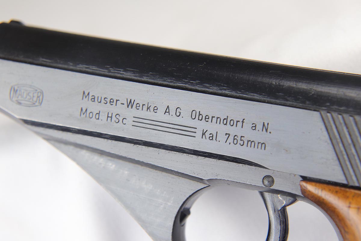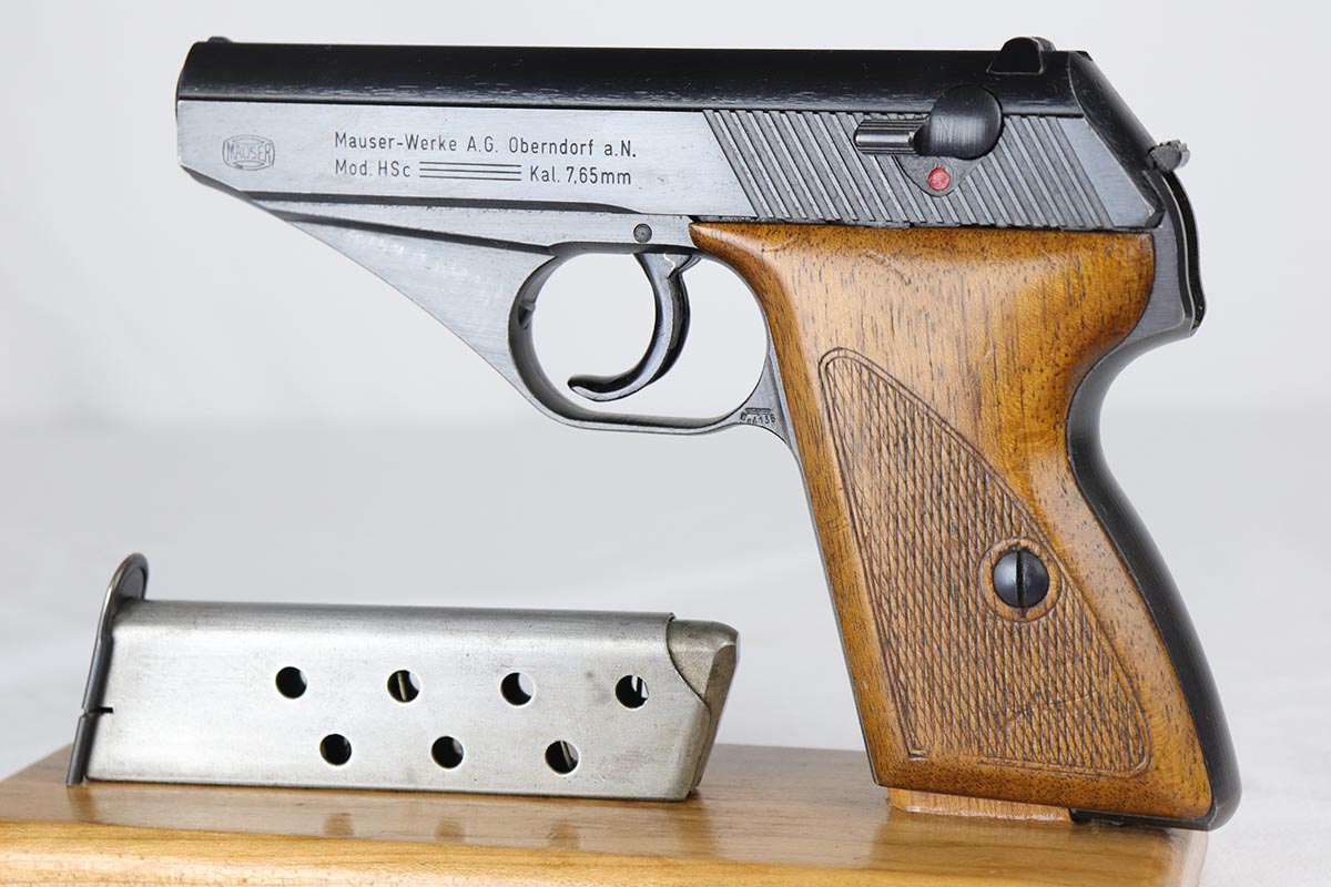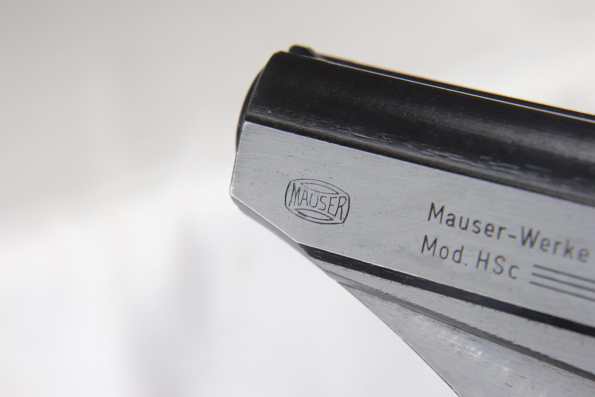 8/10/18 – This is a near-mint Mauser HSc that was issued to the German Army at the end of World War II.  Manufactured in 1945, this pistol is all original and matching with 98-99% blue remaining.  The only notable finish loss is on the bottom of the back strap.  Excellent grips and bore.  Half-moon magazine.