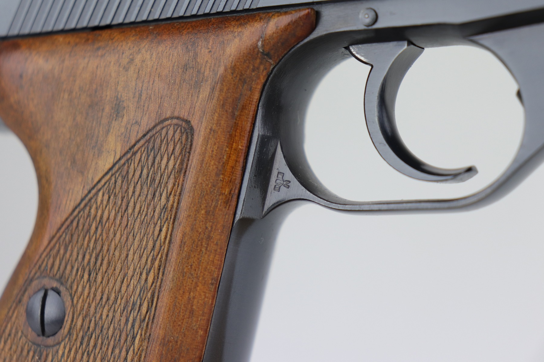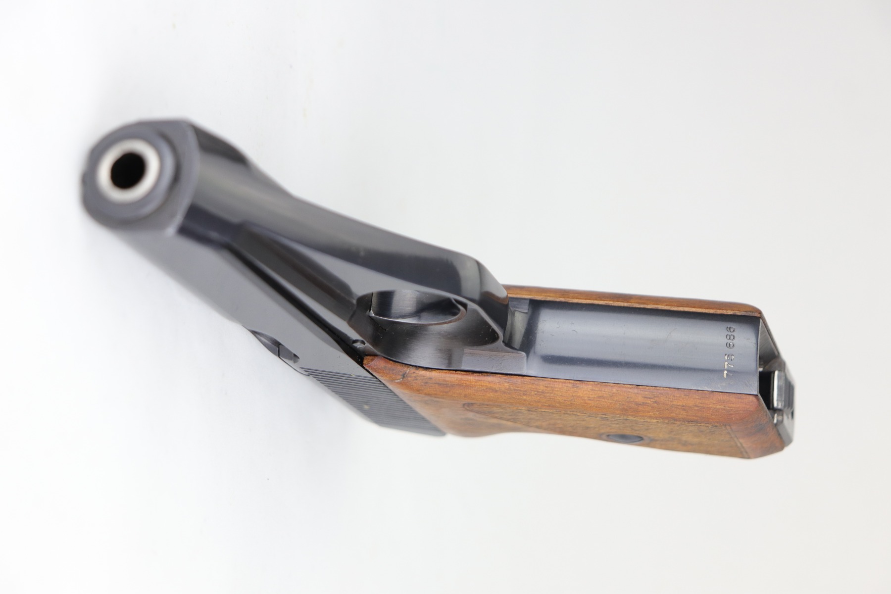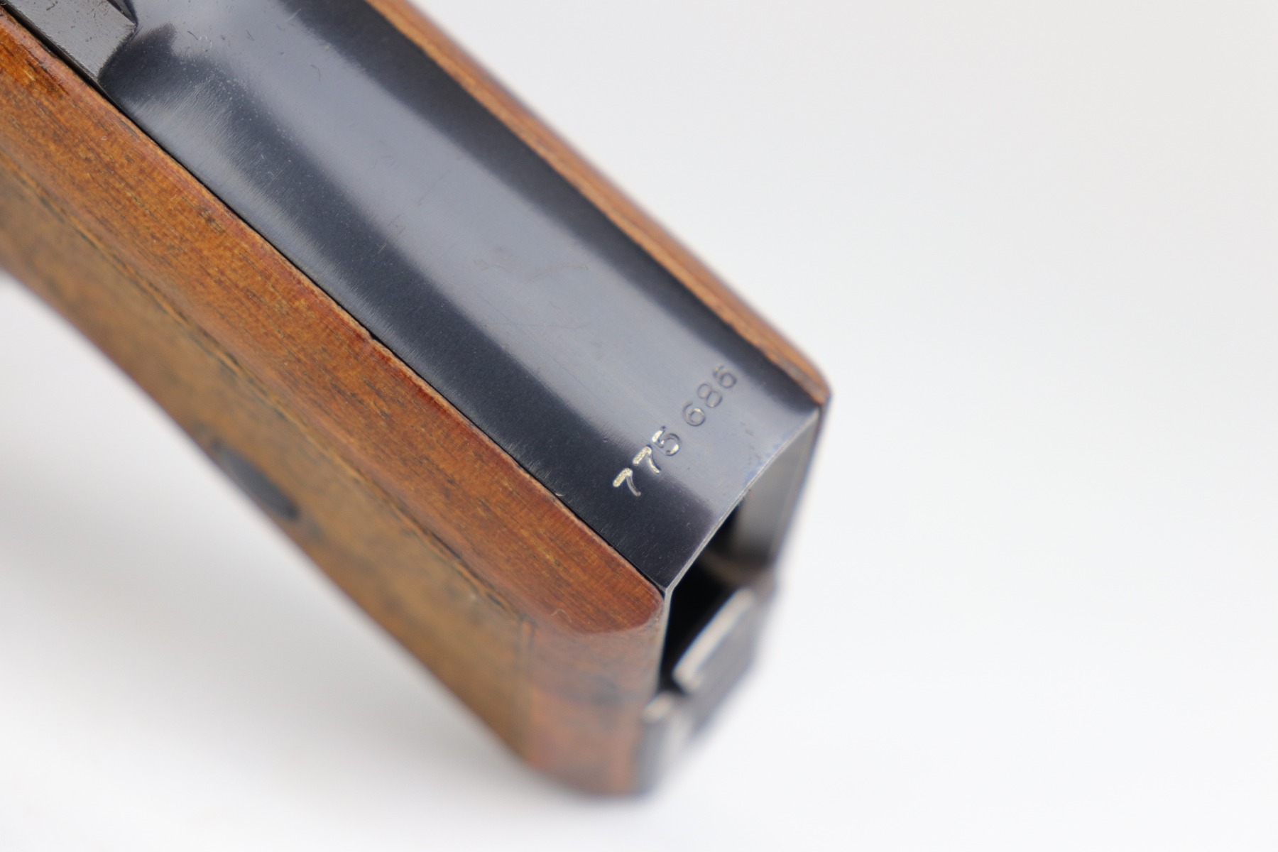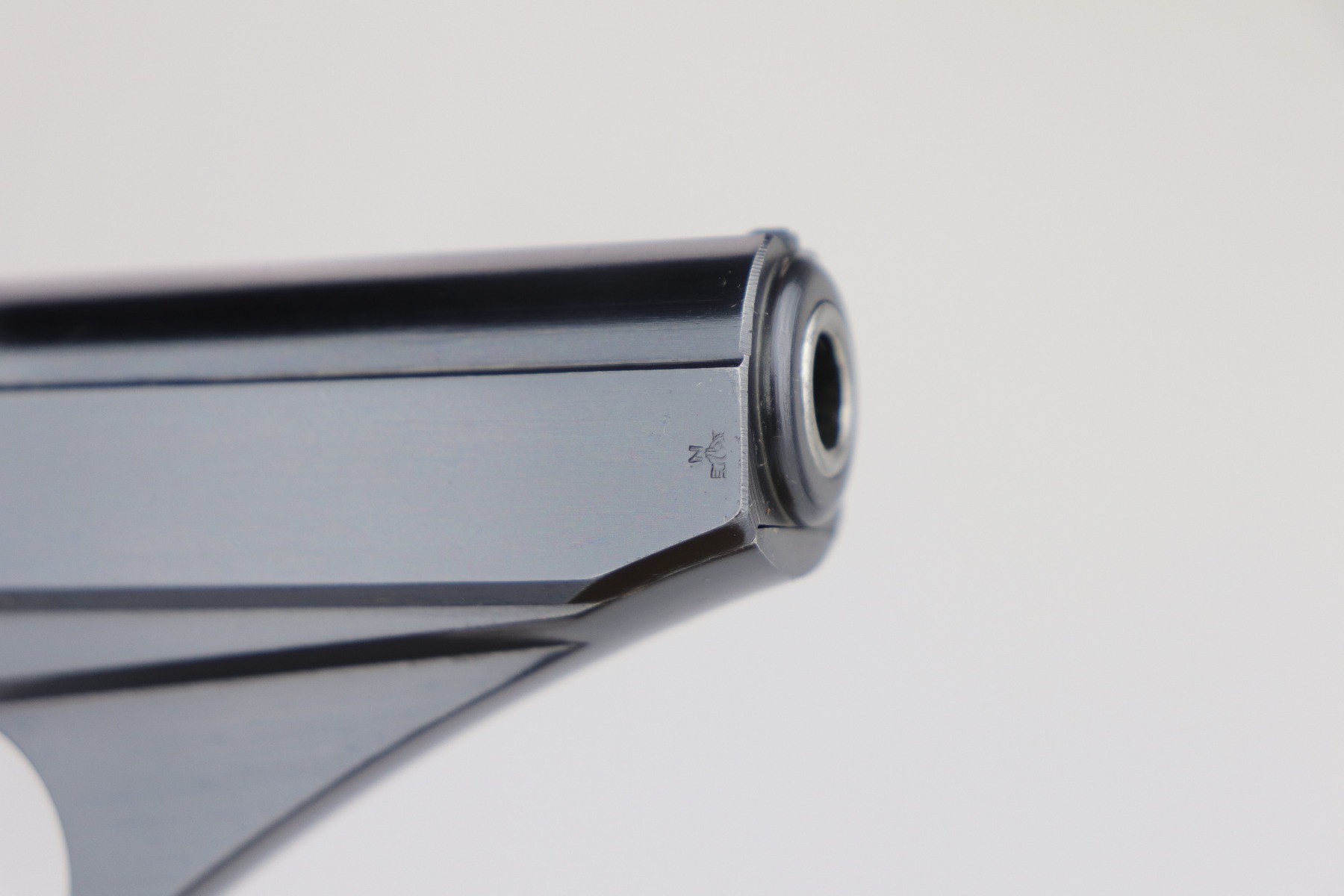3/6/20 – This is a minty Army Mauser HSc rig from 1942. It has 99% of the original blue, with minor muzzle wear from the holster and a very minor scratch on the underside of the frame. Minty bore and excellent grips. Waffenamt on left side frame. One blank magazine, one with Mauser banner. Comes with an original holster that is ’42 dated with ‘jhg’ maker mark.