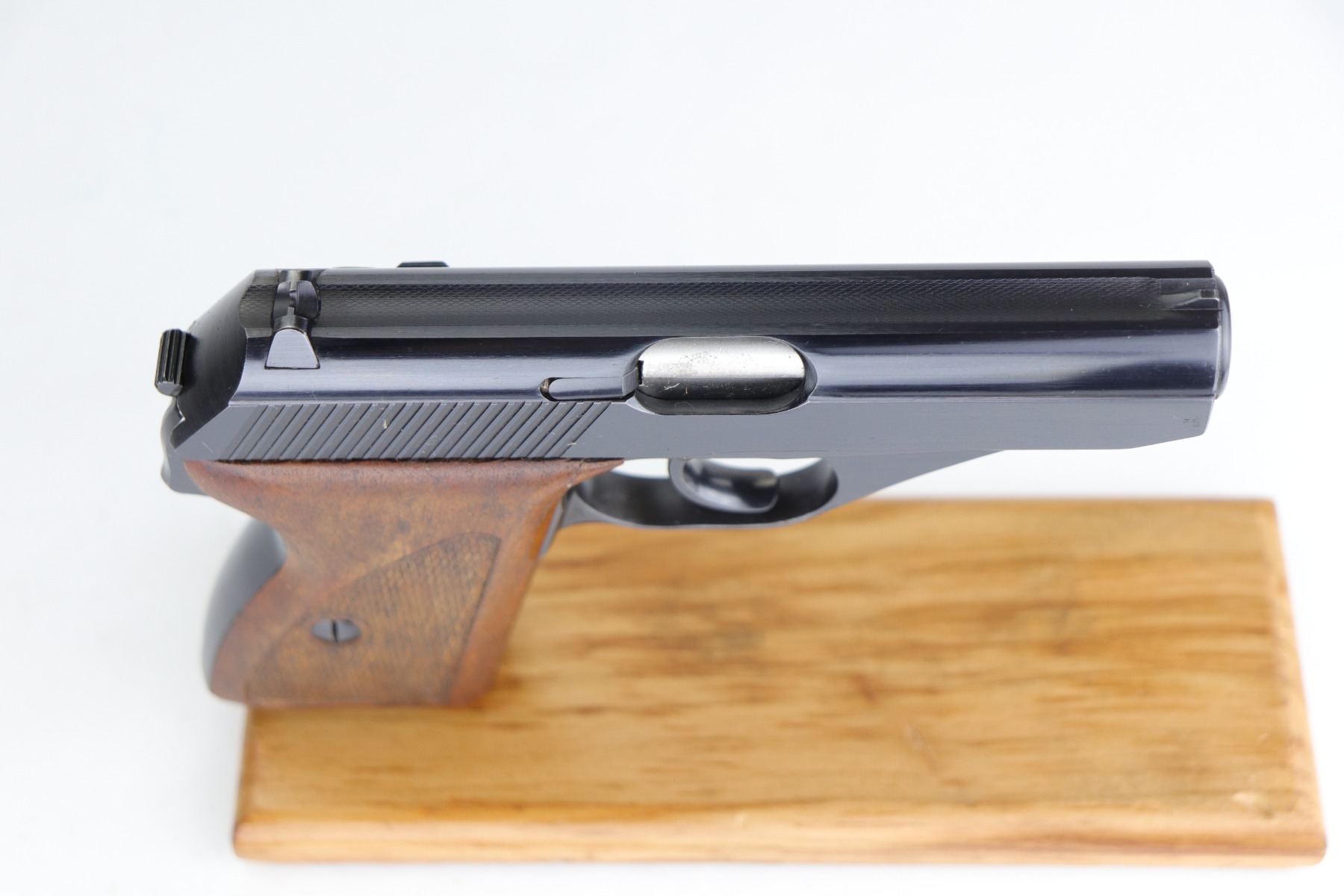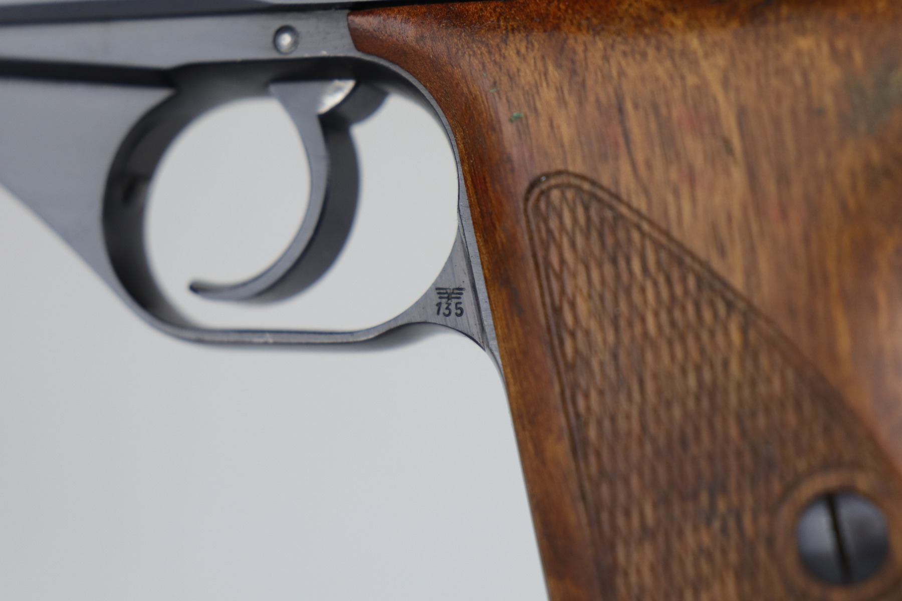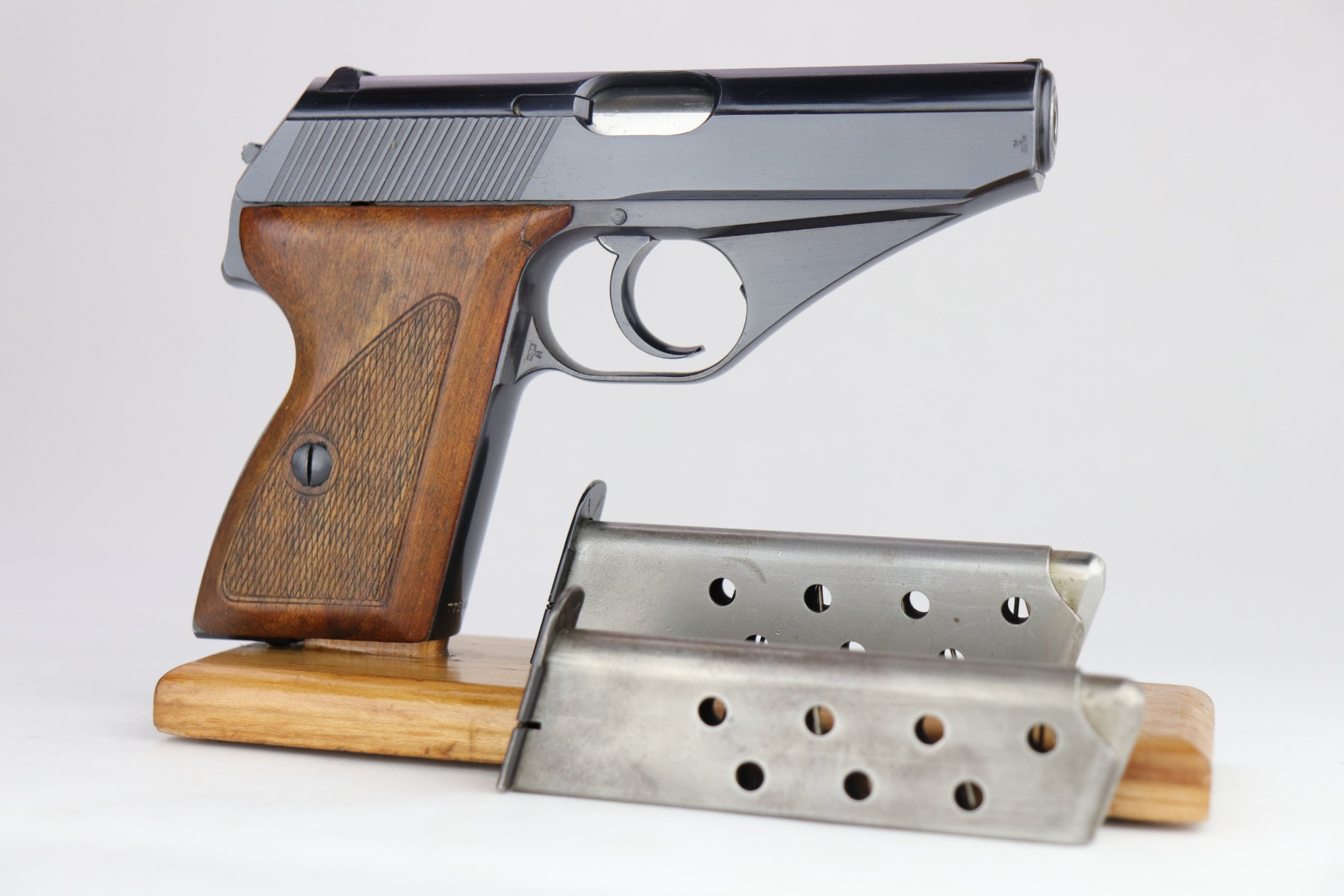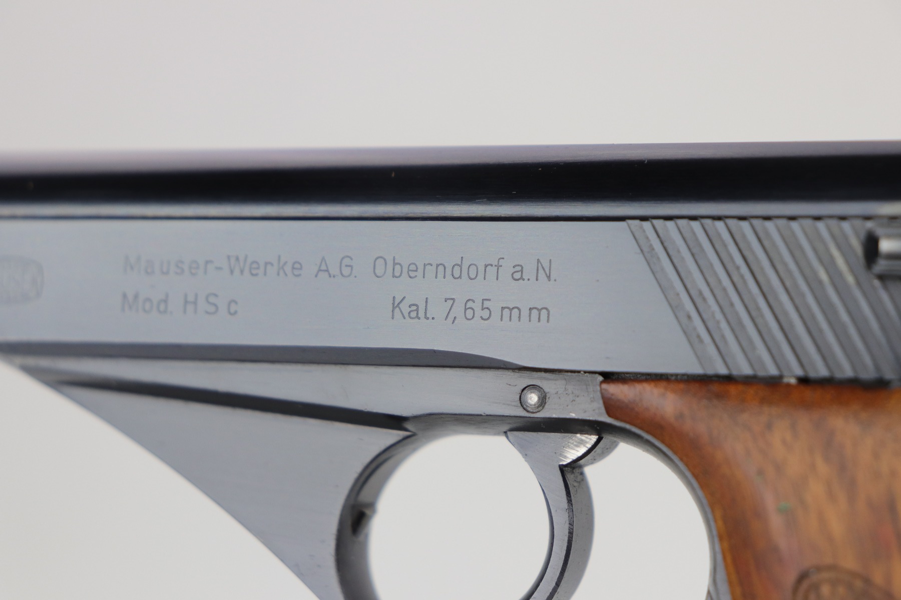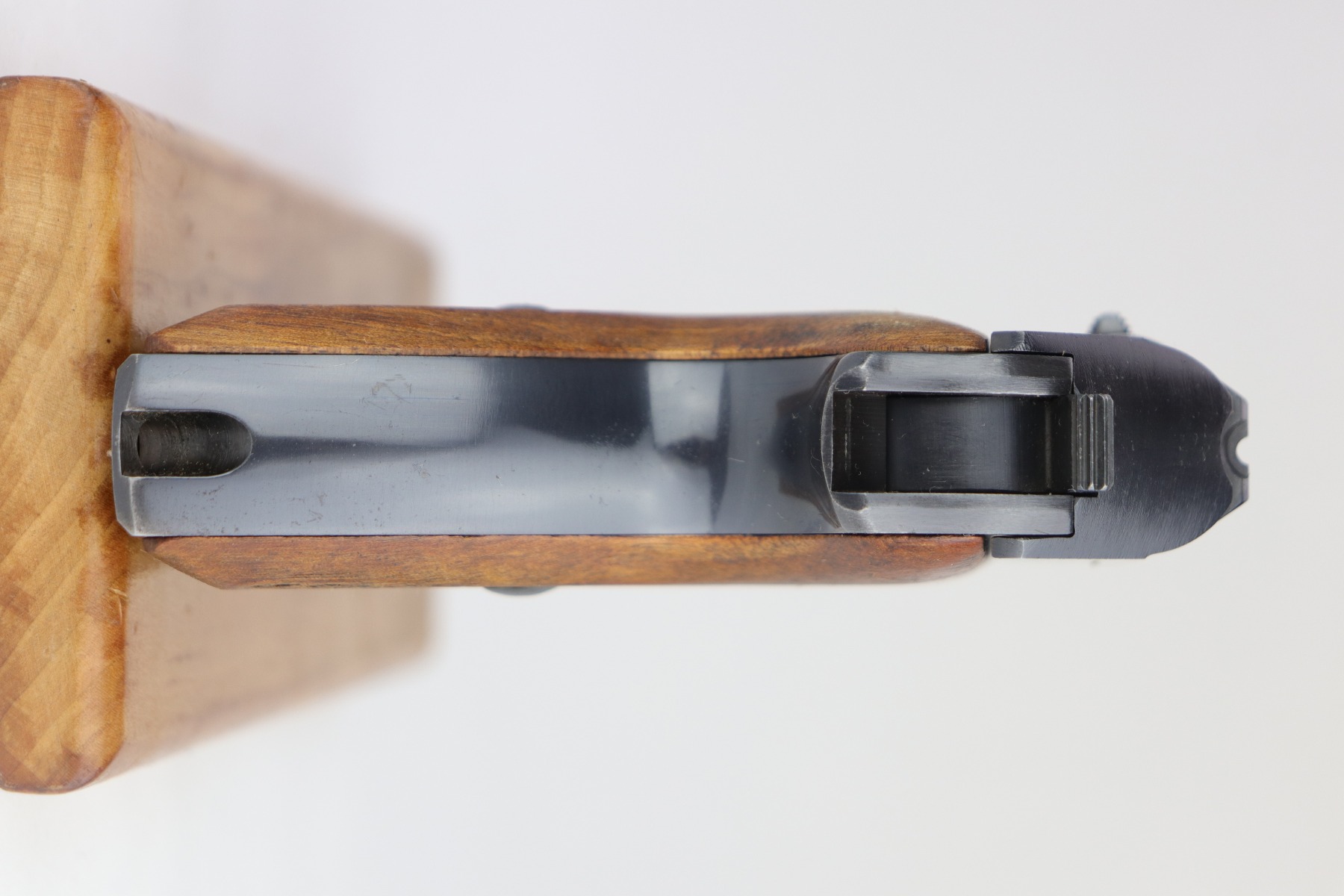 3/6/20 – This is a minty Army Mauser HSc rig from 1942. It has 99% of the original blue, with minor muzzle wear from the holster and a very minor scratch on the underside of the frame. Minty bore and excellent grips. Waffenamt on left side frame. One blank magazine, one with Mauser banner. Comes with an original holster that is ’42 dated with ‘jhg’ maker mark.