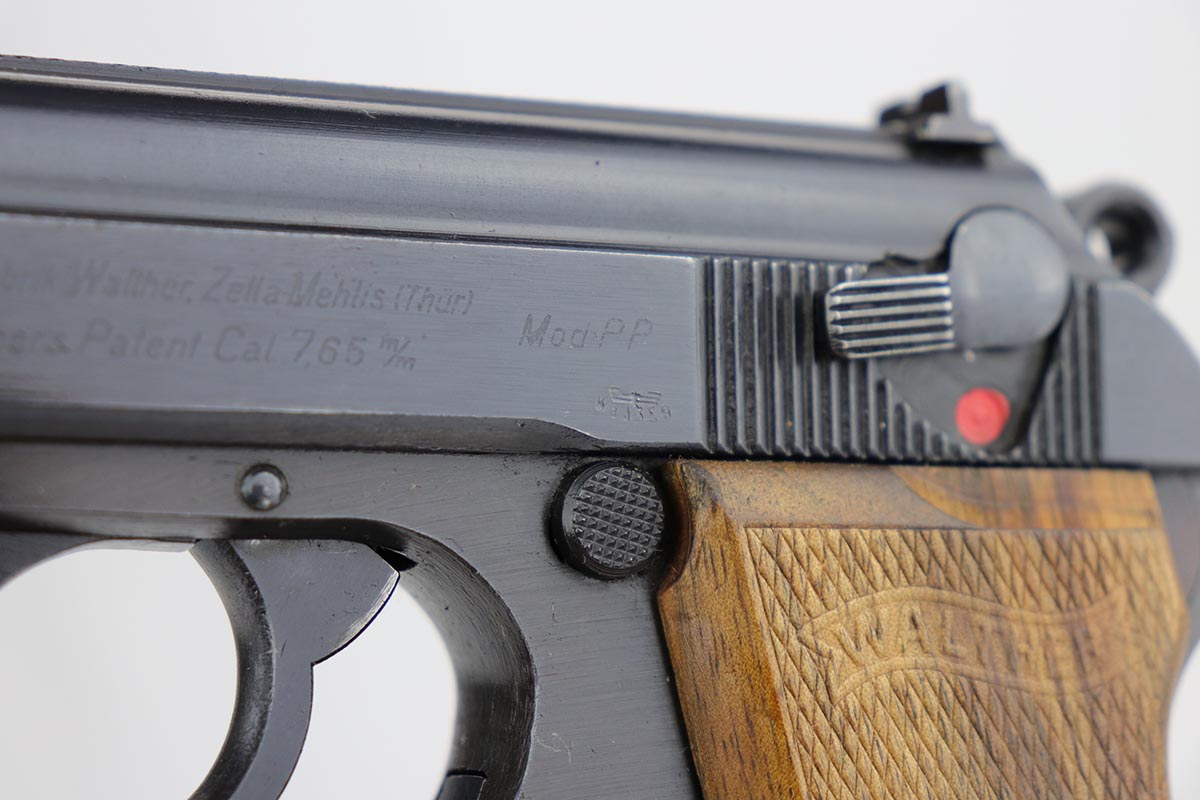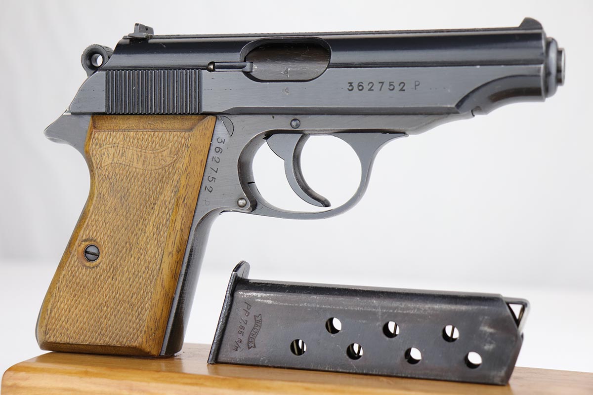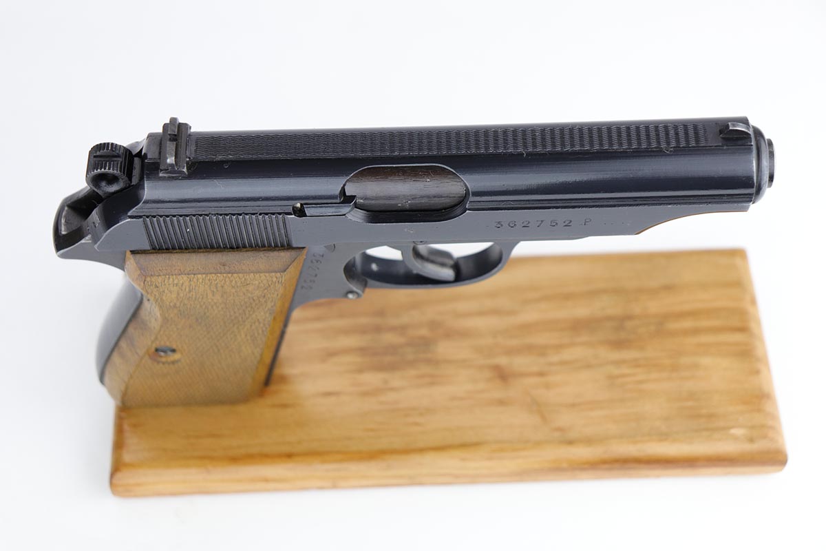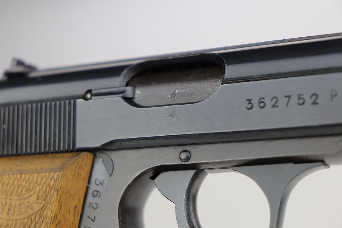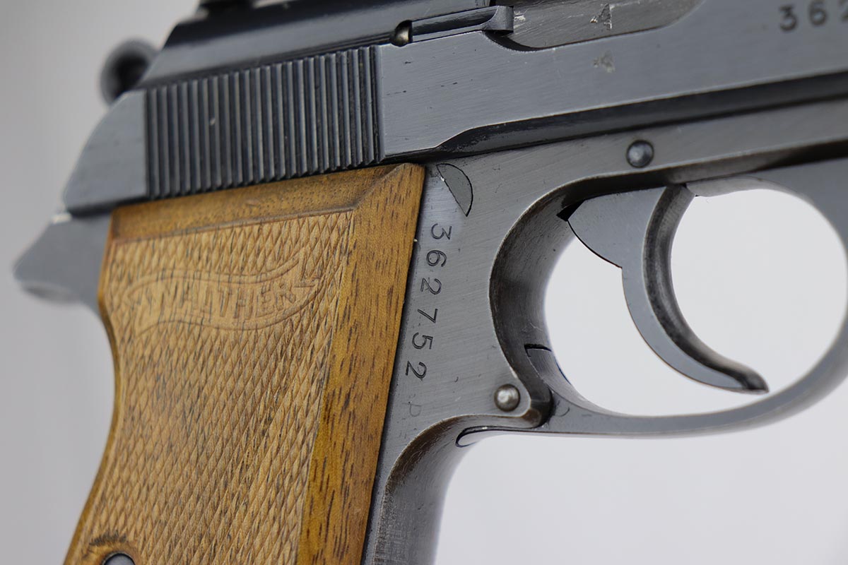 10/24/19 – This is a near-mint Walther PP that was manufactured in 1944 for the Nazi Army. The original blue rates at 98-99% with a mint profile but very minor thinning/patination of the straps. Mint bore. Excellent wood grips. Wartime magazine.