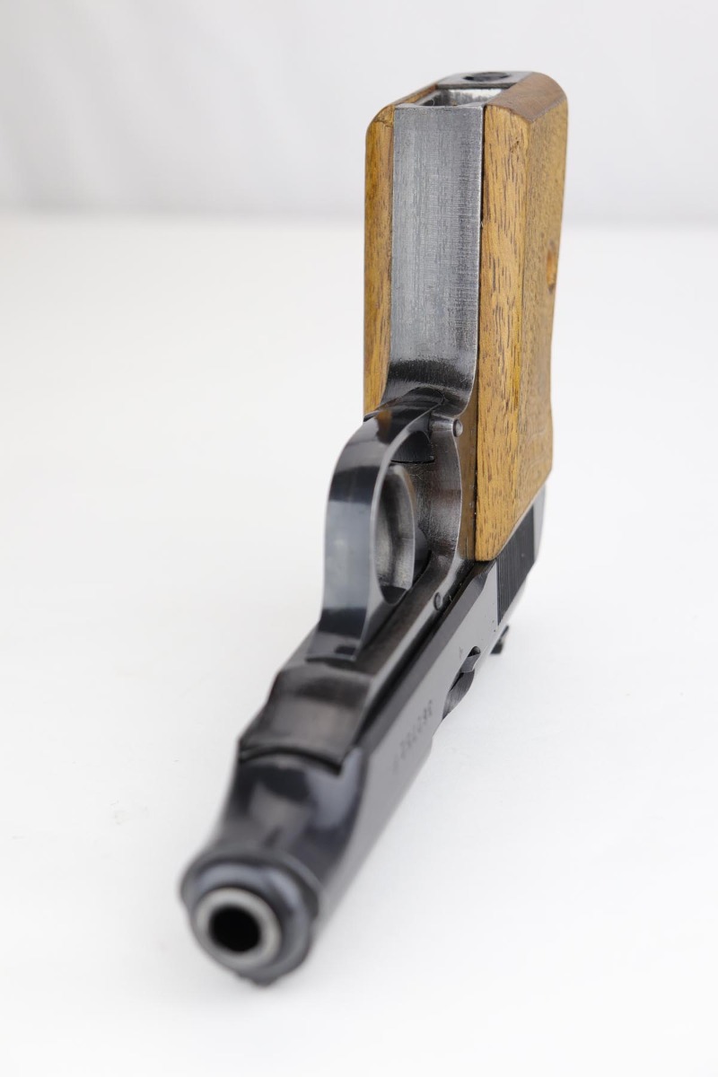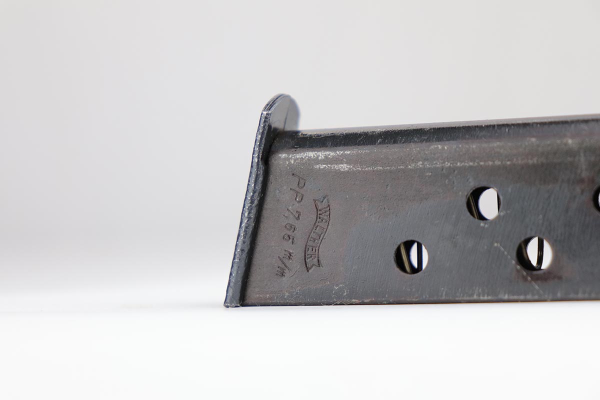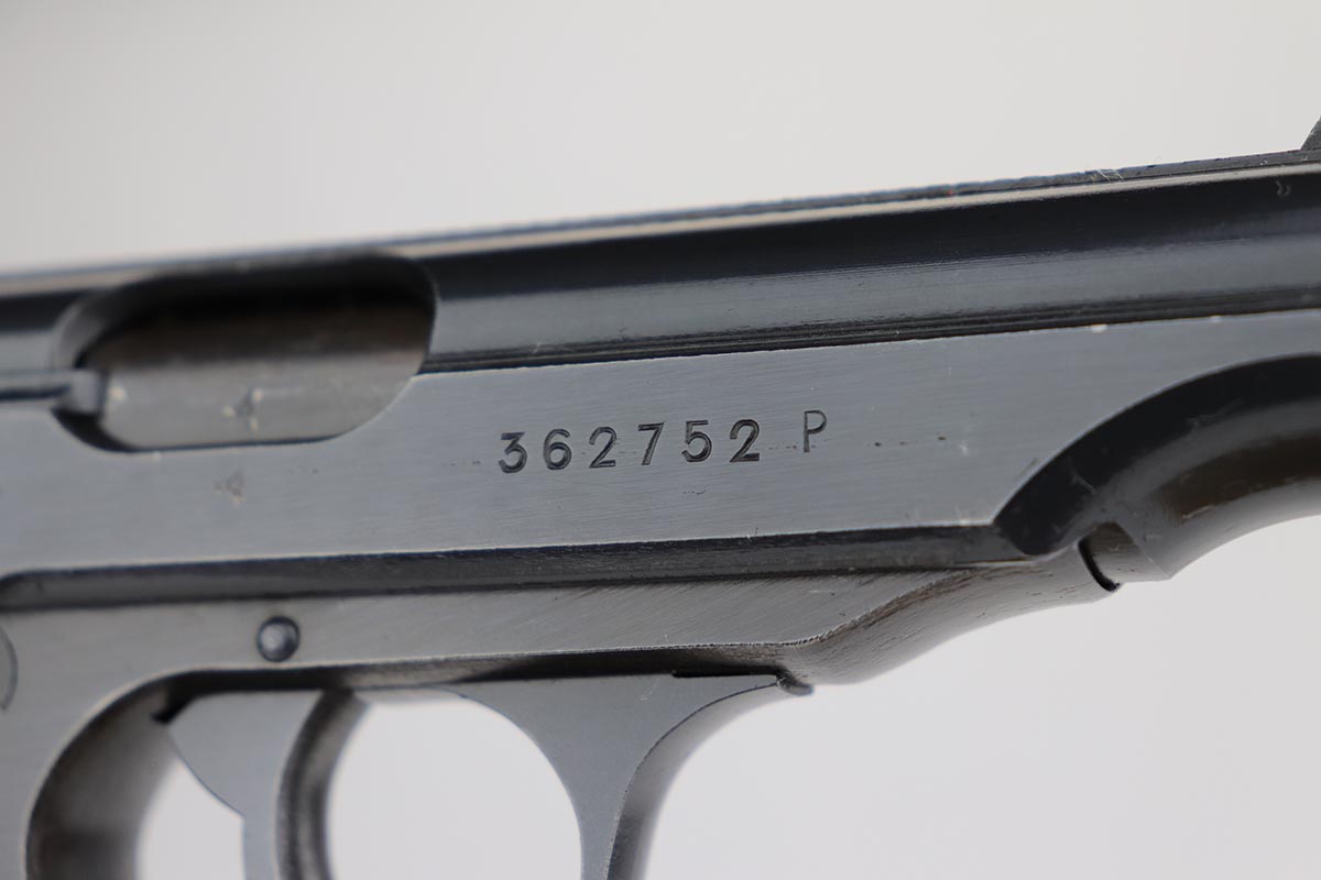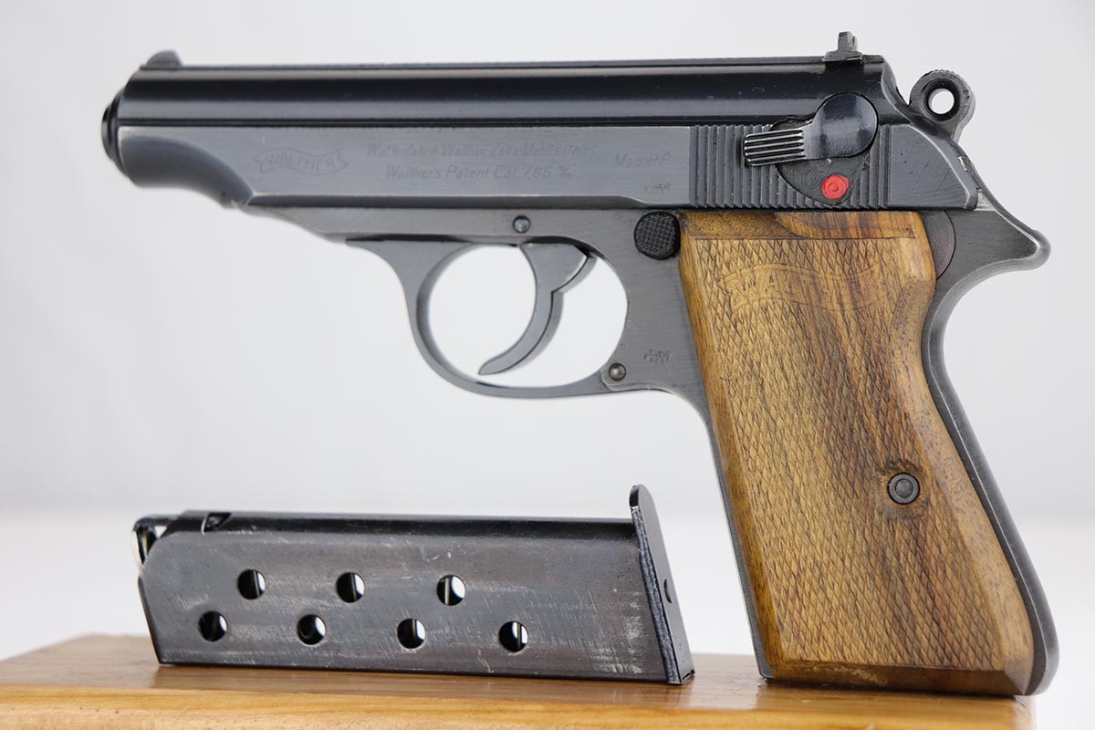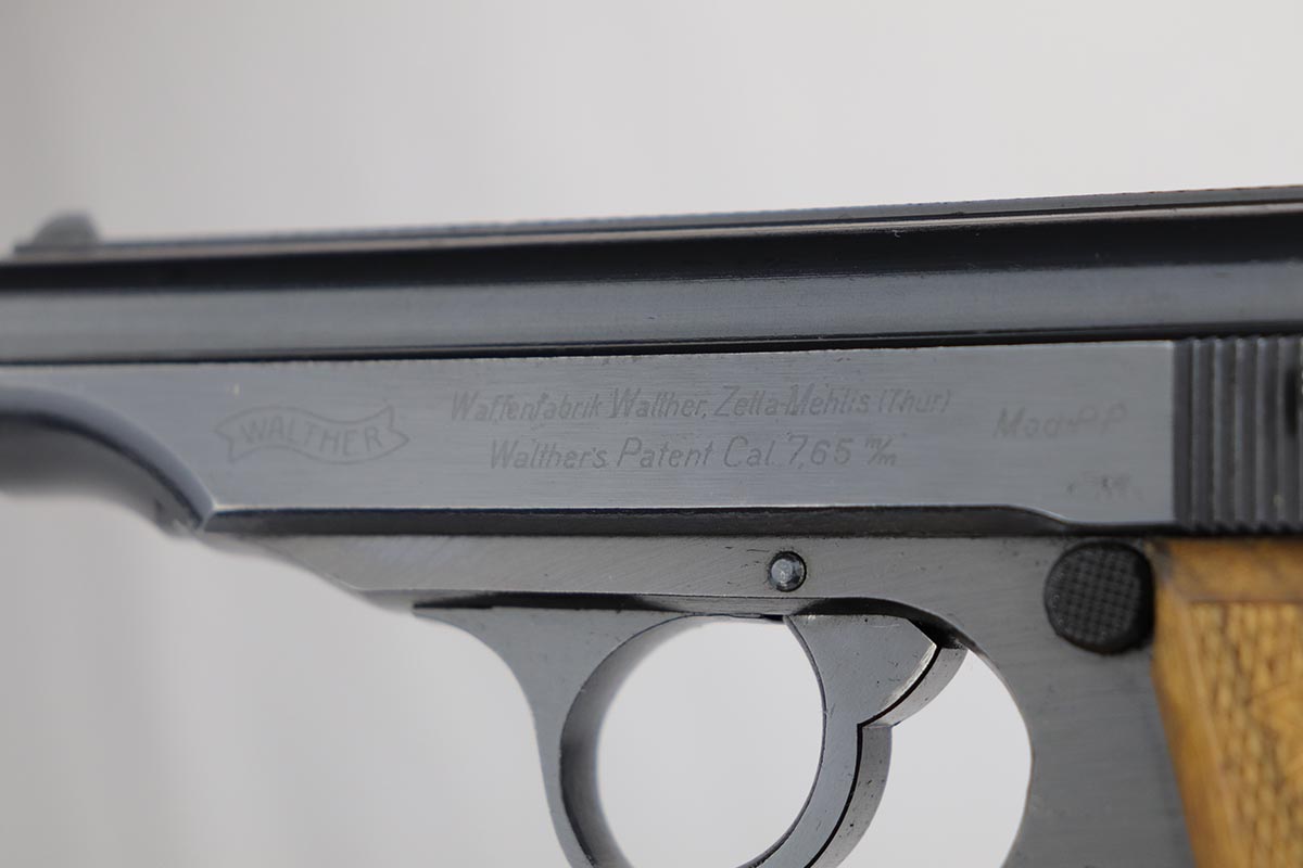10/24/19 – This is a near-mint Walther PP that was manufactured in 1944 for the Nazi Army. The original blue rates at 98-99% with a mint profile but very minor thinning/patination of the straps. Mint bore. Excellent wood grips. Wartime magazine.