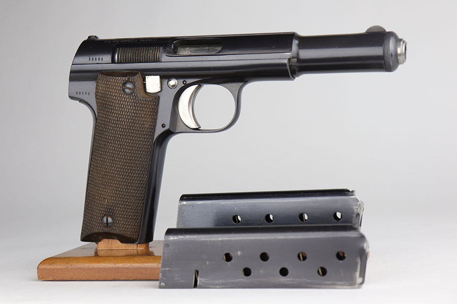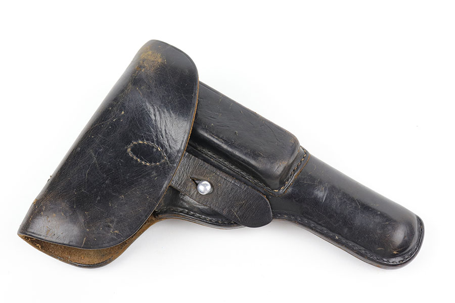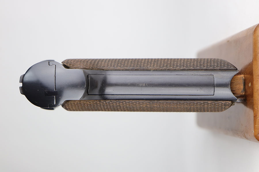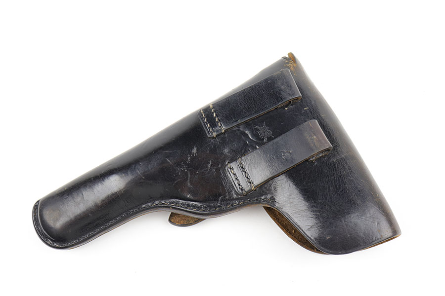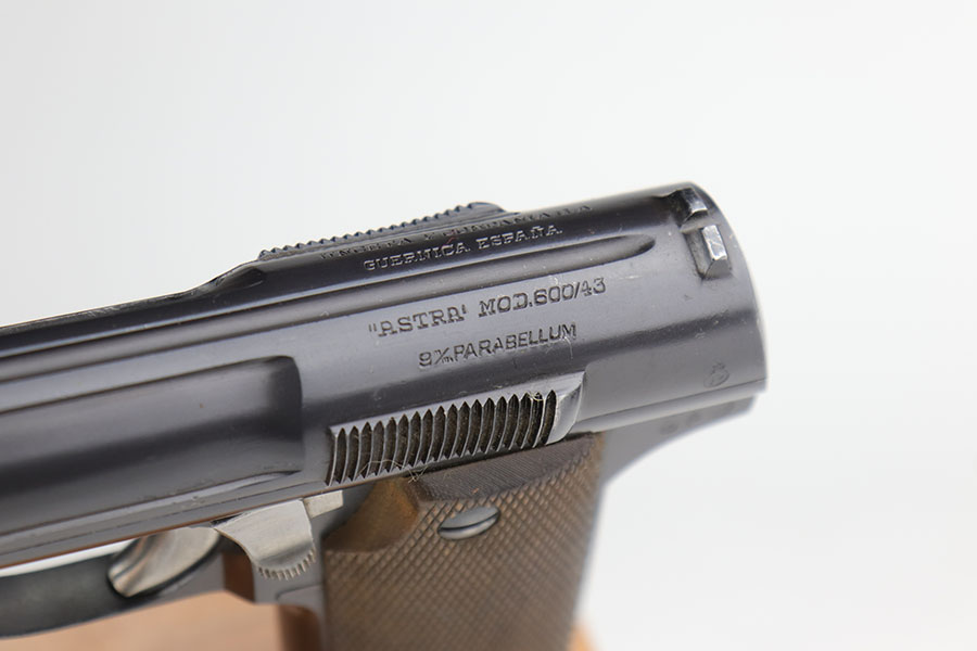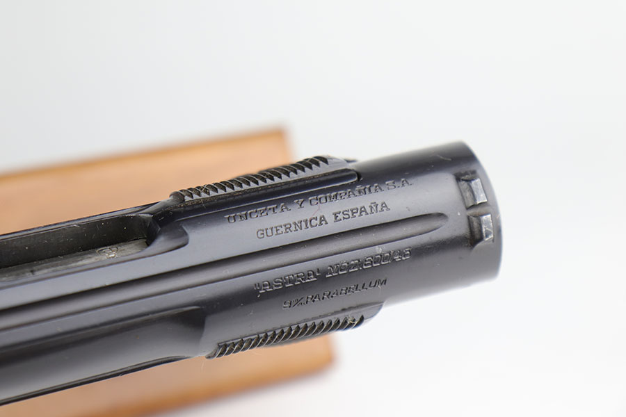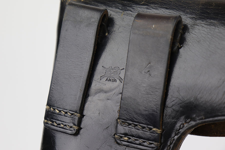 10/5/20 – This is a minty and complete Astra 600/43 rig with holster and spare magazine. This gun was made post-Nazi contract and is all original with 99% blue remaining. Minty bore and grips. Both magazines are original with Astra maker mark on base. The holster is Akah marked on the back and in great condition with no majro defects.