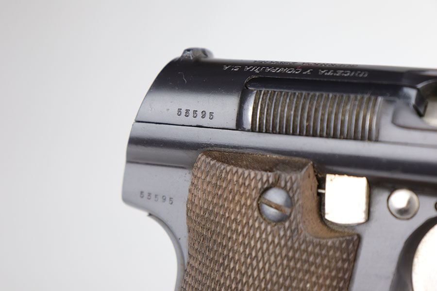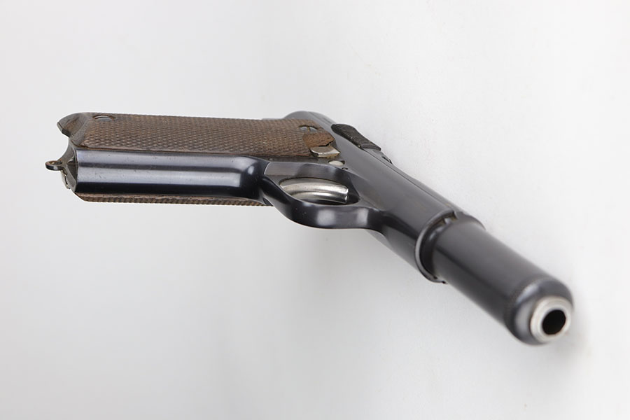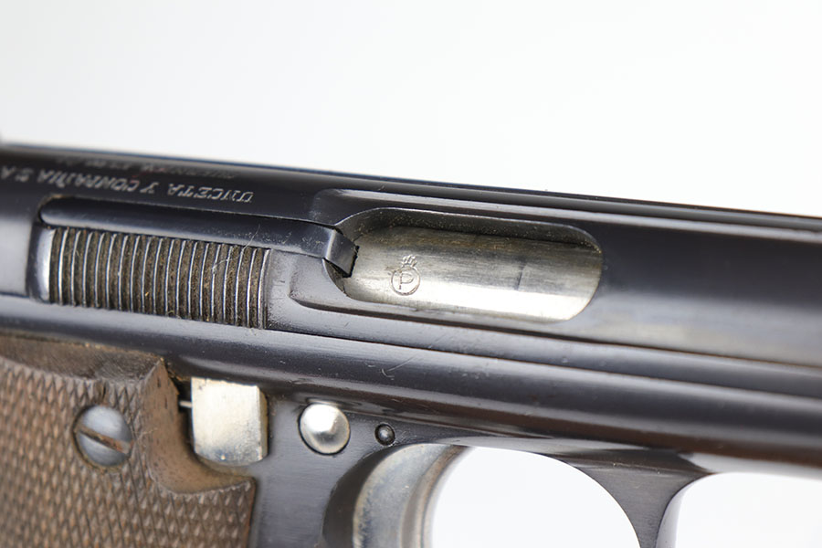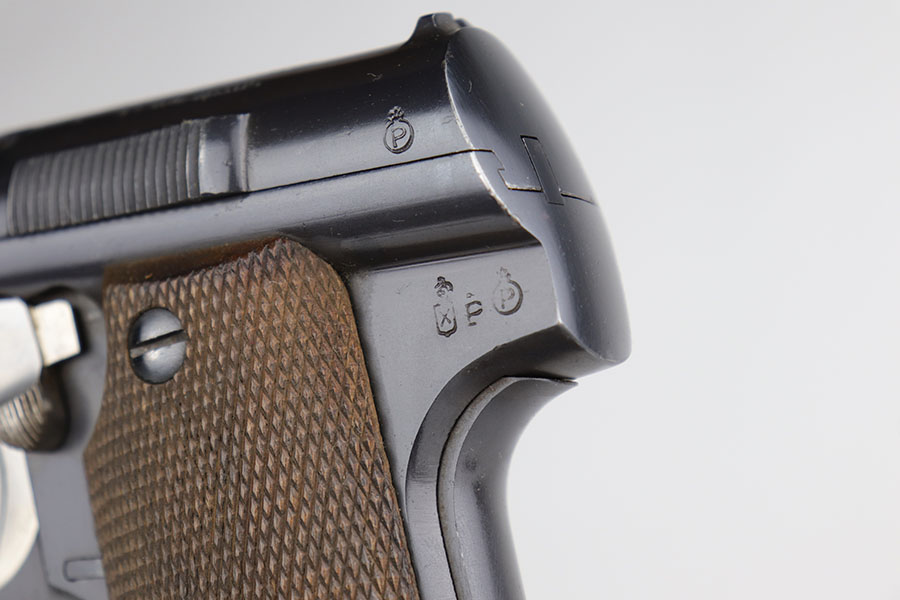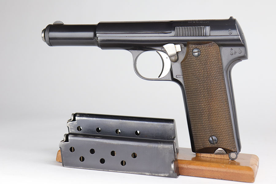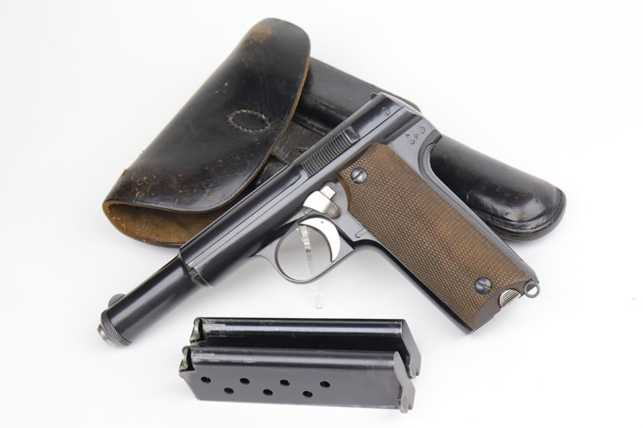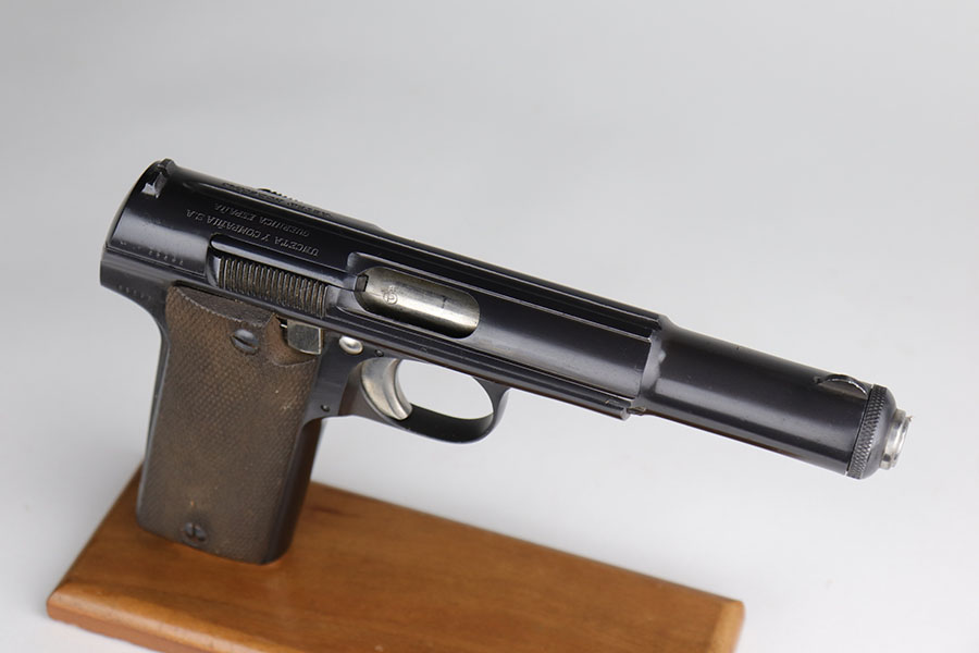 10/5/20 – This is a minty and complete Astra 600/43 rig with holster and spare magazine. This gun was made post-Nazi contract and is all original with 99% blue remaining. Minty bore and grips. Both magazines are original with Astra maker mark on base. The holster is Akah marked on the back and in great condition with no majro defects.