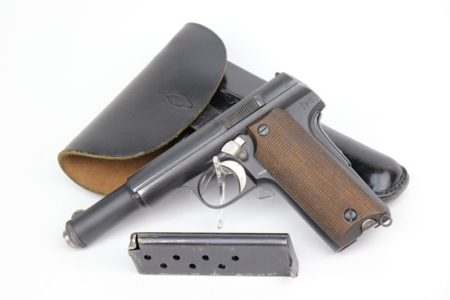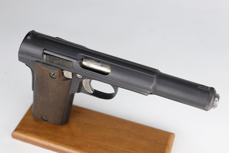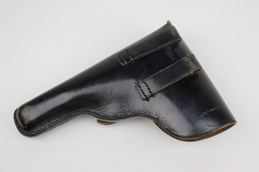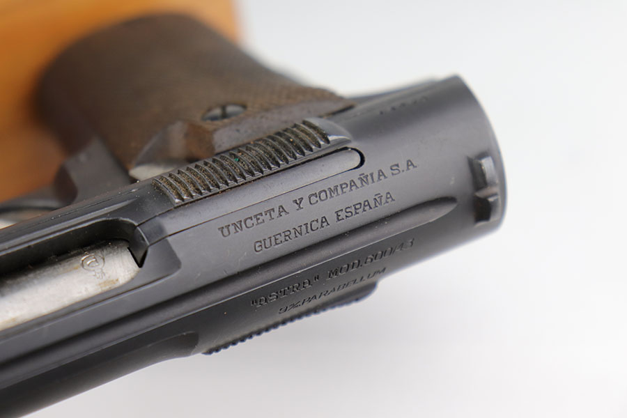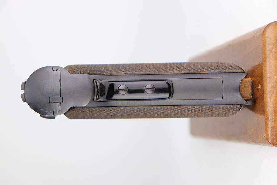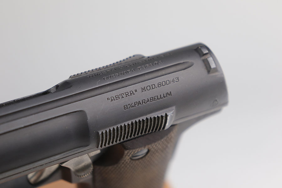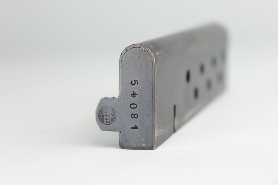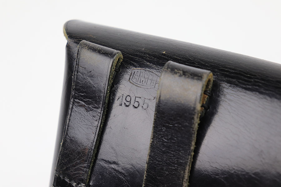 12/10/20 – This is a minty example of an Astra Model 600/43 Rig. The gun is all matching and has retained more than 98% of its matte finish. There is just a hint of wear on some of the high edges and some minor surface marks here and there. It has excellent wood grips and comes with one original matching-numbered magazine. The rig also comes with an excellent 1955-dated black leather holster. The bore is minty.