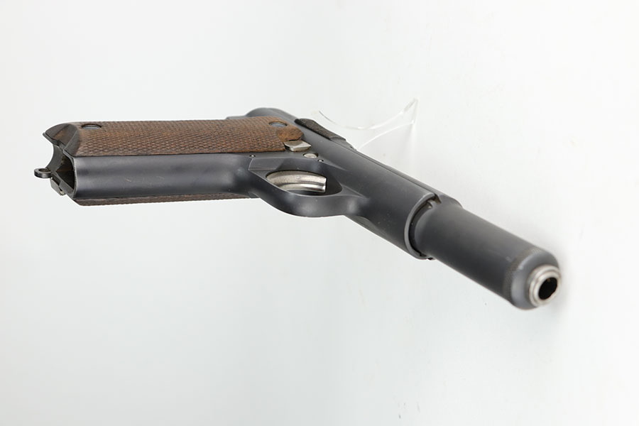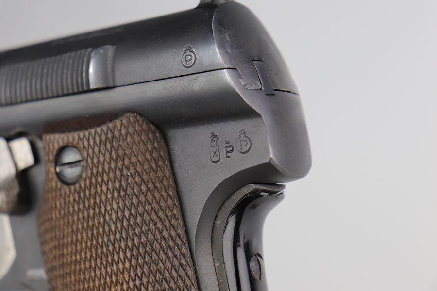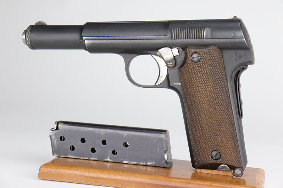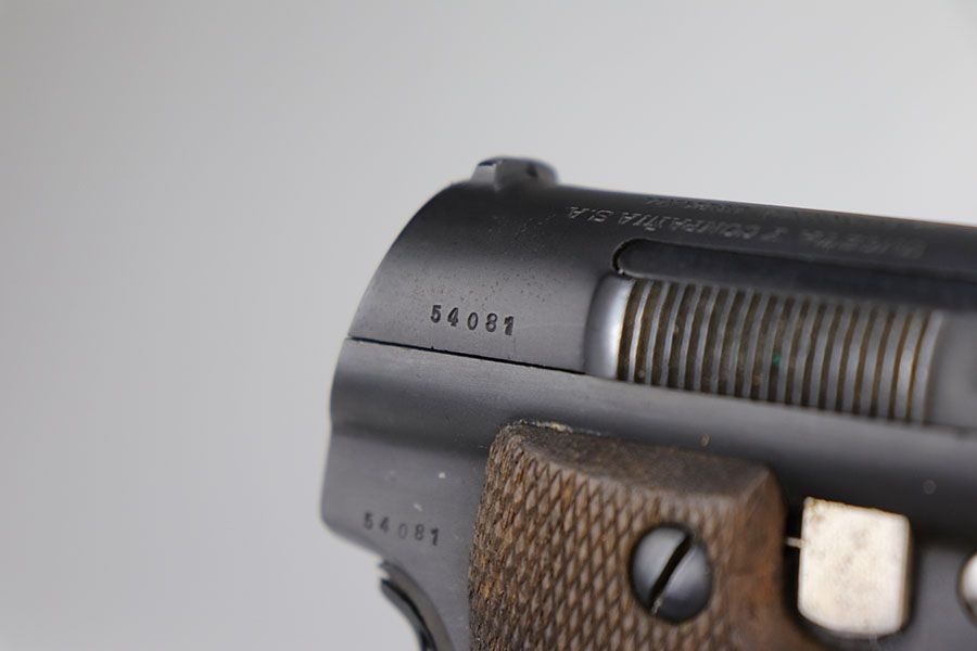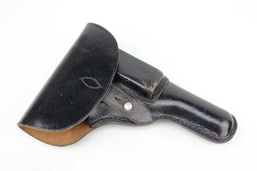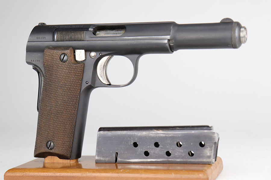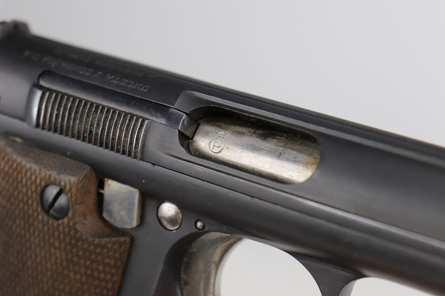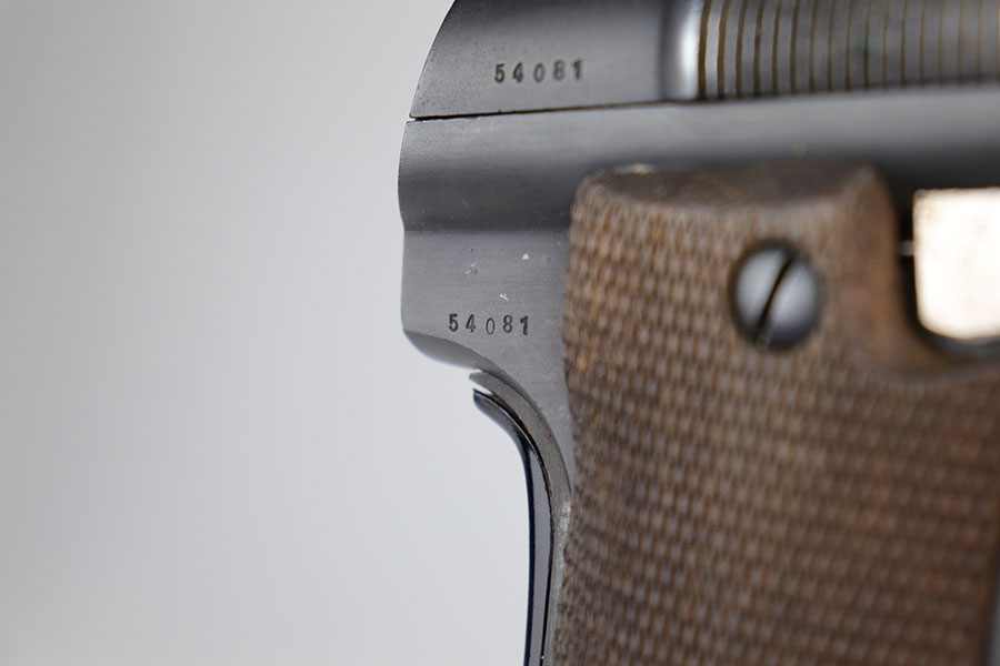 12/10/20 – This is a minty example of an Astra Model 600/43 Rig. The gun is all matching and has retained more than 98% of its matte finish. There is just a hint of wear on some of the high edges and some minor surface marks here and there. It has excellent wood grips and comes with one original matching-numbered magazine. The rig also comes with an excellent 1955-dated black leather holster. The bore is minty.