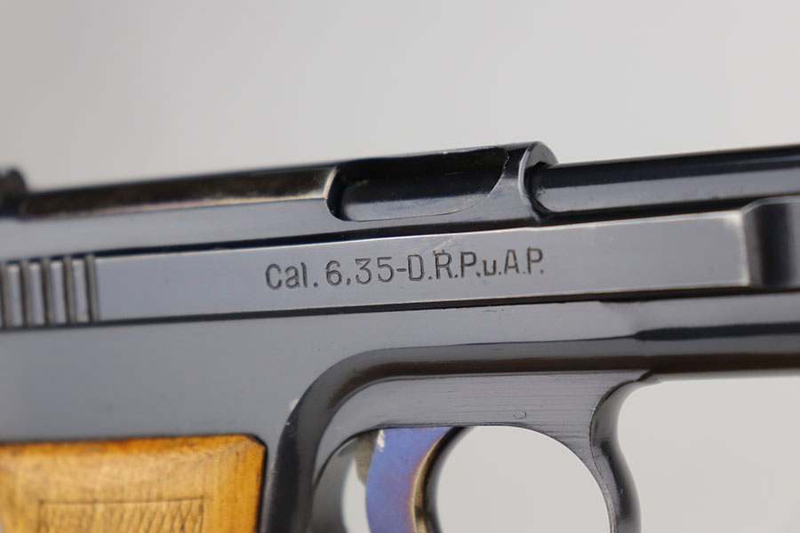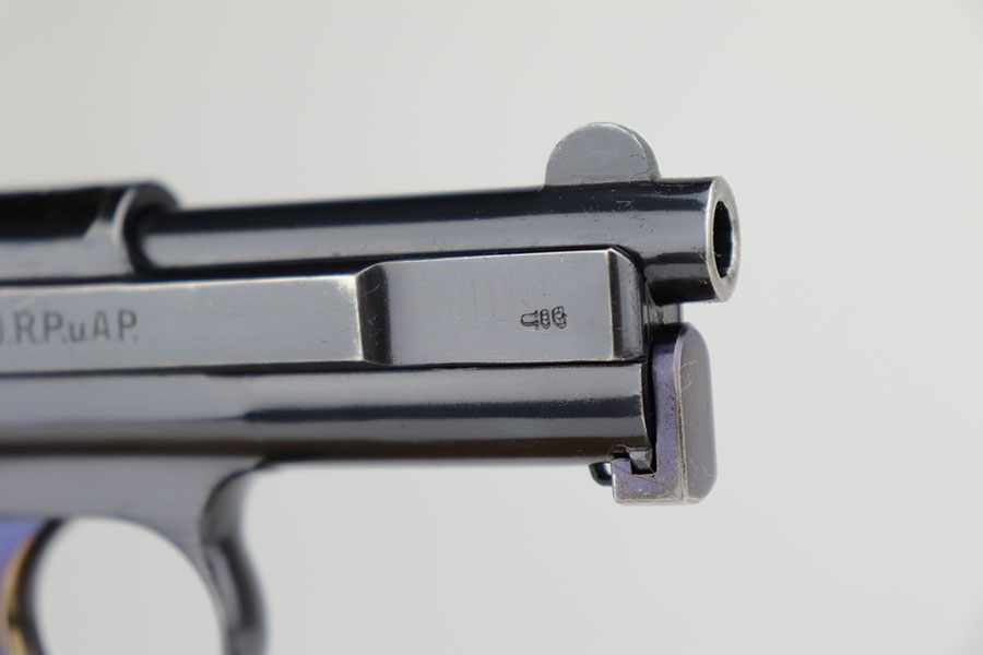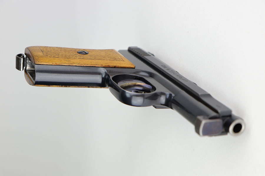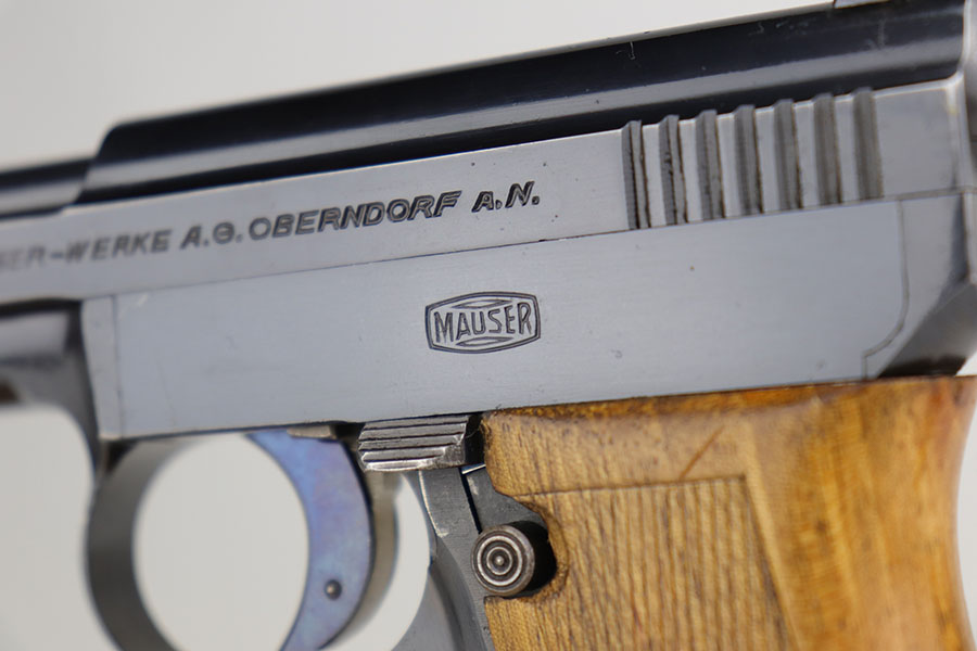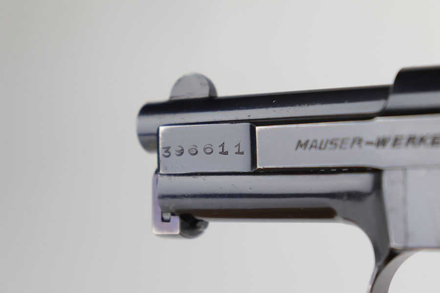 10/28/20 – This is a near-mint Mauser Model 1934 Transitional model, made some time in the 1920s. Also called the third variant new model, it’s chambered for 6.35mm and new features include the right side is marked ‘Cal. 6.35-D.R.P.u.A.P.’ and serrations on the magazine release. It has 98-99% of the original blue, and has a mint bore. Excellent grip aside from a set of numbers lightly imprinted on the left side bottom. Beautiful fire blue on small parts. Crown/U proofs.