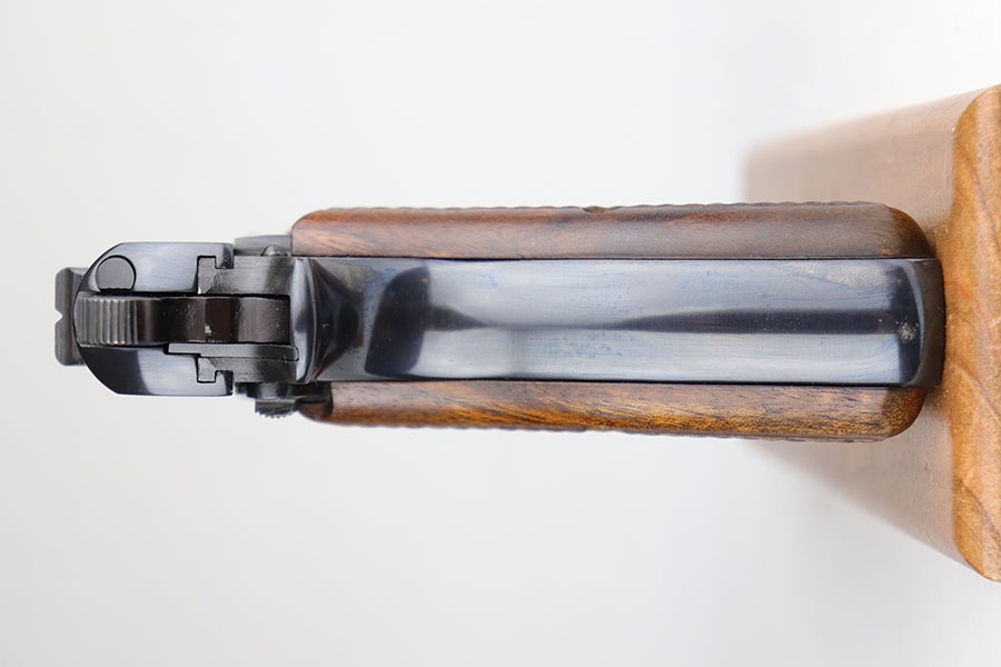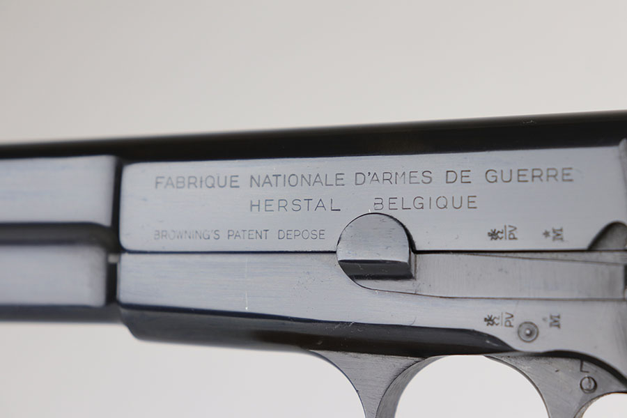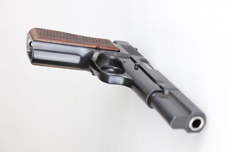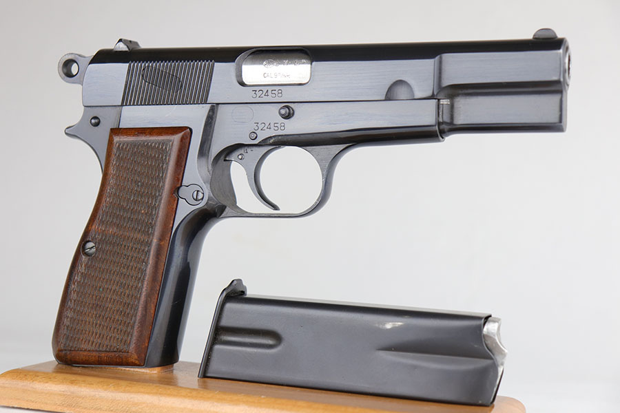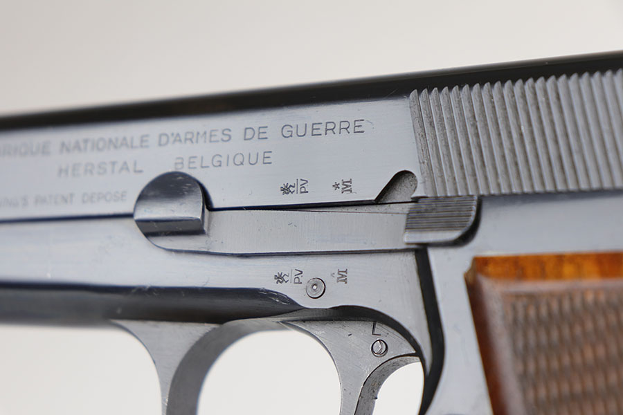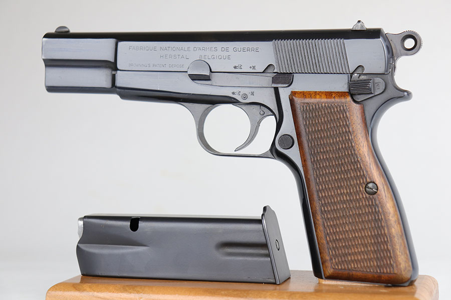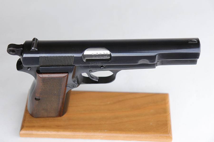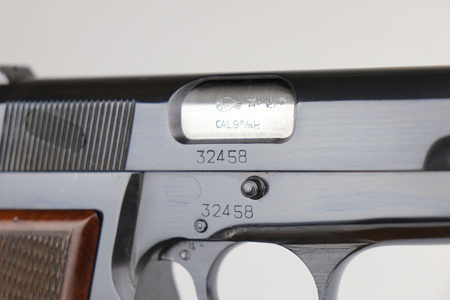 7/10/20 – This is a near-mint FN High Power made postwar for the Belgian commercial market. It has 98-99% of the original blue with a bit of muzzle wear and a couple of minuscule wear spots on the straps. Mint bore and grips. Liege proofs on slide, frame and barrel. NOTE: This pistol is missing the mag safety, so the hammer can be dropped with the magazine out of the gun.