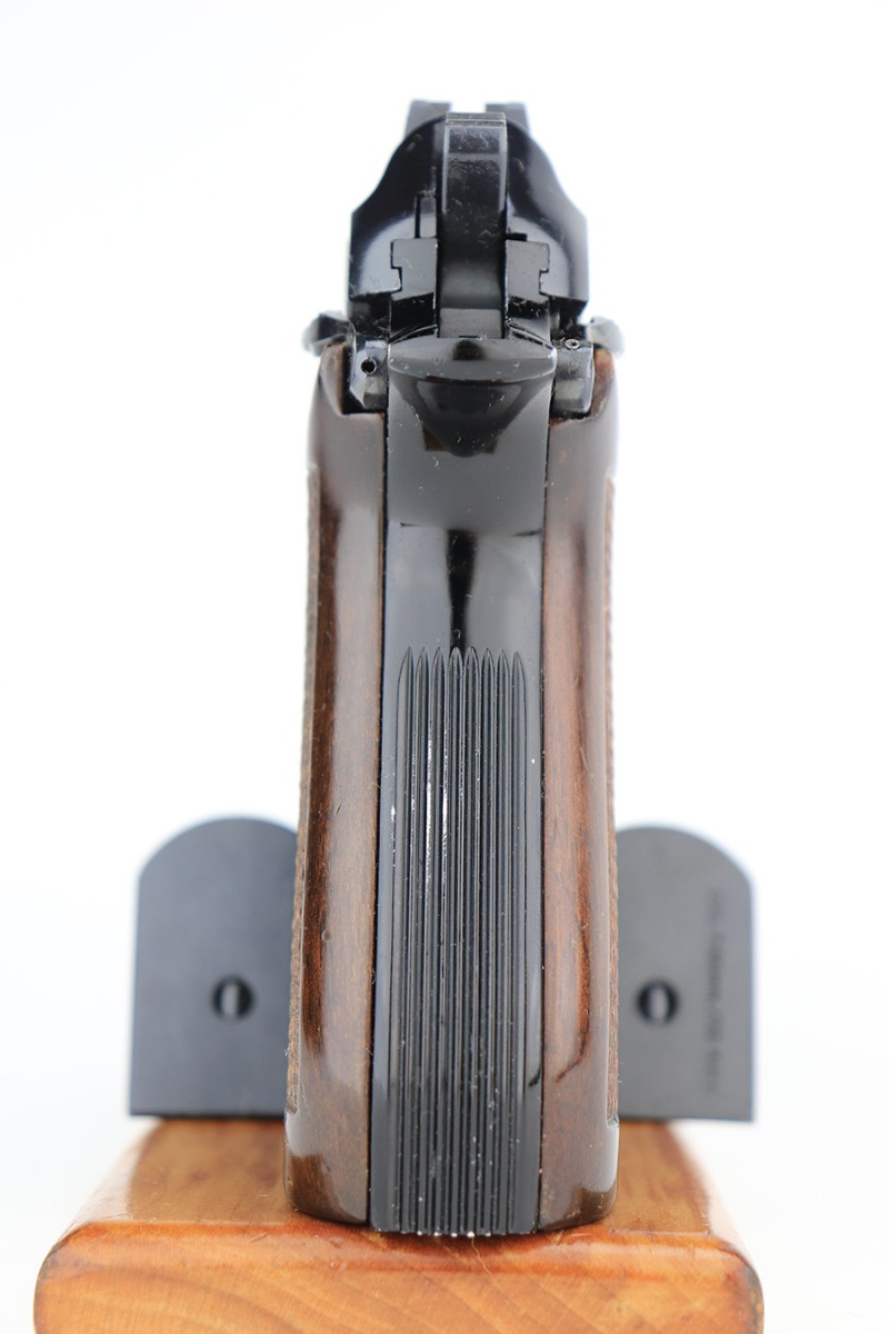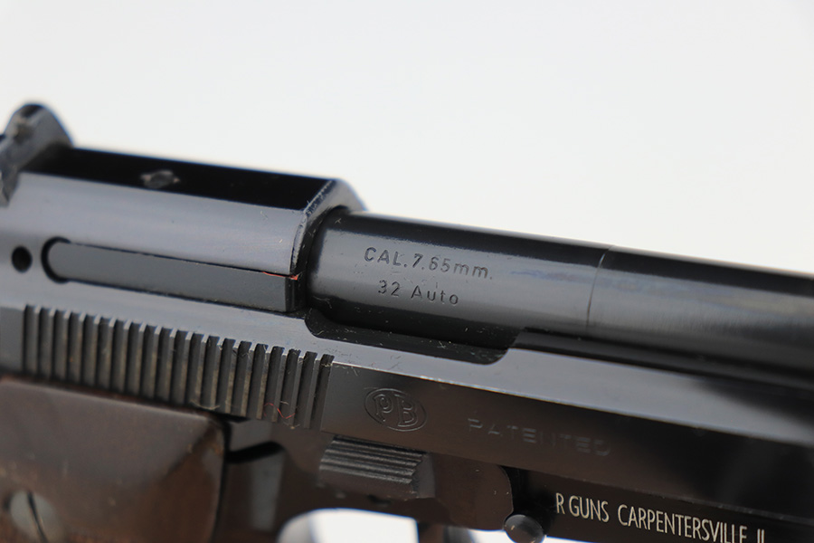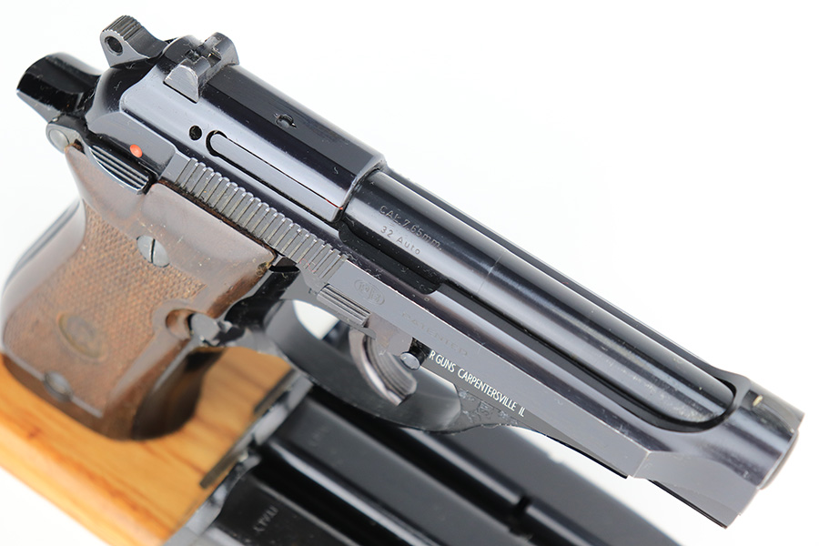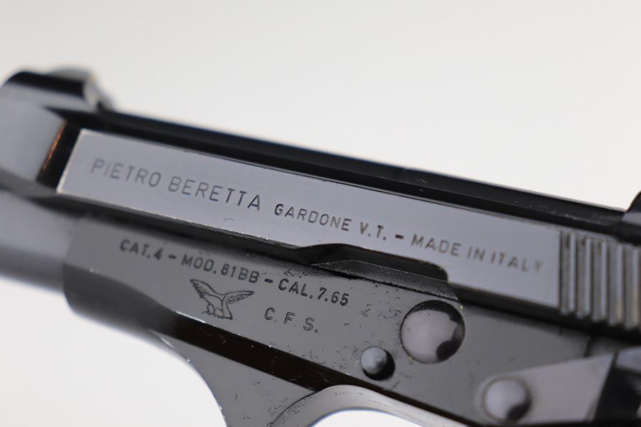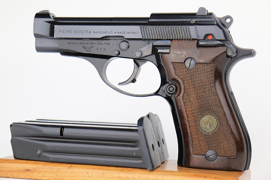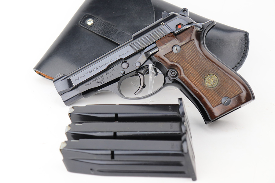 3/27/23 – This is a minty example of a Beretta Model 81BB, manufactured in 1987 and chambered in 7.65mm or .32 ACP. There is an Italian government Eagle marking on the left side of the frame and an import mark on the right side. It comes as a rig with an un-issued black leather holster and three magazines. This particular gun has retained nearly all of its original high polish finish with a few tiny handling marks here and there. Fitted with nice wood grips – minor scuffing on both sides. Minty bore.